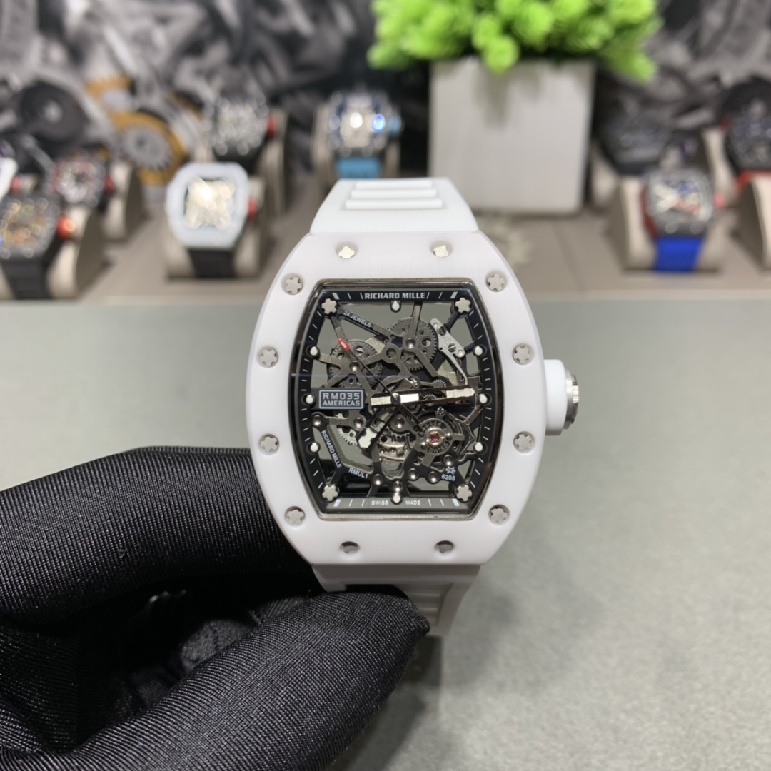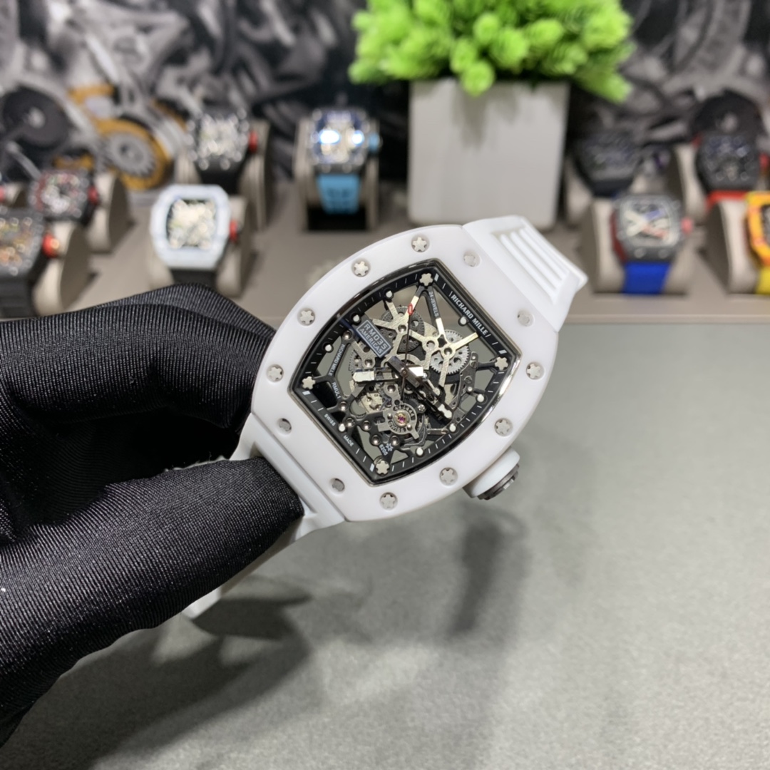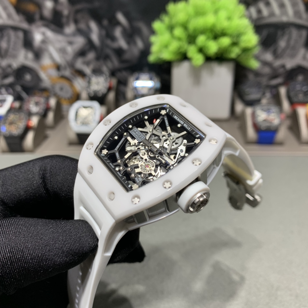 Richard Miller RM-035: Full skeleton, 3-part case with Korean ceramic bezel, 316 steel middle case, automatic movement, 50x42mm.