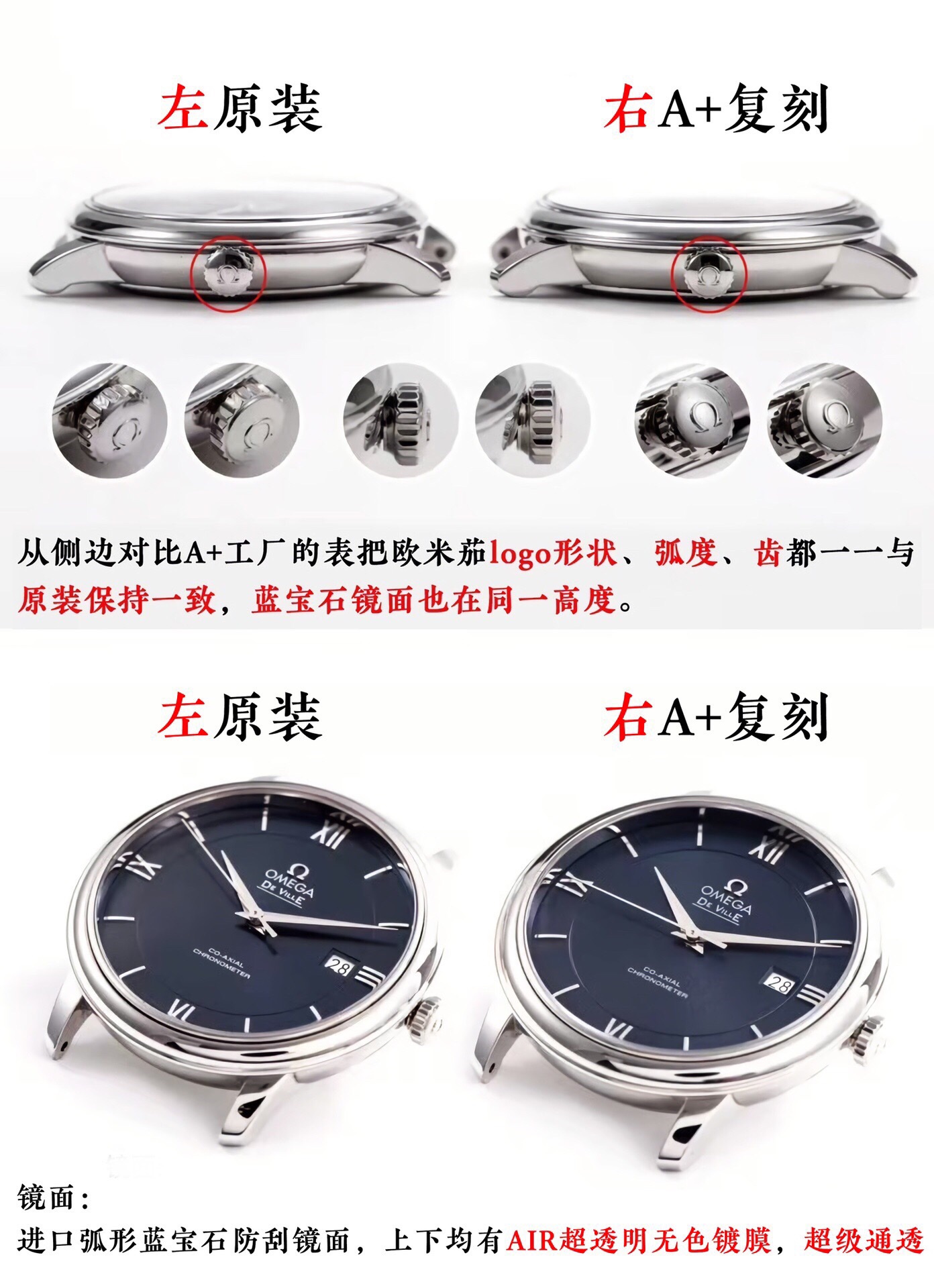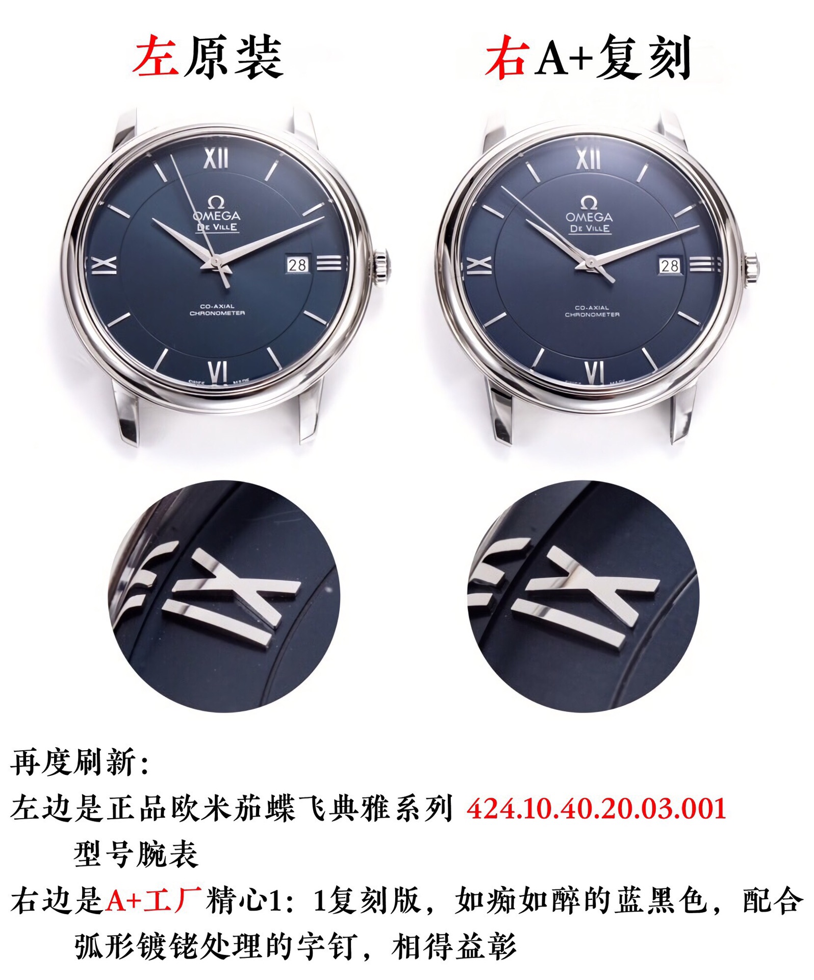A+ Factory Omega De Ville 39.5mm V2 upgraded. 1:1 replica with genuine parts compatibility. Sapphire crystal, sunburst dial, Seagull 2892 movement. Leather/steel strap options. Top-tier craftsmanship.
