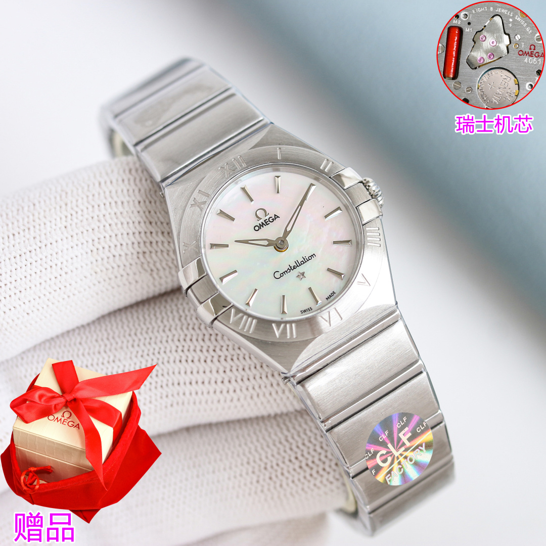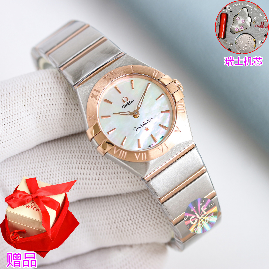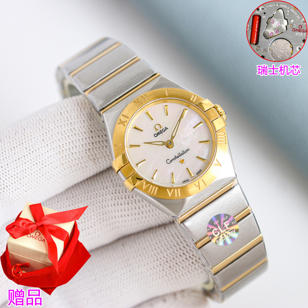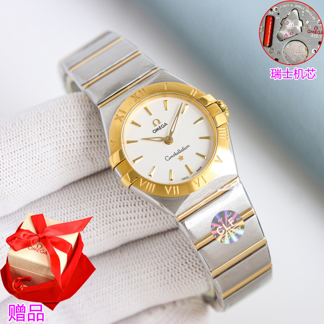 CLF Omega Constellation 28mm Swiss quartz watch. Slimmer claws, polished case, refined bezel with Roman numerals. Advanced dial colors, polished bracelet with adjustable butterfly clasp. Swiss movement for precision. Elegant, ladies' top choice.