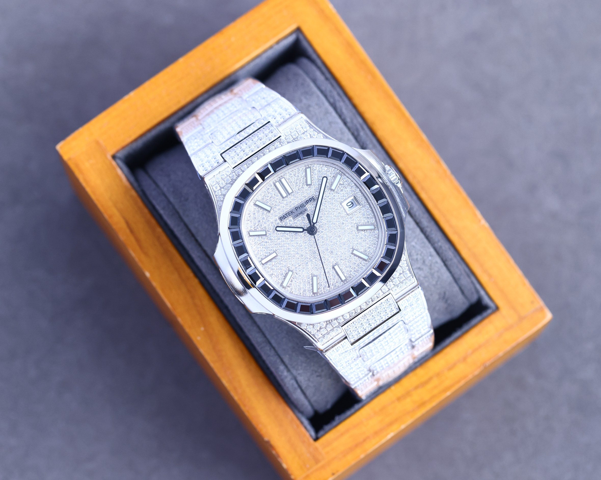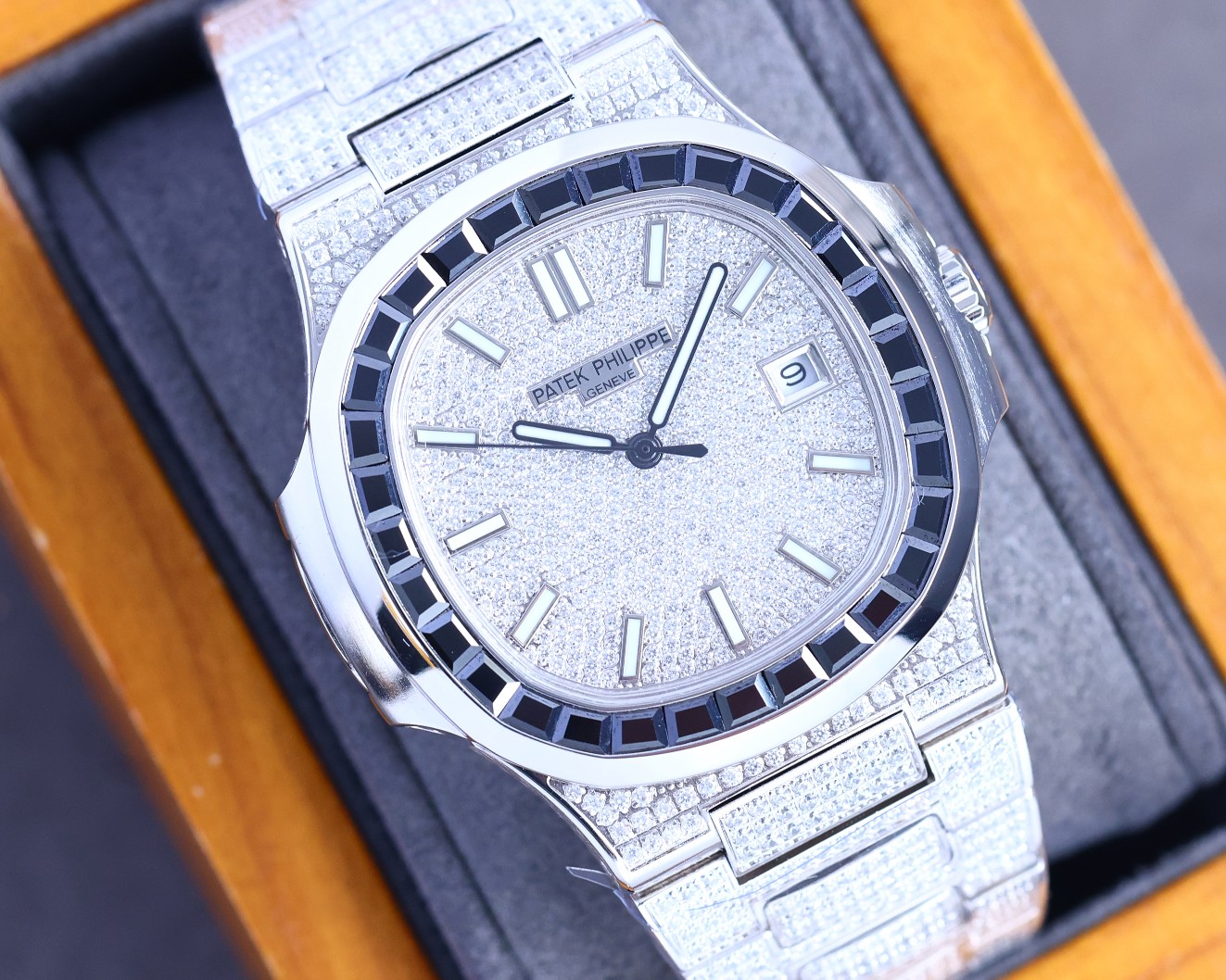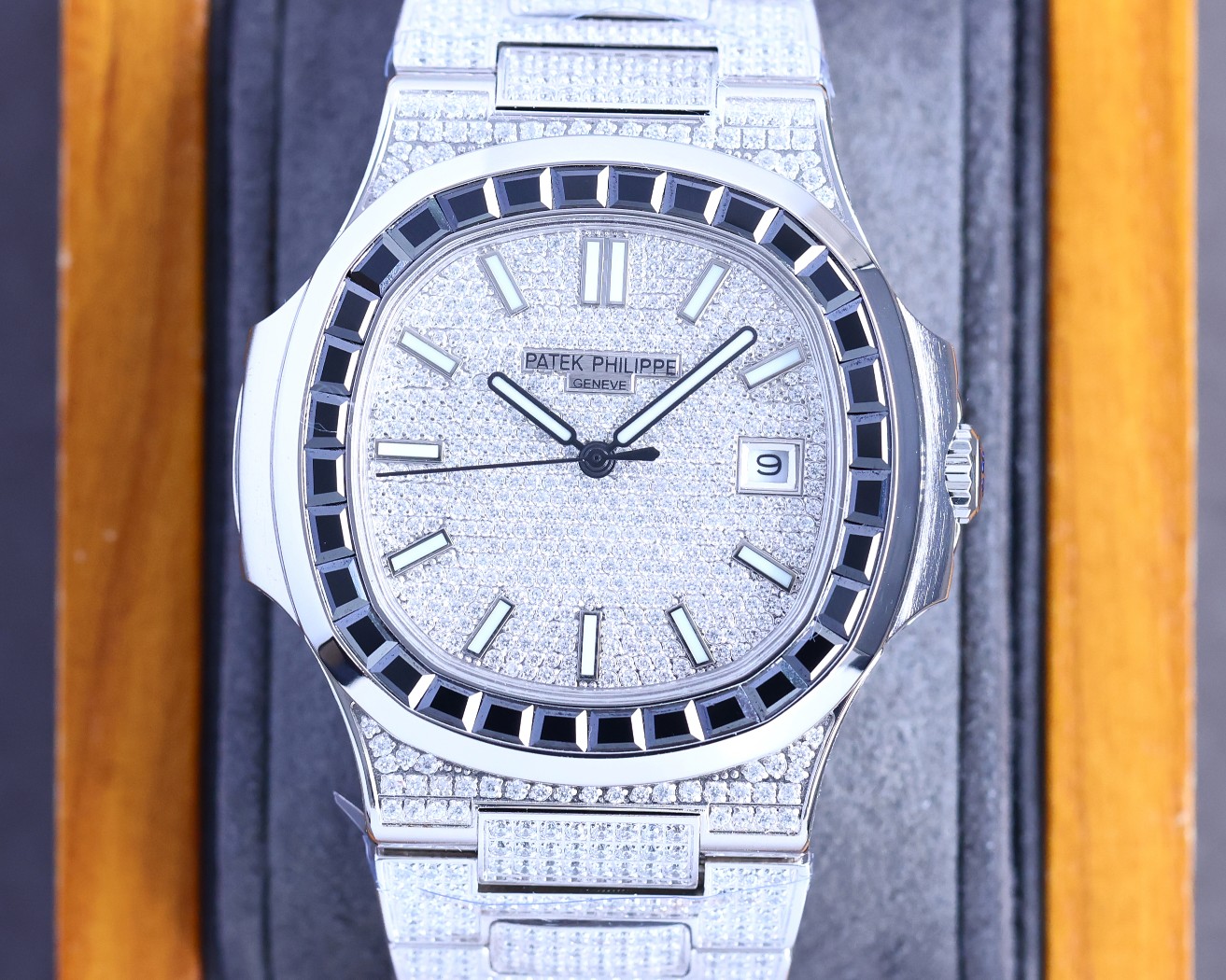 R Factory Patek Philippe Nautilus replica with diamond accents, upgraded movement, ergonomic bracelet, and original packaging.