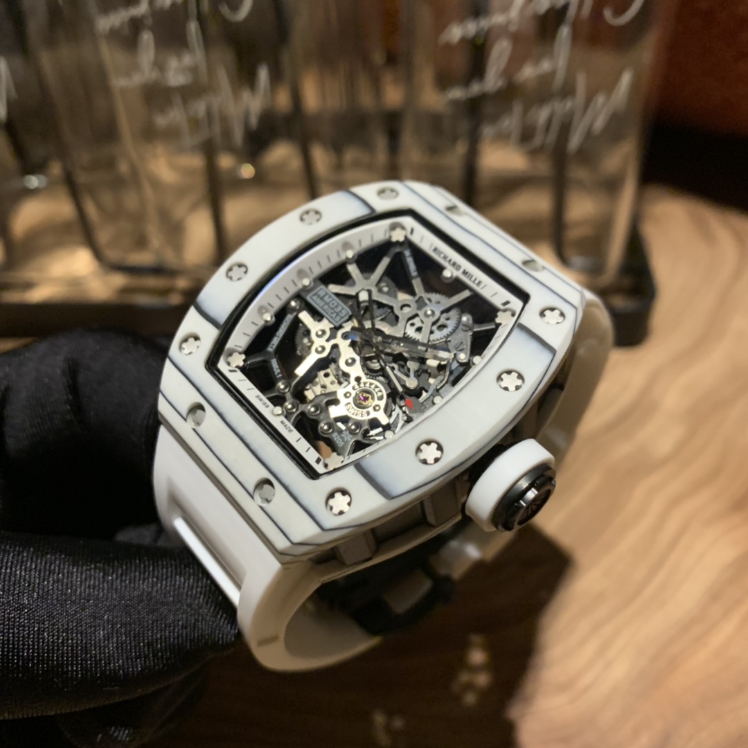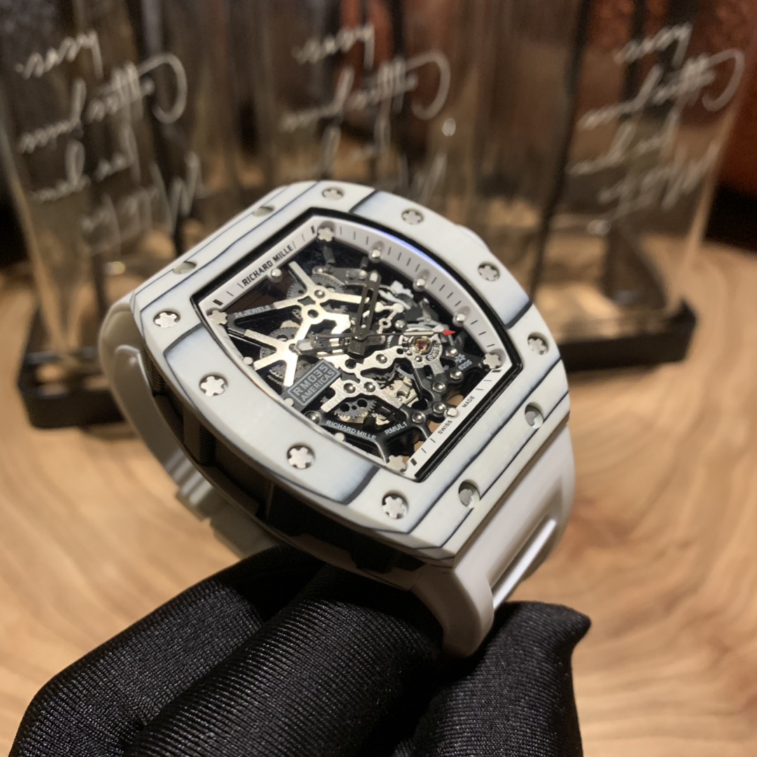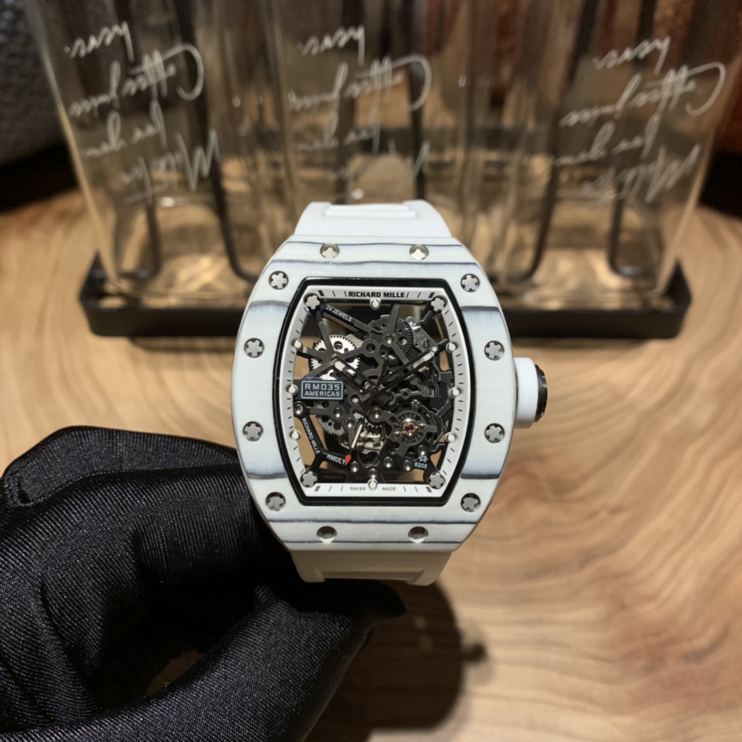 Richard Mille RM-035 skeleton watch with three-piece carbon fiber case, 316 steel mid-case, automatic movement, 50x42mm.