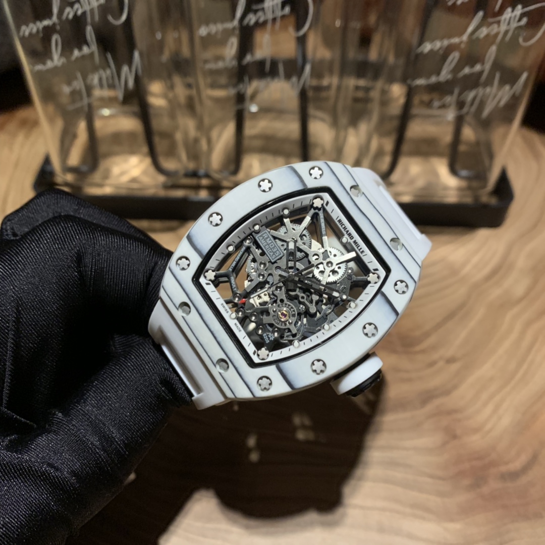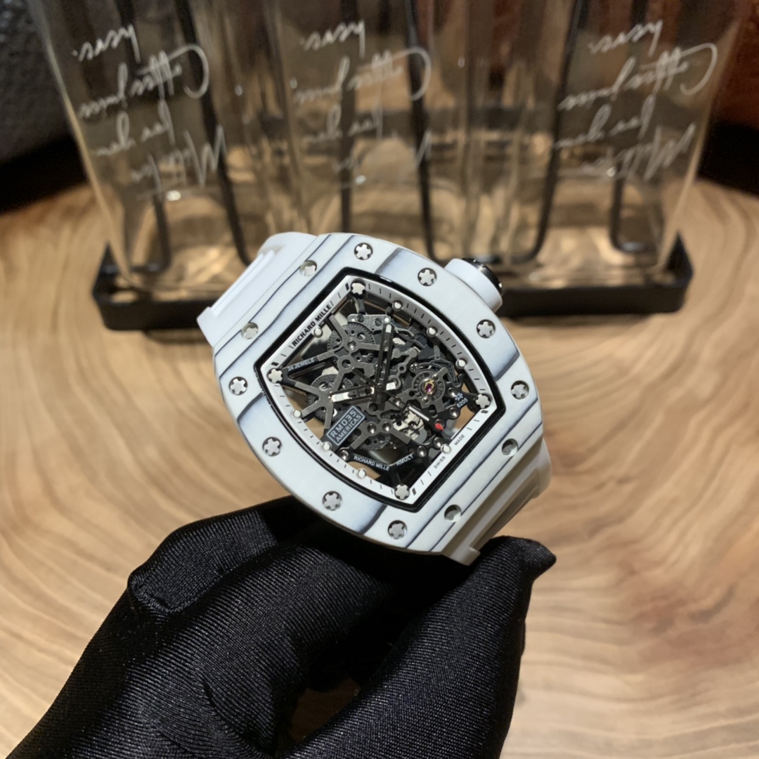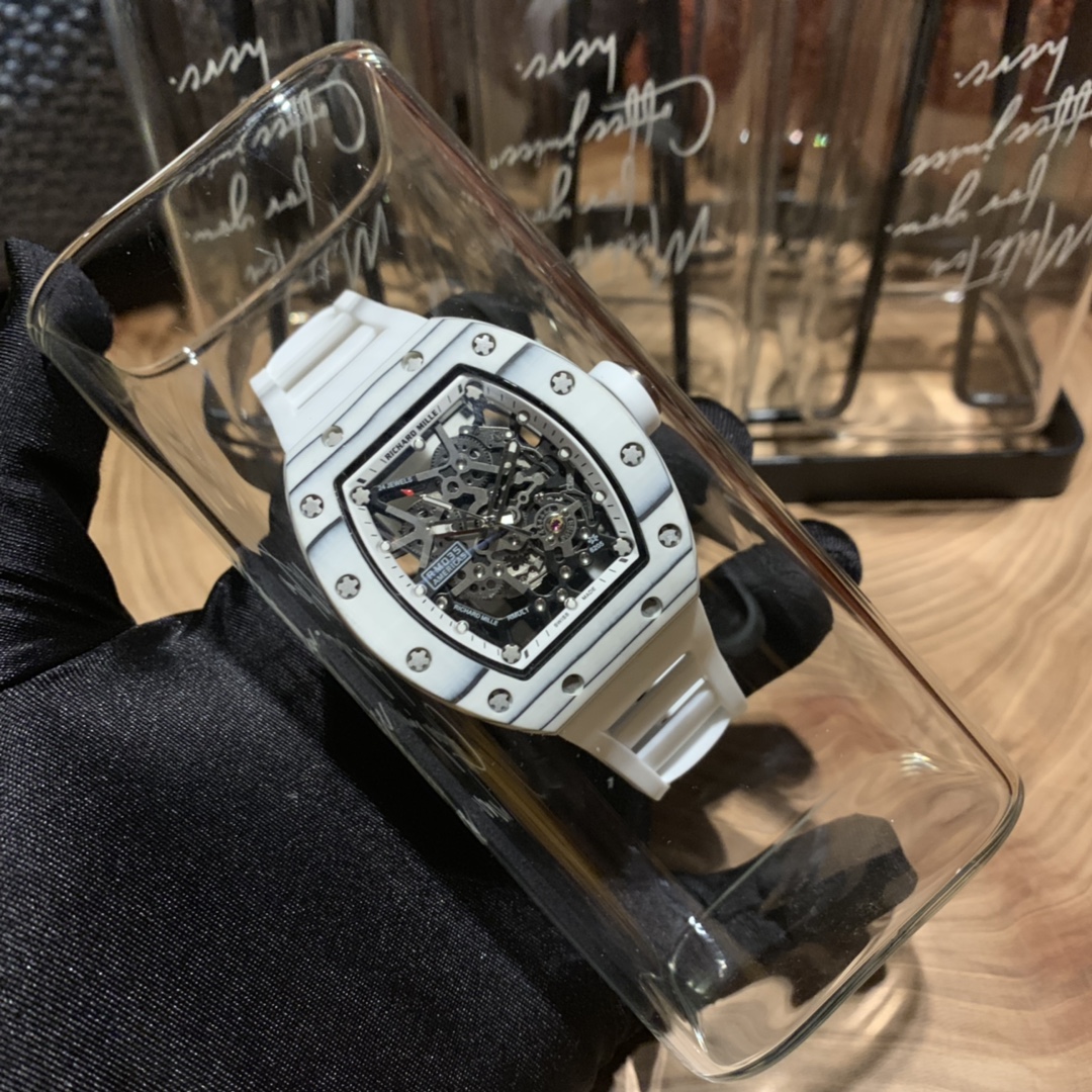 Richard Mille RM-035 skeleton watch with three-piece carbon fiber case, 316 steel mid-case, automatic movement, 50x42mm.