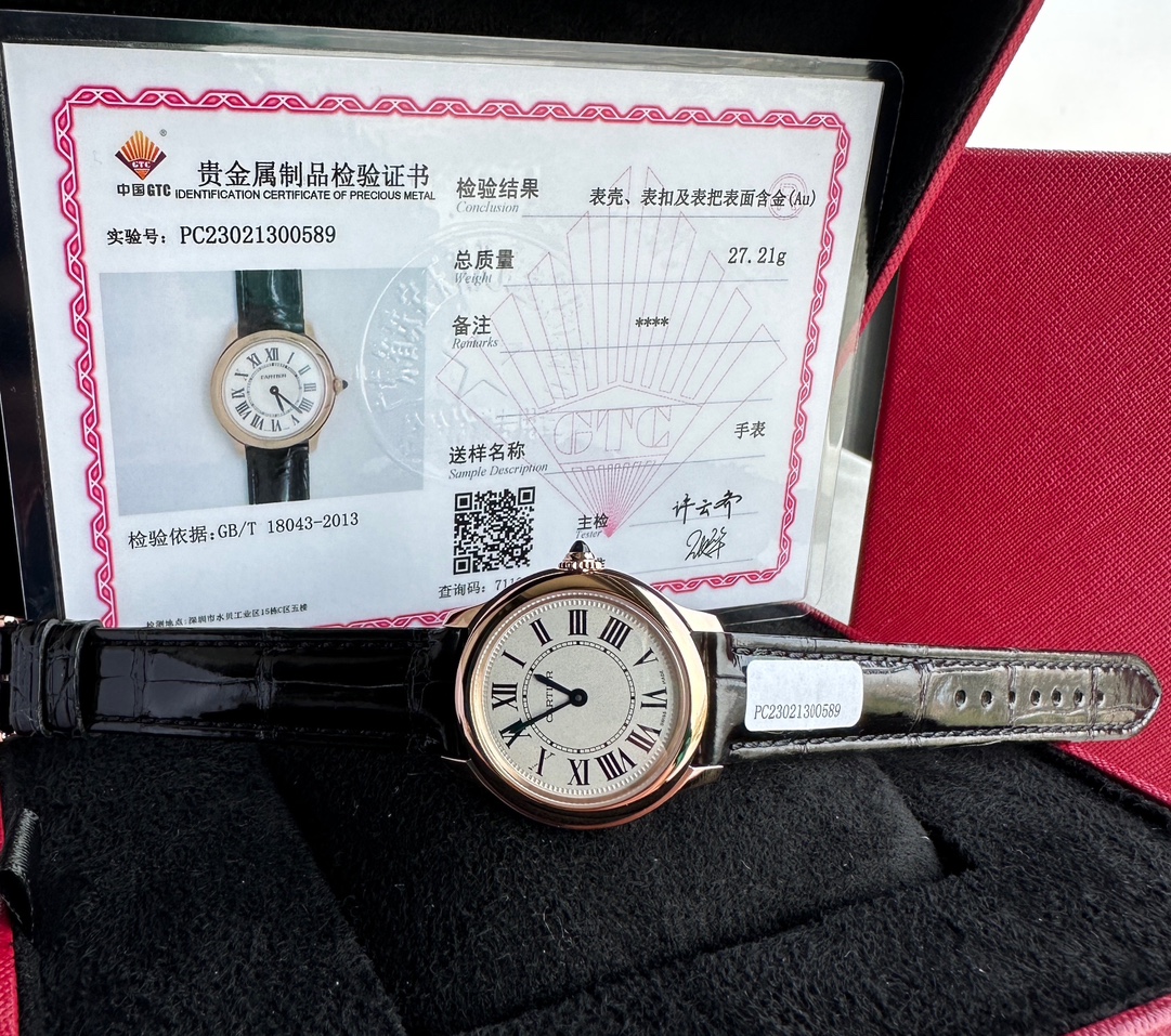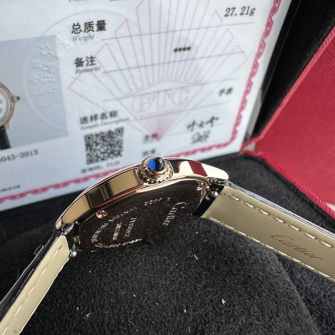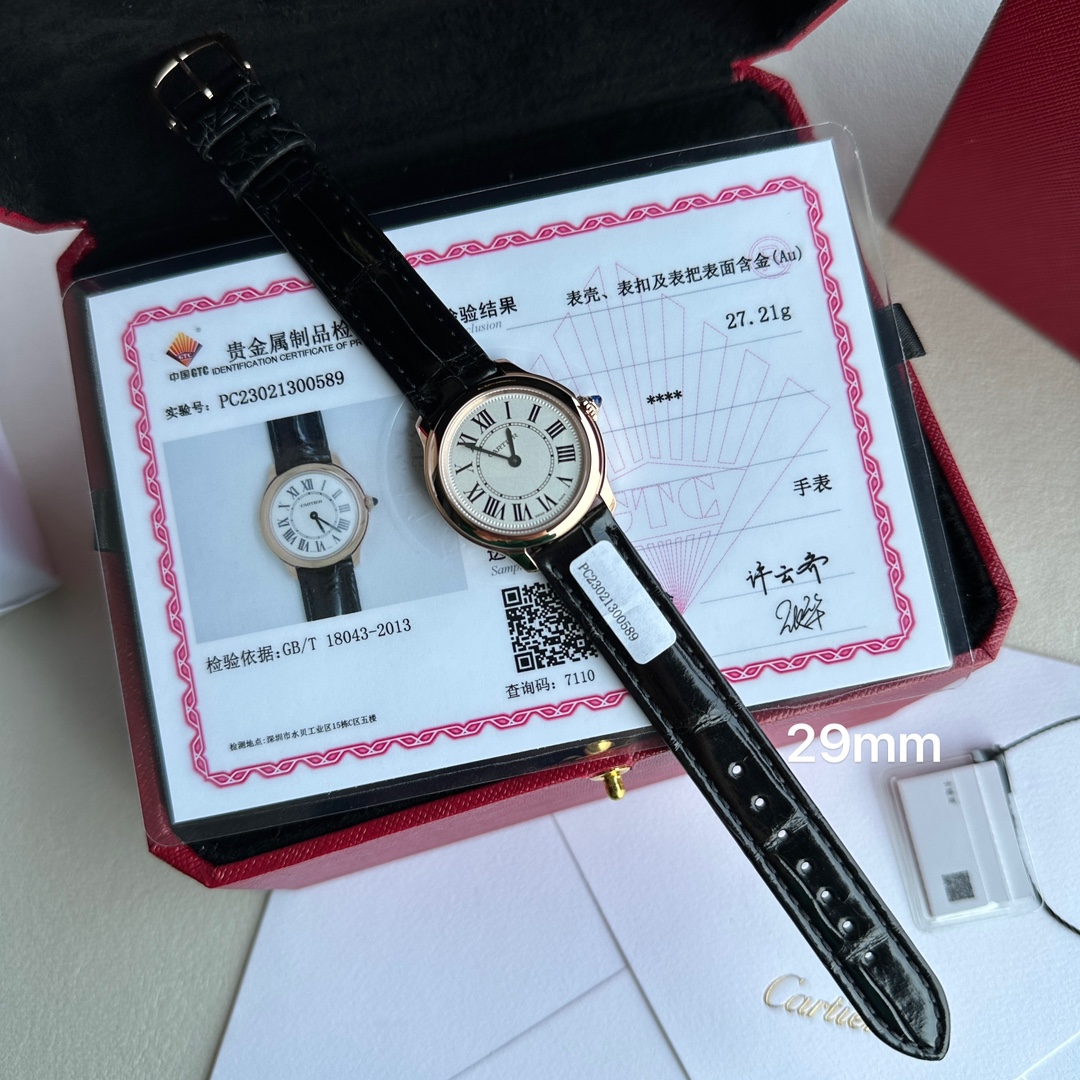 Genuine Cartier 18k gold-plated watch with GTC certification. Swiss quartz movement, Roman numeral dial, blue steel hands, sapphire crown. 29mm diameter, 7.54mm thickness. Black alligator strap, caliber 157. Flawless craftsmanship.