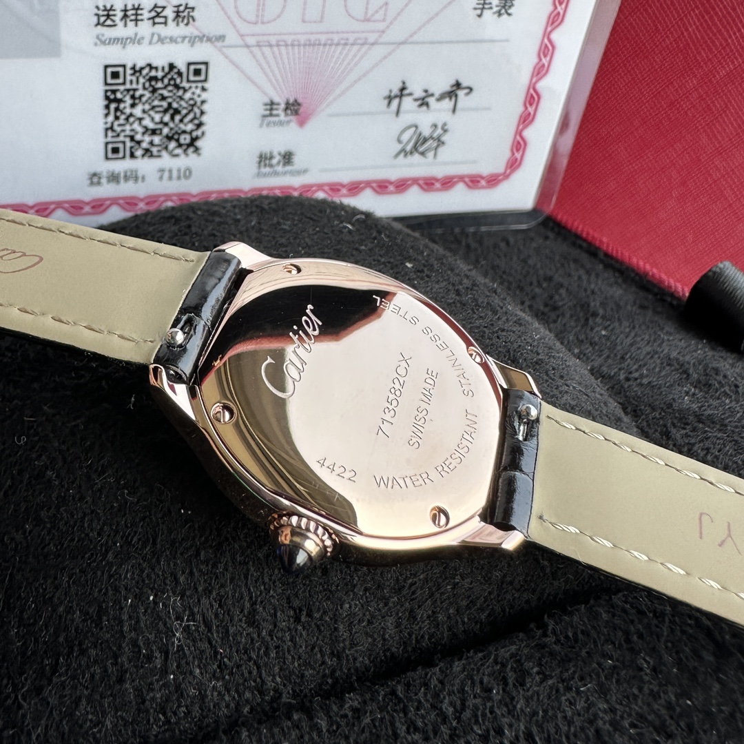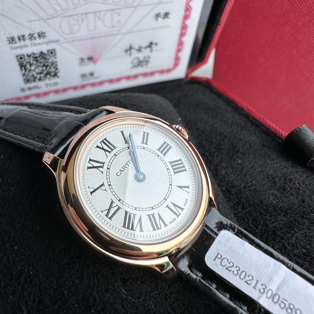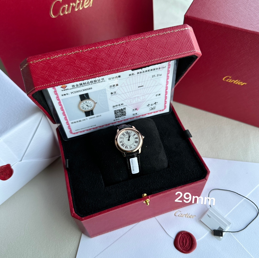 Genuine Cartier 18k gold-plated watch with GTC certification. Swiss quartz movement, Roman numeral dial, blue steel hands, sapphire crown. 29mm diameter, 7.54mm thickness. Black alligator strap, caliber 157. Flawless craftsmanship.