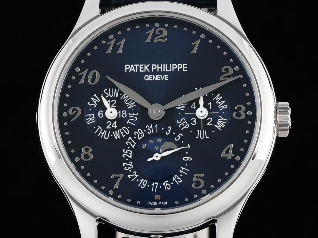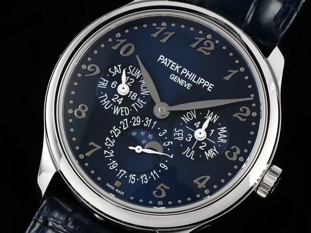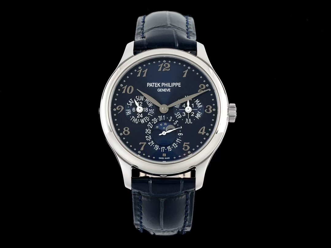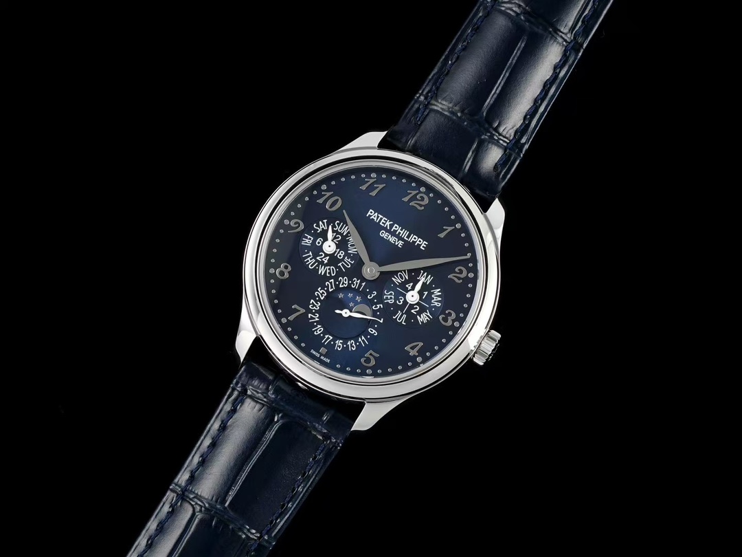 3K Patek Philippe 5327/5140 watch. 40mm case, Cal.240 Q movement. Features month, perpetual calendar, date, moon phase, day, 24-hr display. Italian leather strap. Elegant dress watch, versatile for daily wear. A classic art piece and collectible.