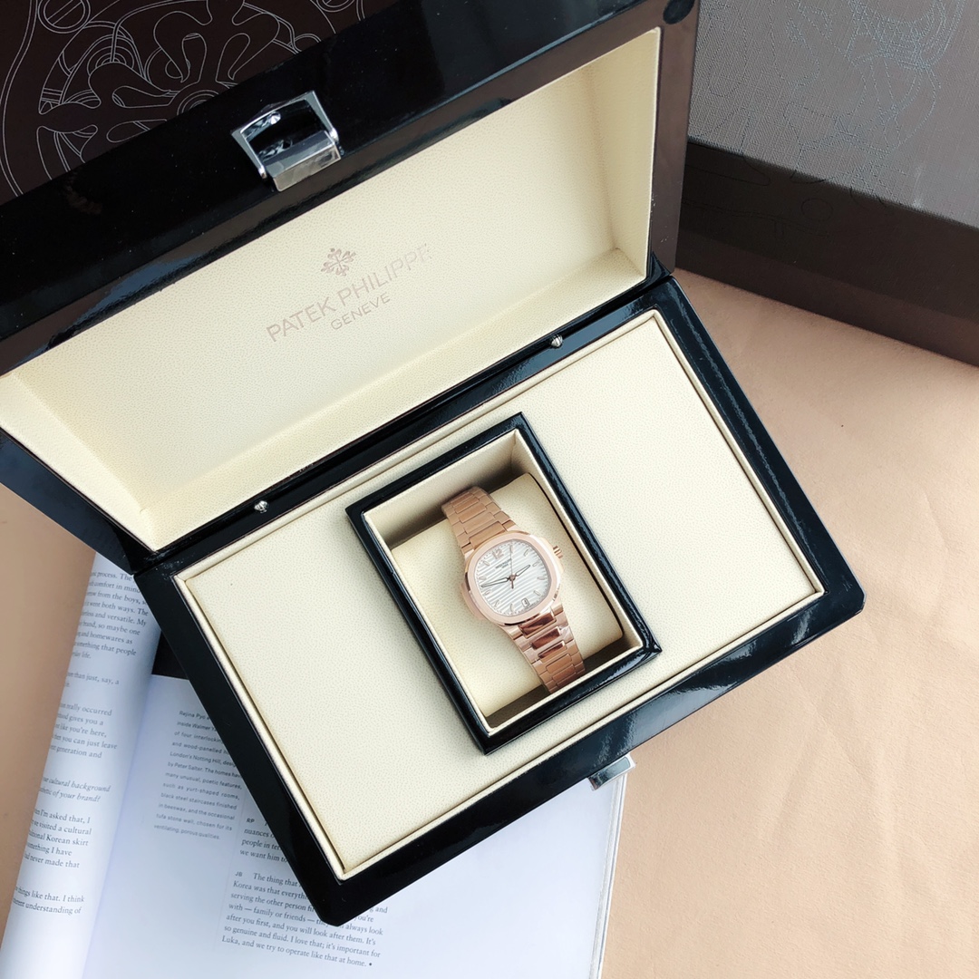 Upgraded Patek Philippe Nautilus 7118 women's watch. Custom 324SC movement, 45h power. 35.2mm case, 8.62mm thick. 316L steel, 56 Swarovski crystals. Sapphire crystal. Matches genuine specs.