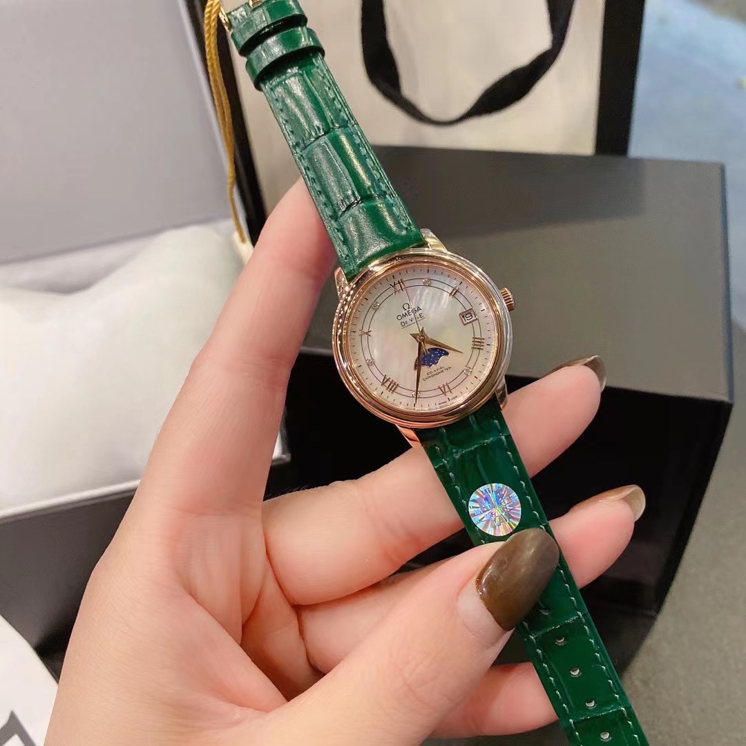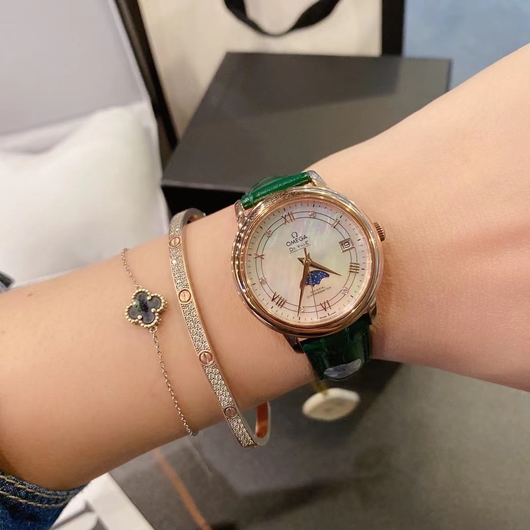 Omega De Ville with 33mm steel case, alligator strap. Silk/pearl dial with diamond indexes. Date at 3, moon phase at 6. Sapphire crystal.