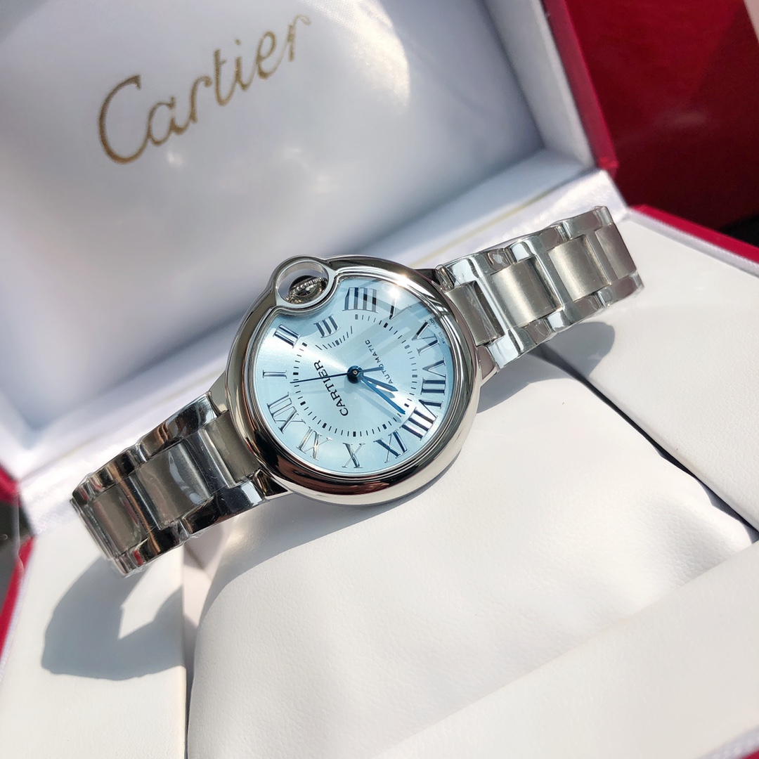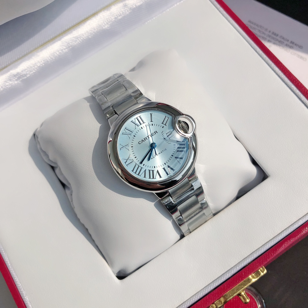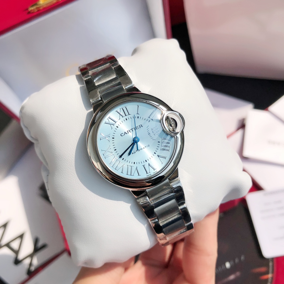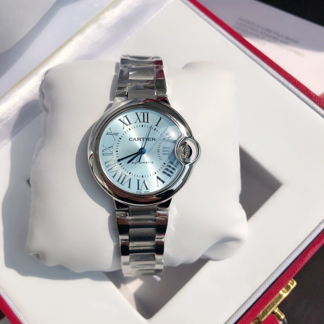 Cartier Ballon Bleu 33mm women's mechanical watch with ice-blue dial. Elegant stainless steel case, Roman numerals, sapphire crystal. Full packaging, perfect for gifts.