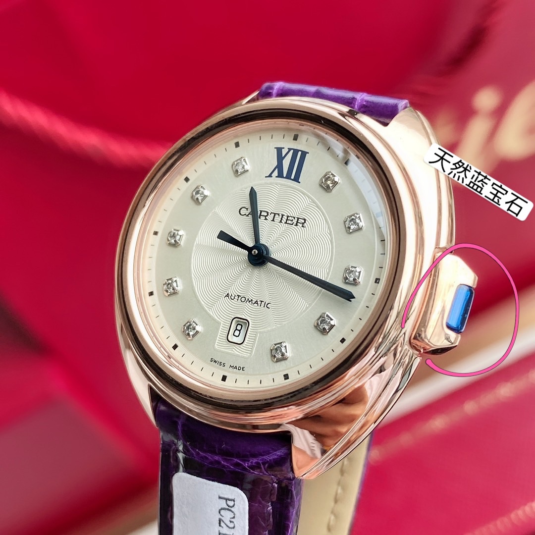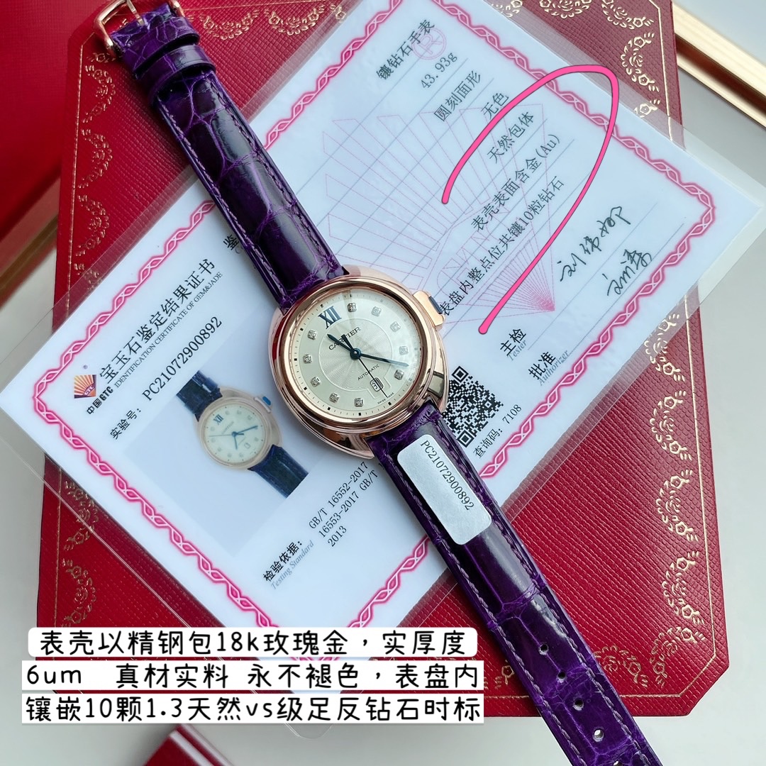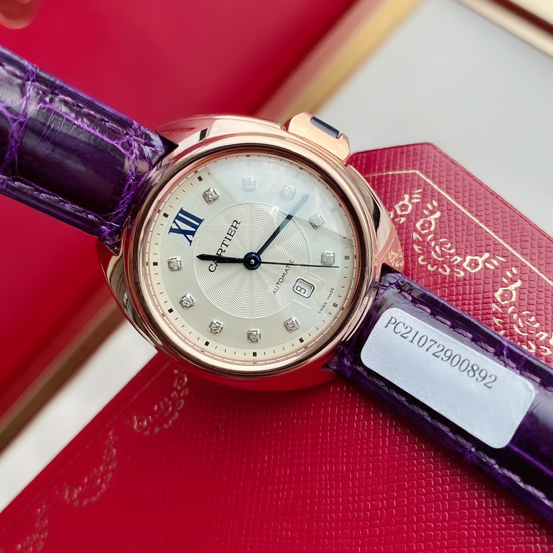 Cartier Key watch: Steel/18k rose gold case, 10 diamond indexes, sapphire crown, guilloché dial, date window, crocodile strap, automatic movement.