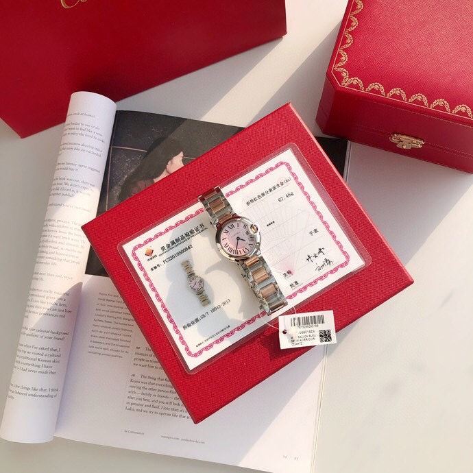 Cartier Ballon Bleu 28mm with gold, rose gold, and mother-of-pearl dial available. Quartz movement. Ultra-thin, elegant classic watch.