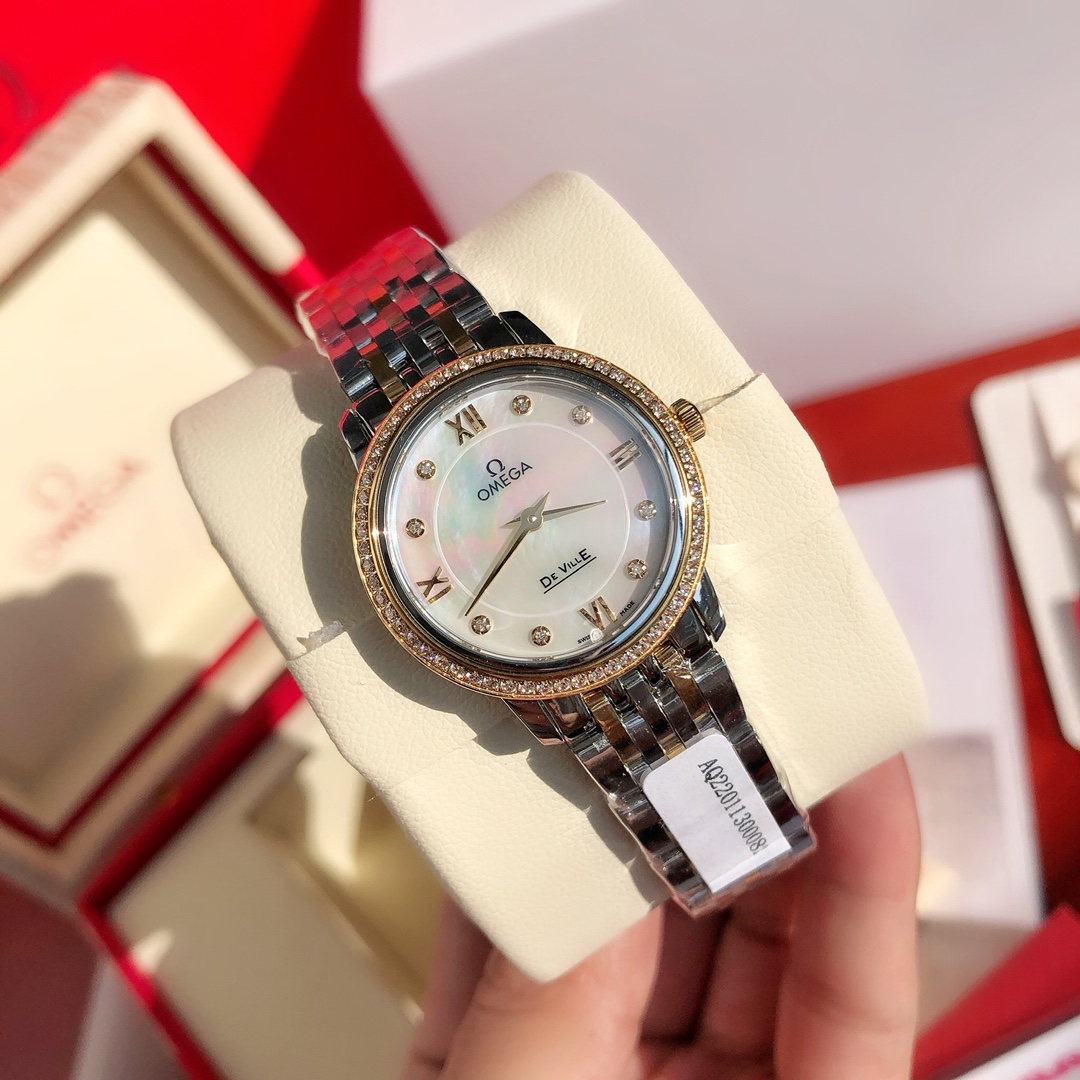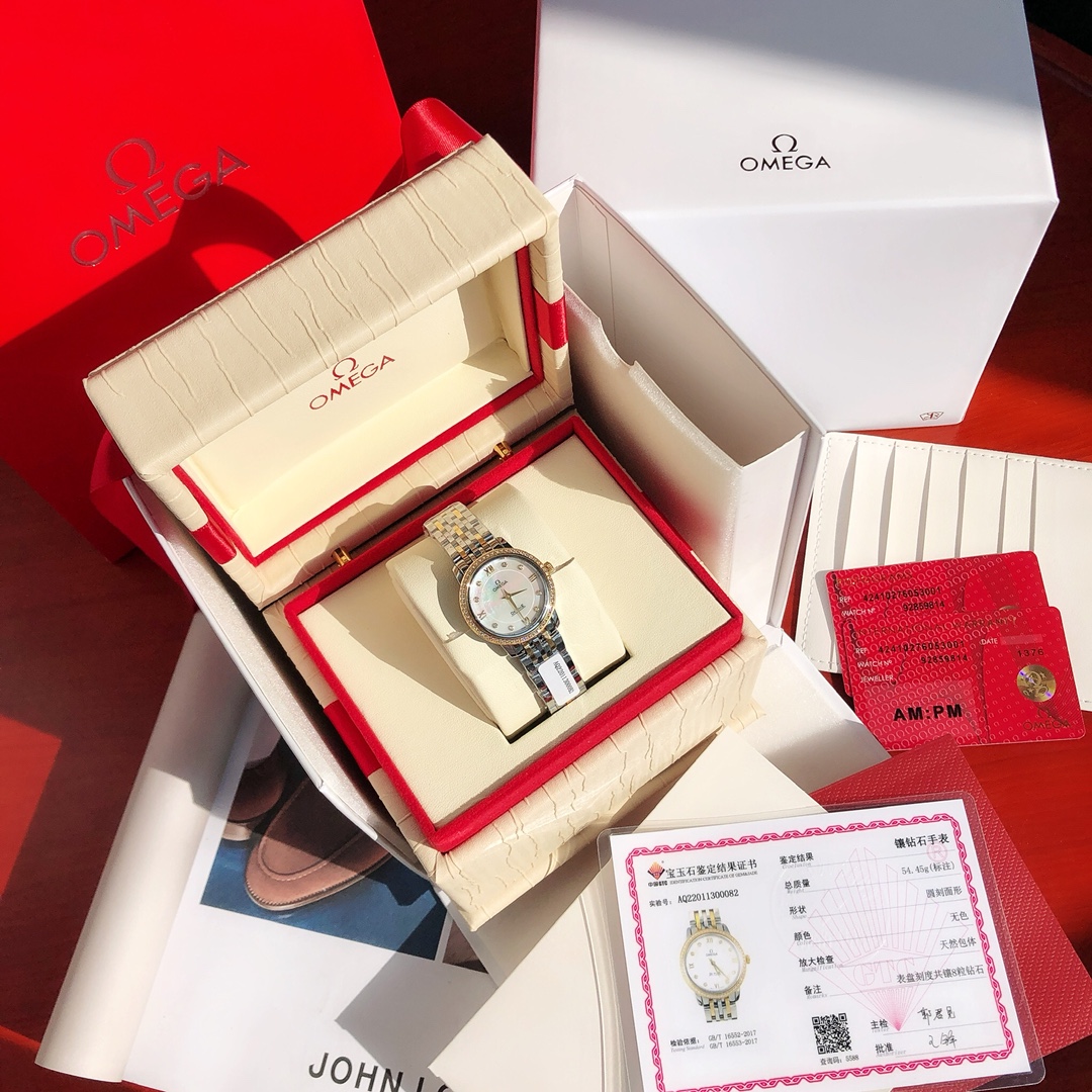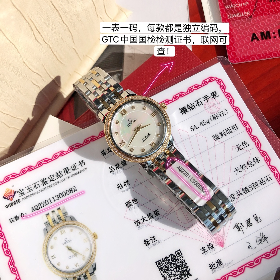 New OMEGA diamond watch exclusive launch. Classic elegant design, 60 VS1.1 Swarovski diamonds on bezel, 8 natural VS1.2 diamonds inside. Authentic movement, steel case and bracelet. Includes GTC certification and full packaging.