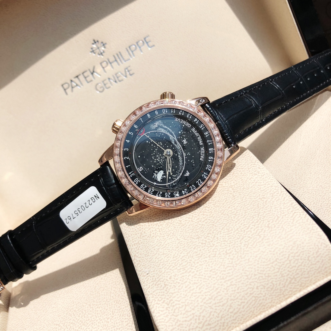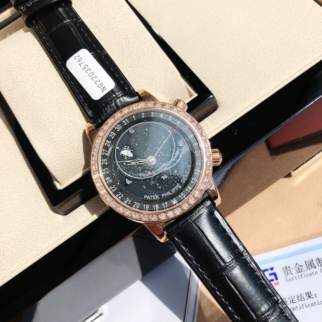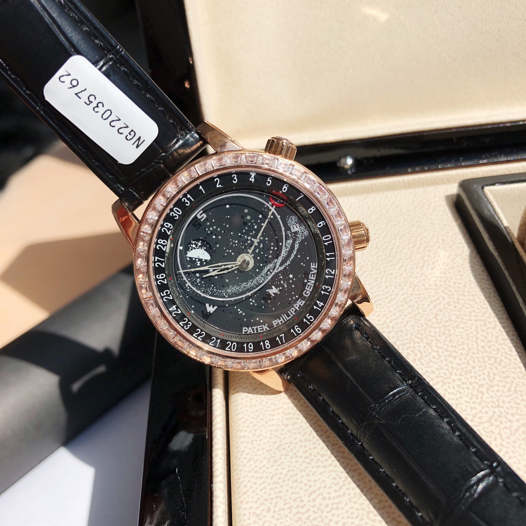 Latest Patek Philippe Celestial 6104G. Features star chart, blue dial, lunar phase, automatic movement. 42mm case, 11mm thick. Moon phase syncs with real sky. Luxury replica with certificate.