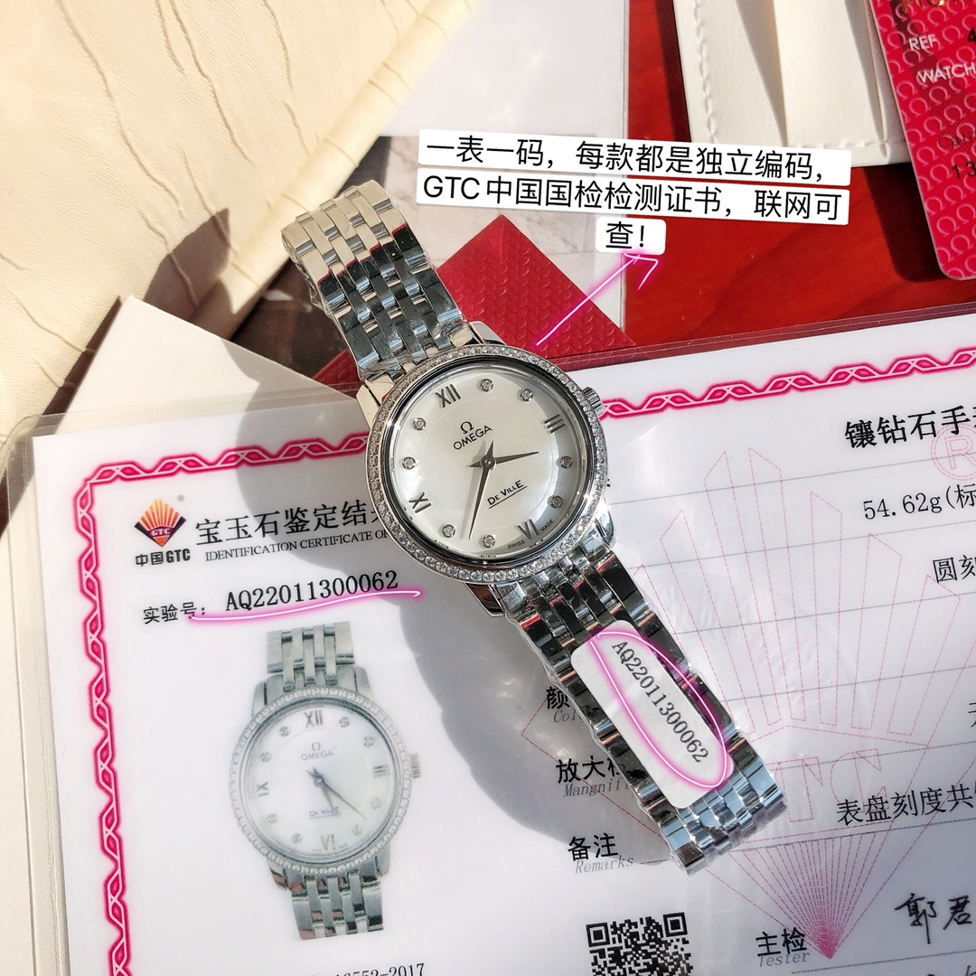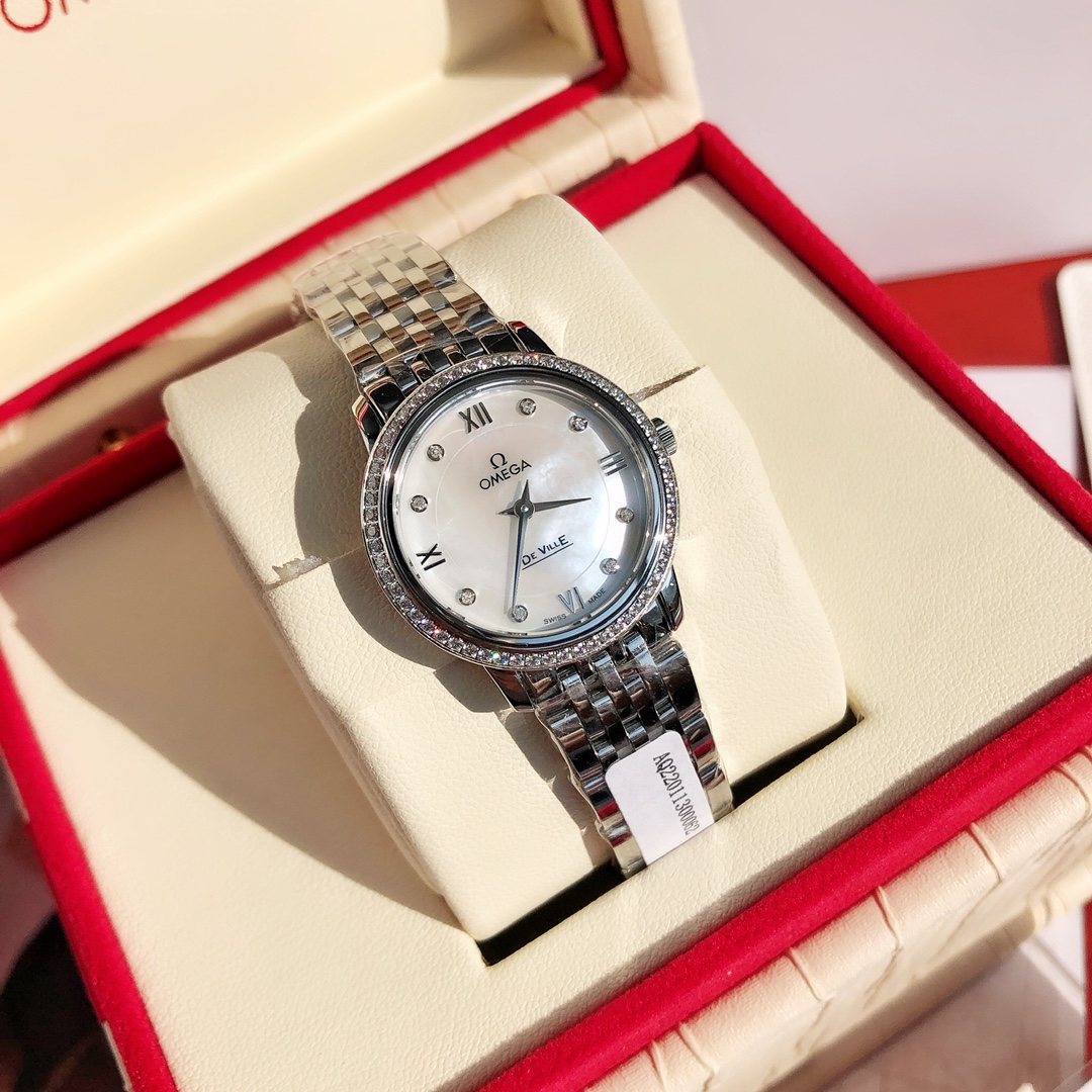 New OMEGA diamond watch with genuine diamonds, classic design, 27.4mm dial, steel case and bracelet, includes certificate and full packaging.