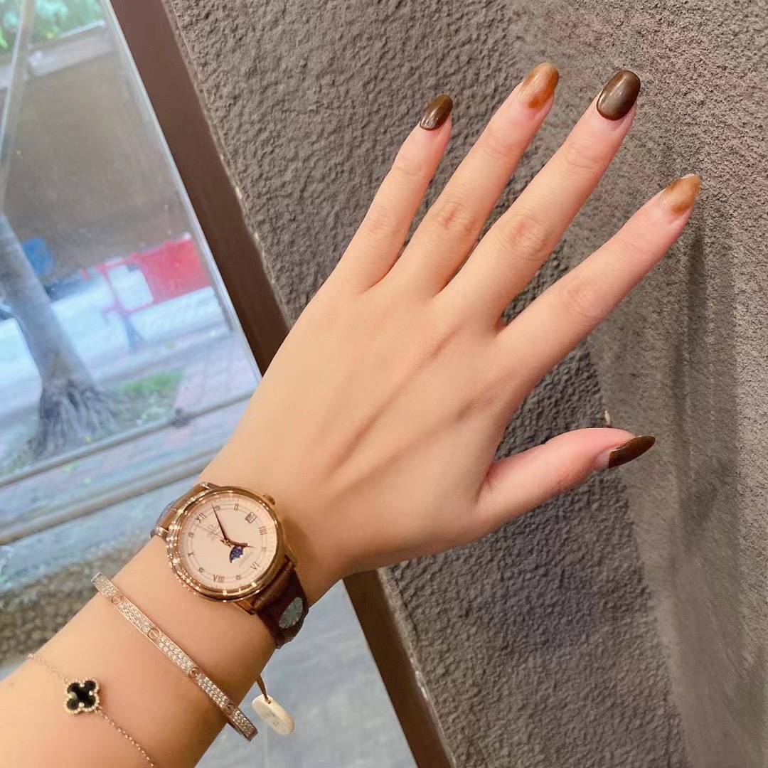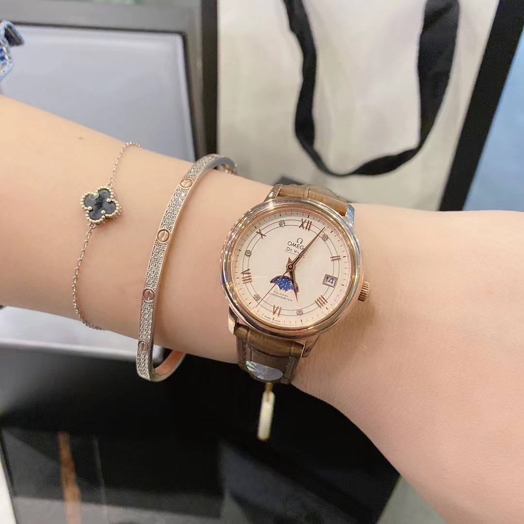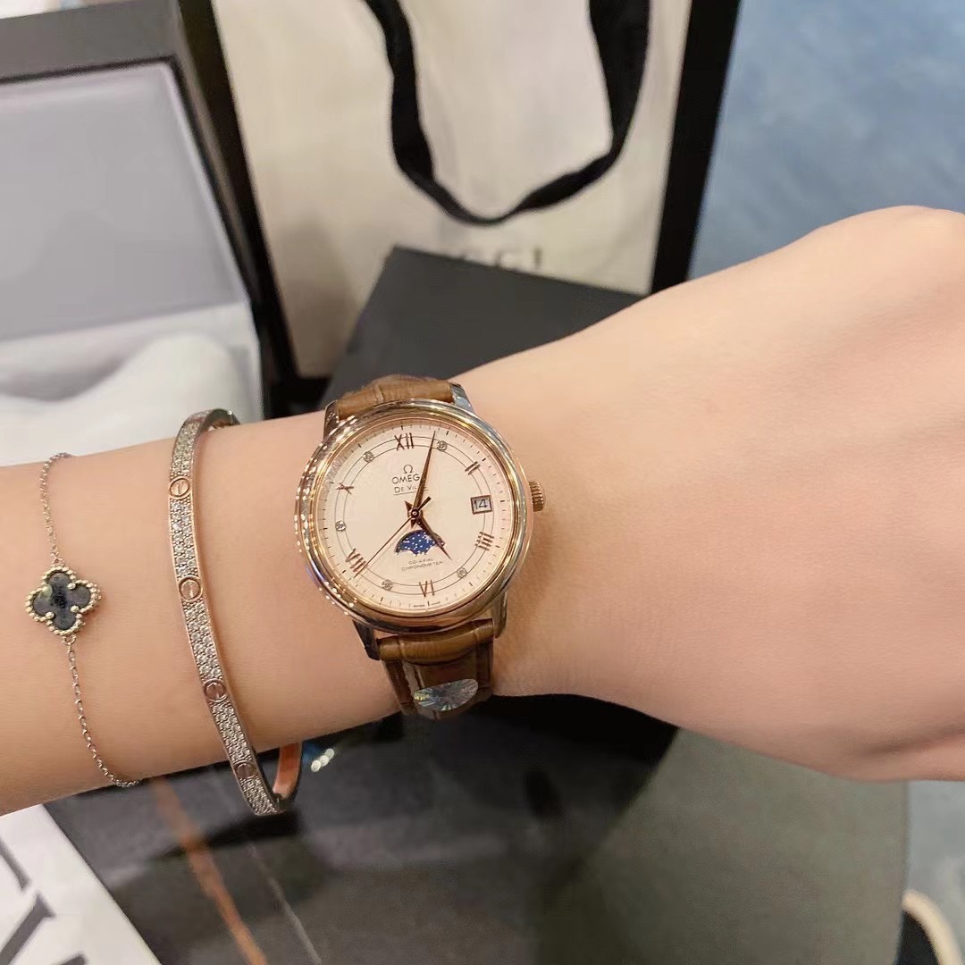Omega De Ville Star Moon Phase watch: 33mm steel case, alligator strap, silk/mother-of-pearl dial with diamond indexes, date at 3, moon phase at 6, sapphire crystal.