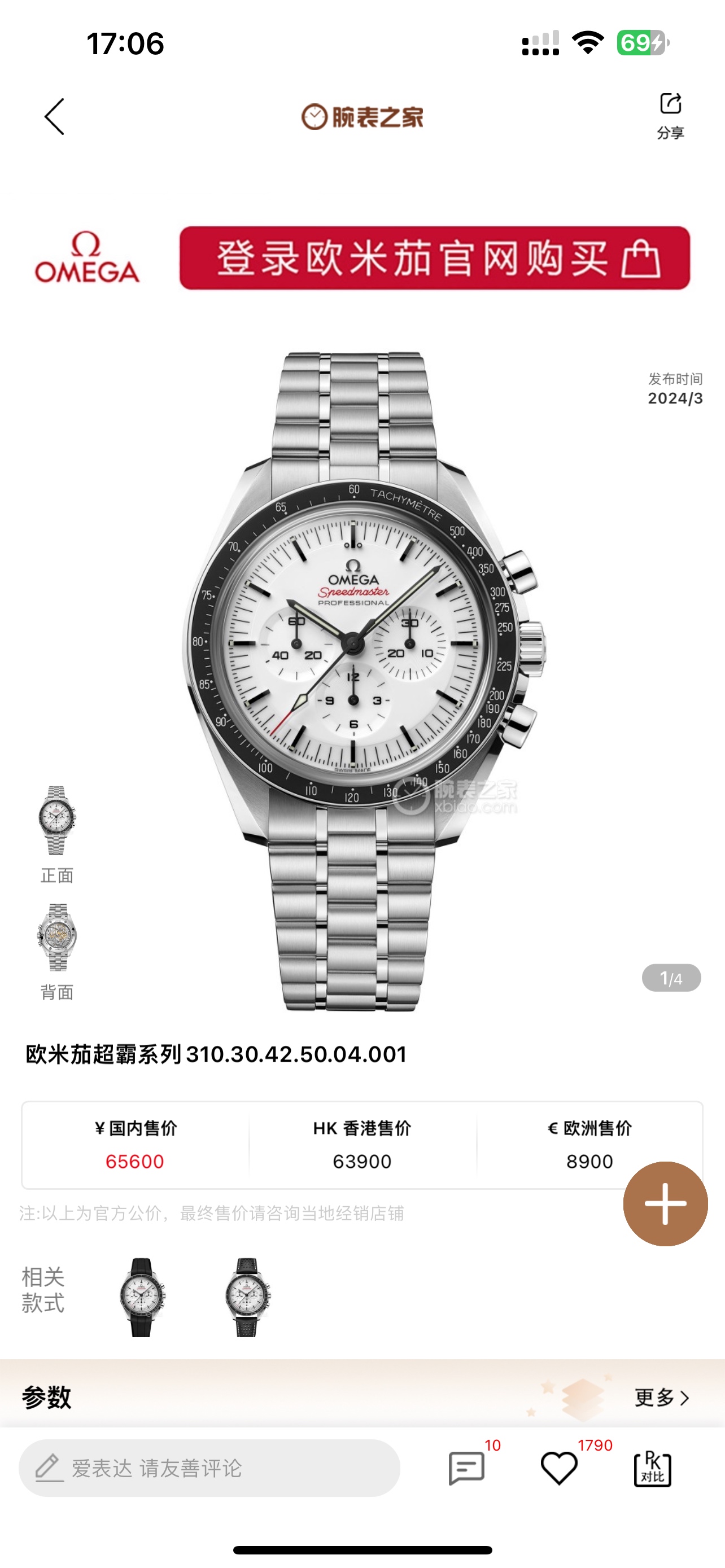 Omega Speedmaster Moonwatch 310.30.42.50.04.001: 42mm steel case, white dial with red "Speedmaster," black ceramic bezel, upgraded 3861 movement.