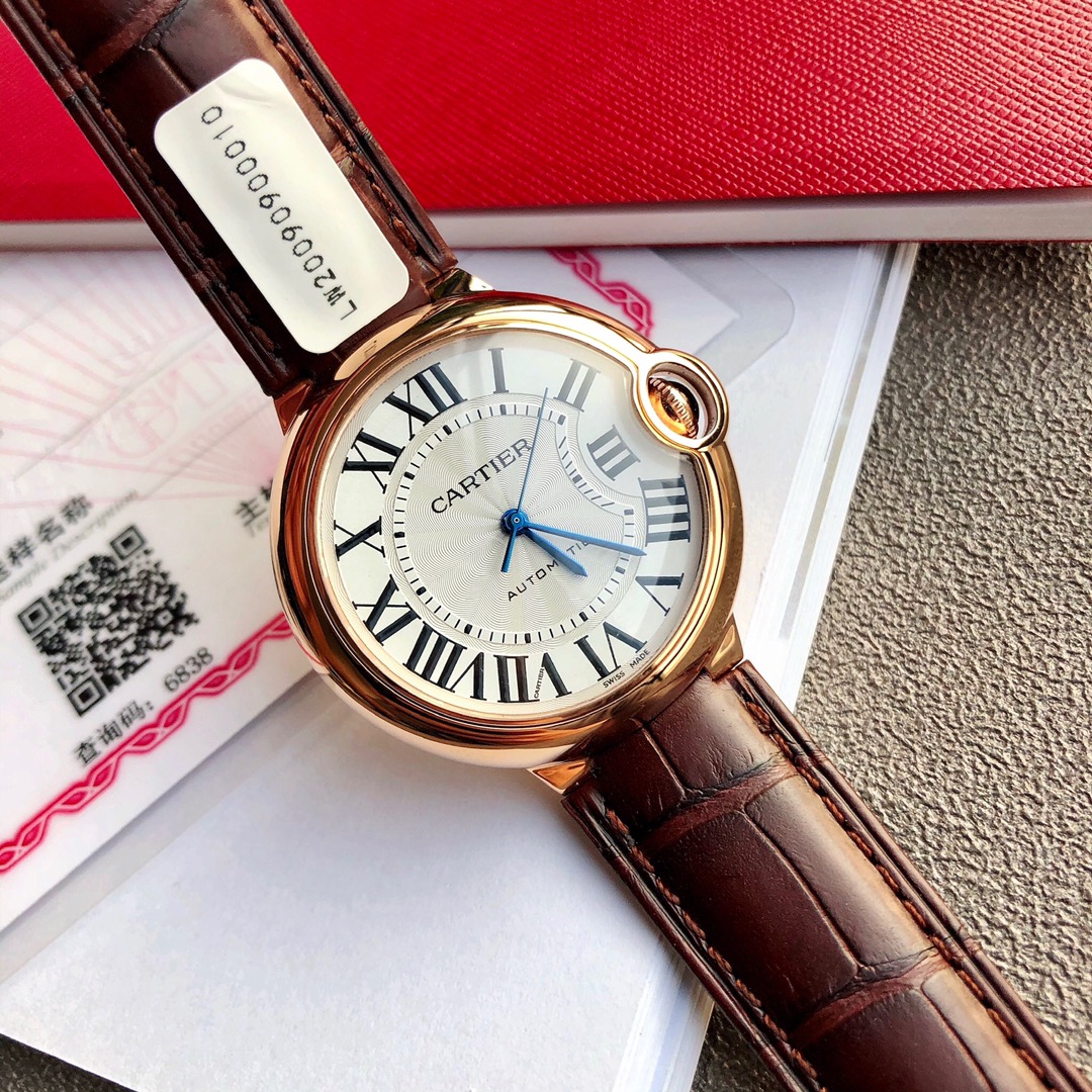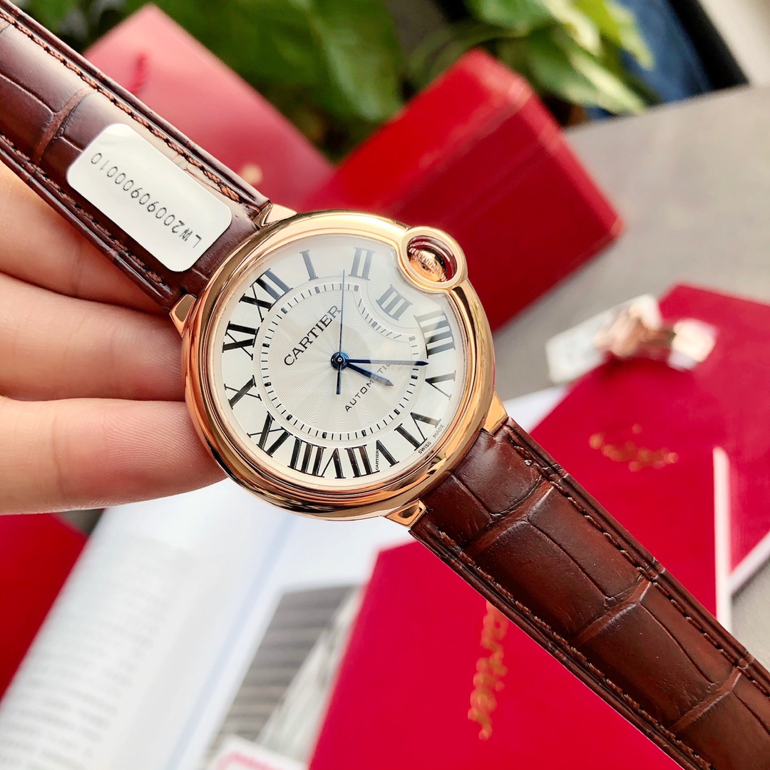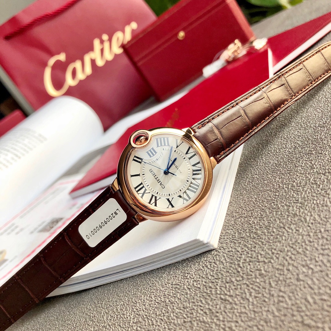 Cartier Ballon Bleu 33mm automatic watch. 18K rose gold plated, alligator strap. Swiss movement, sapphire crystal. Includes certificate. High quality, affordable price. Unconditional returns accepted.