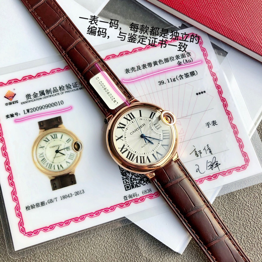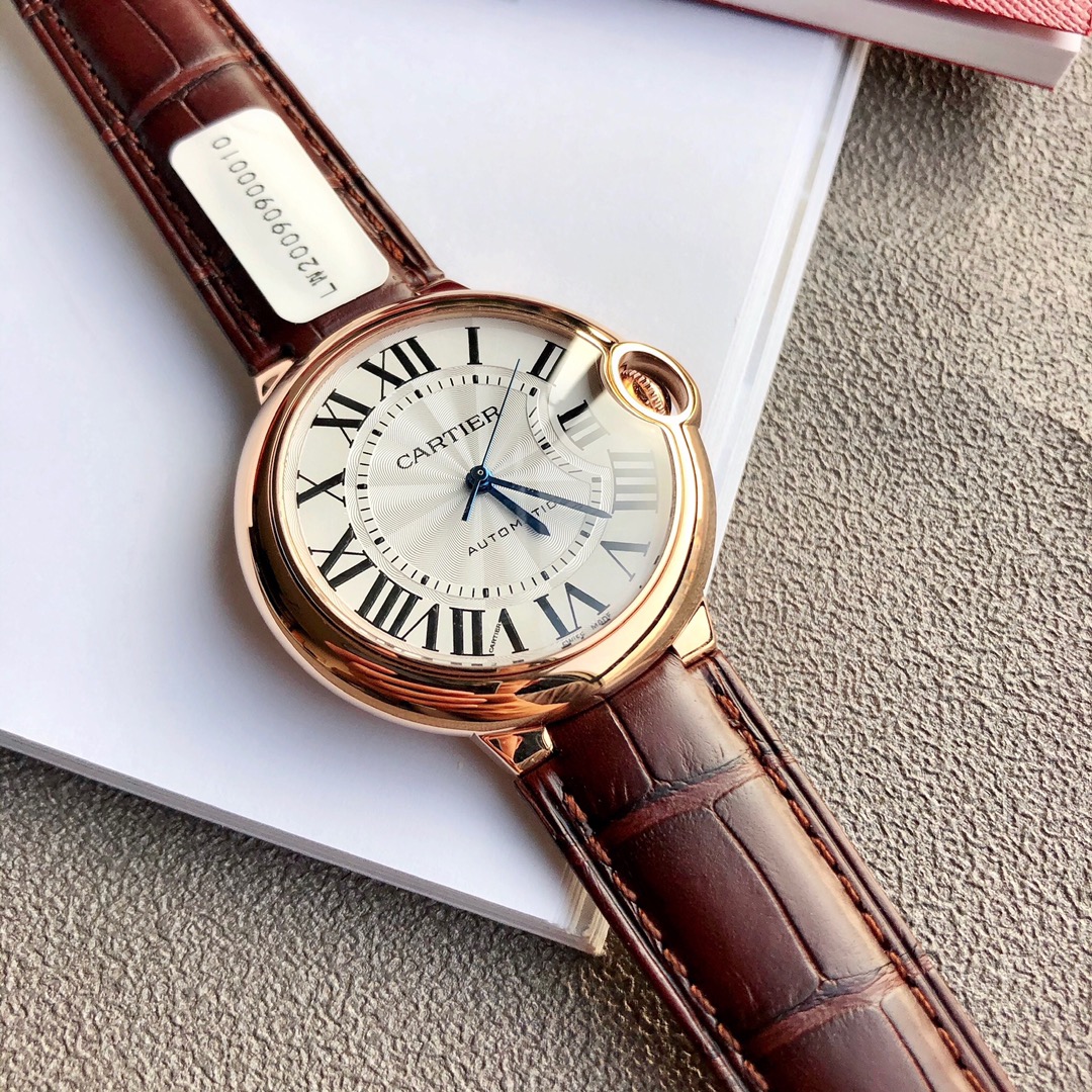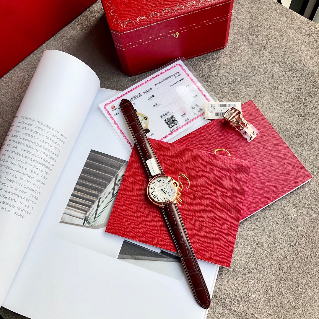 Cartier Ballon Bleu 33mm automatic watch. 18K rose gold plated, alligator strap. Swiss movement, sapphire crystal. Includes certificate. High quality, affordable price. Unconditional returns accepted.