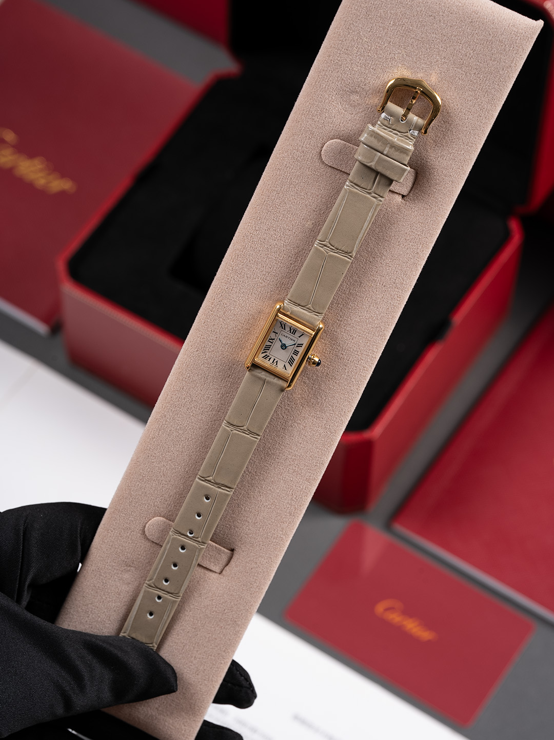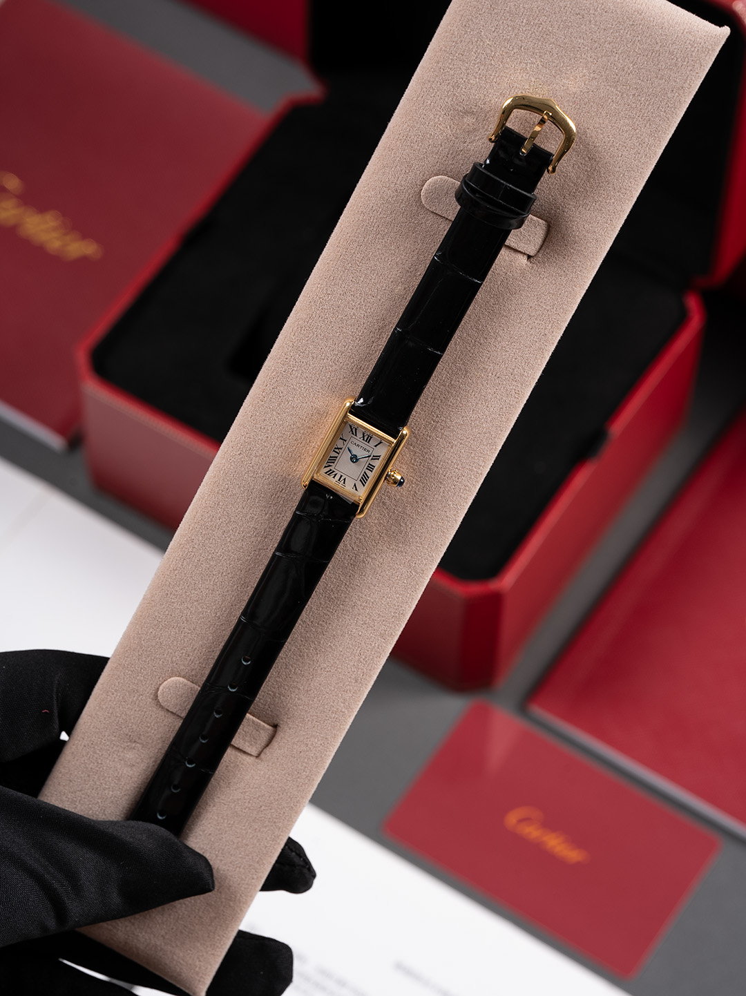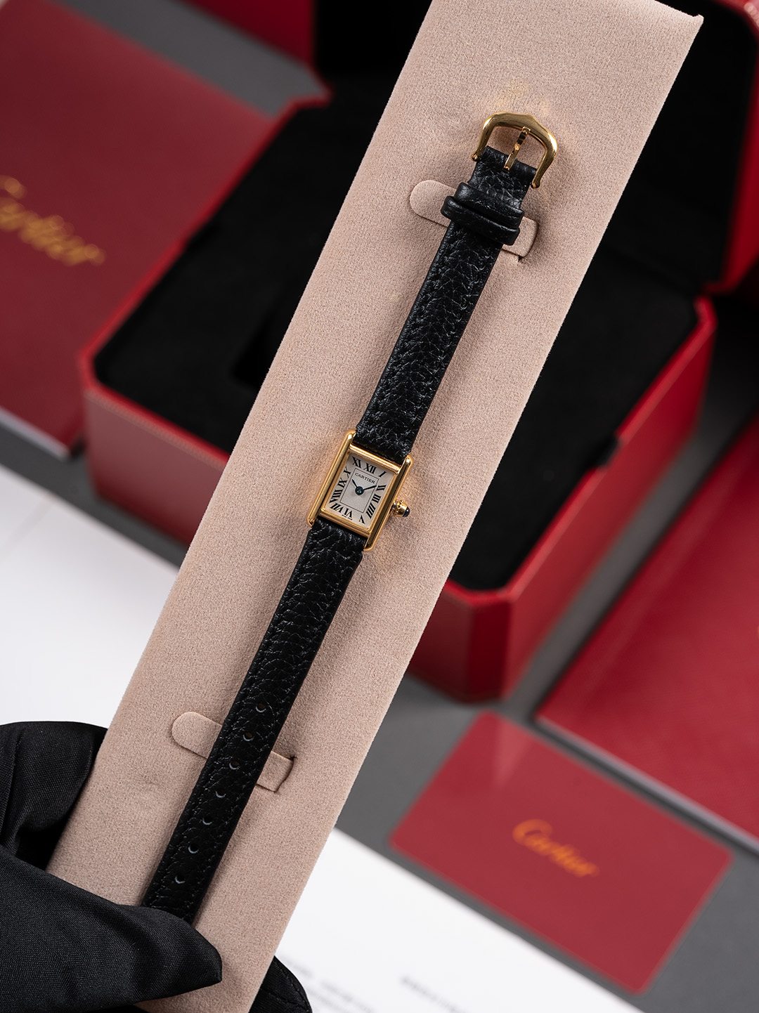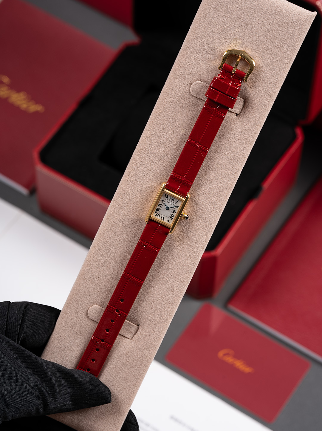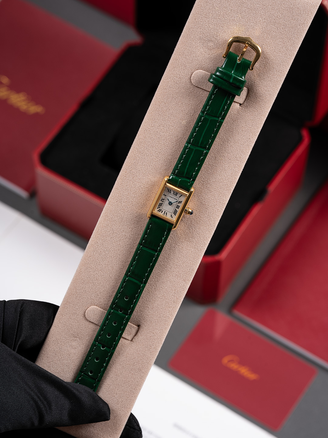 Cartier Mini Tank watch: 24×16.5mm dial, imported movement, classic redesign with elegant curved case, hand-set diamonds, genuine leather strap. Ultimate elegance.