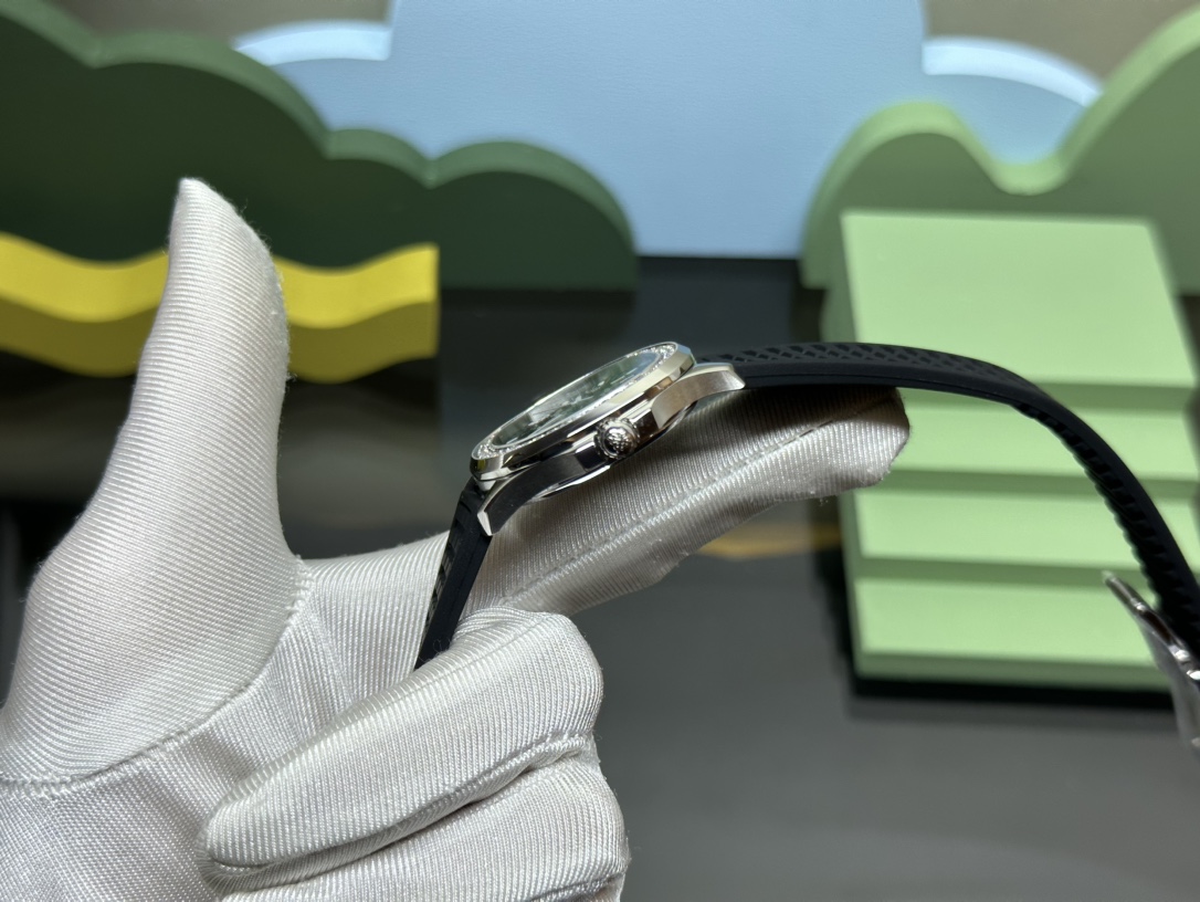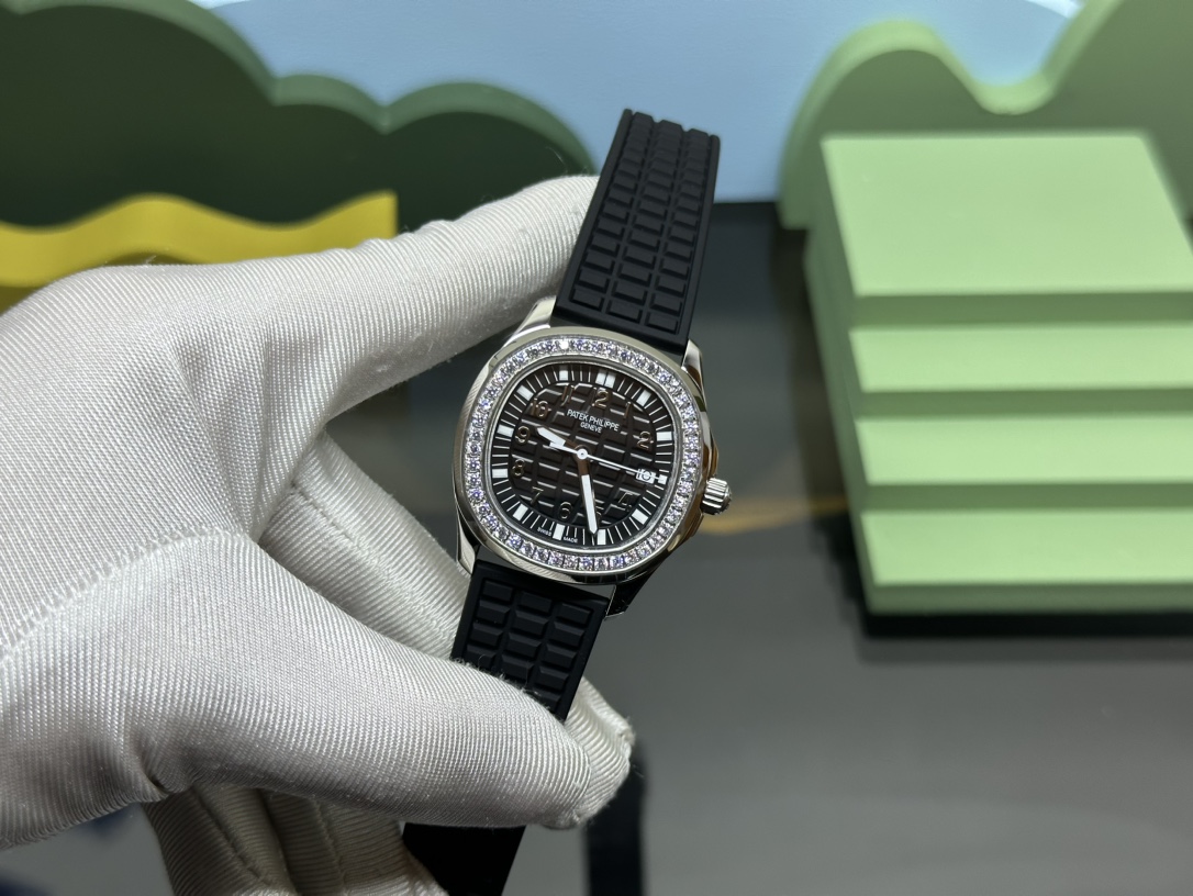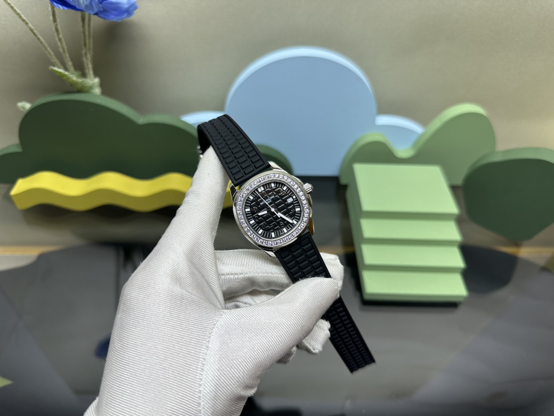 Patek Philippe 5067A replica watch. 35.6mm tropical rubber strap, Swarovski crystals, Swiss quartz movement. Supports Hong Kong direct mail.