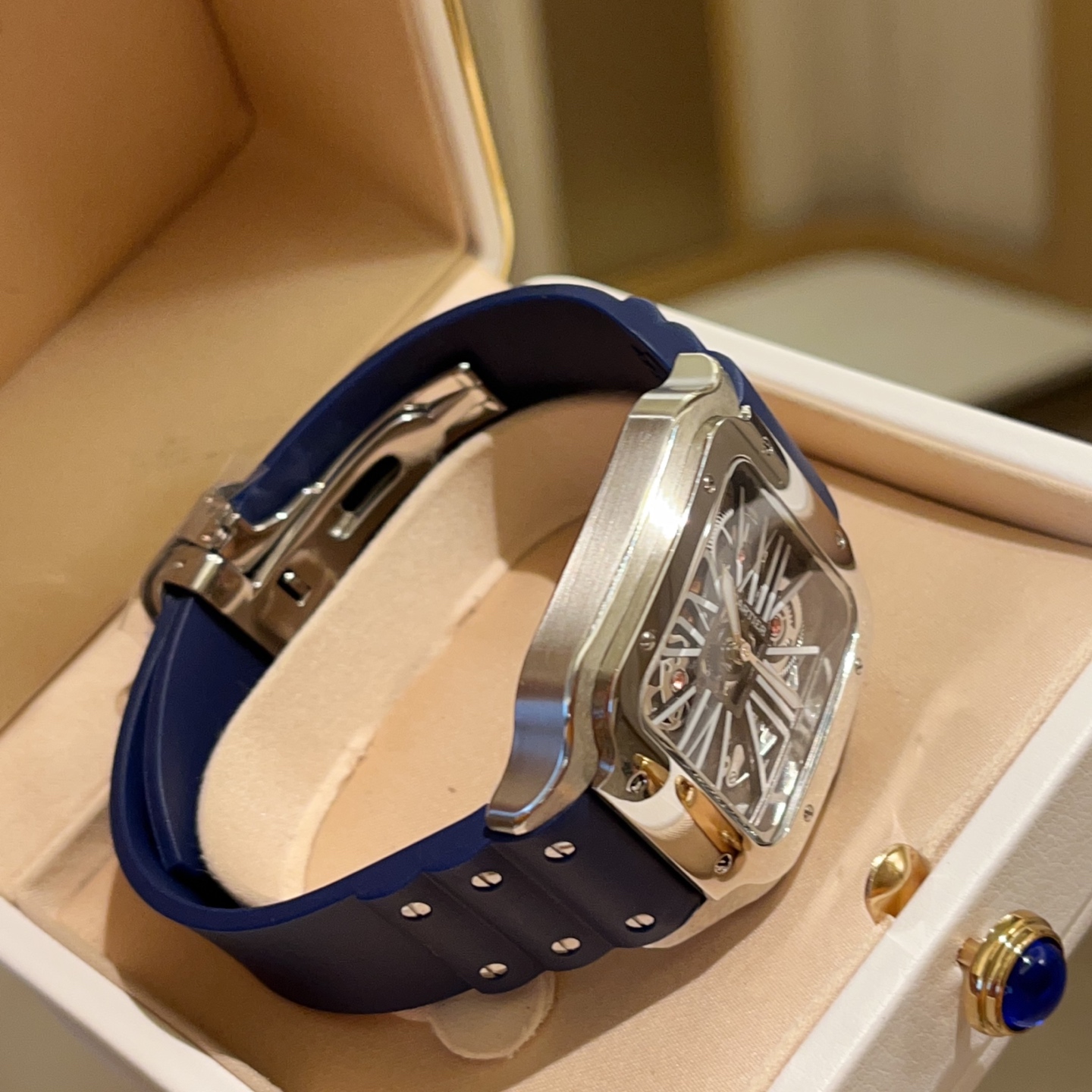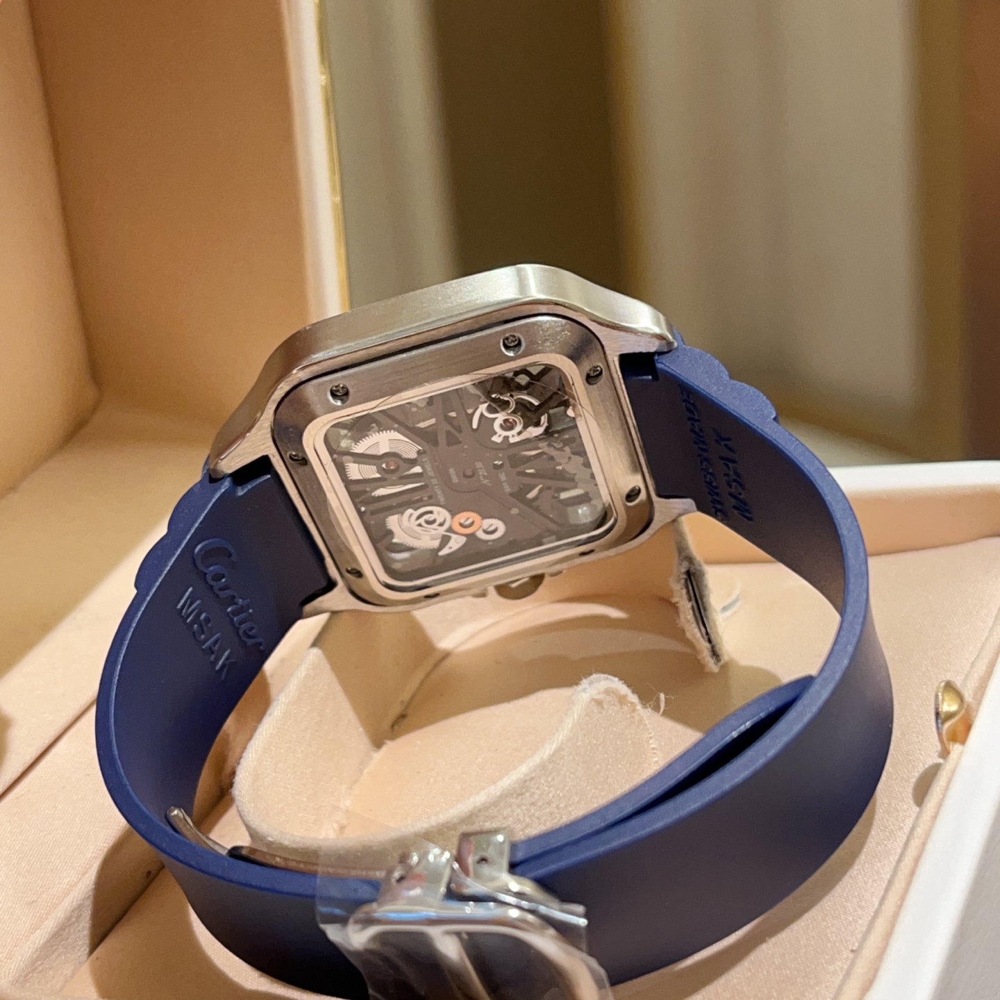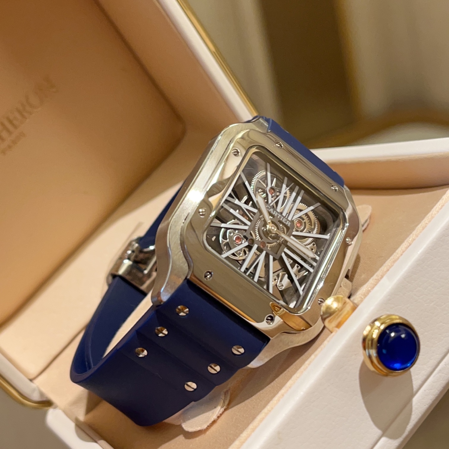 Cartier Santos Skeleton. 39.8mm case, Japanese quartz. Skeleton dial, square shape. Black/blue strap. Folding clasp. Sapphire crystal.