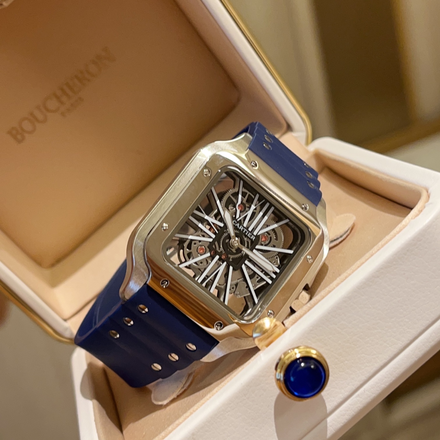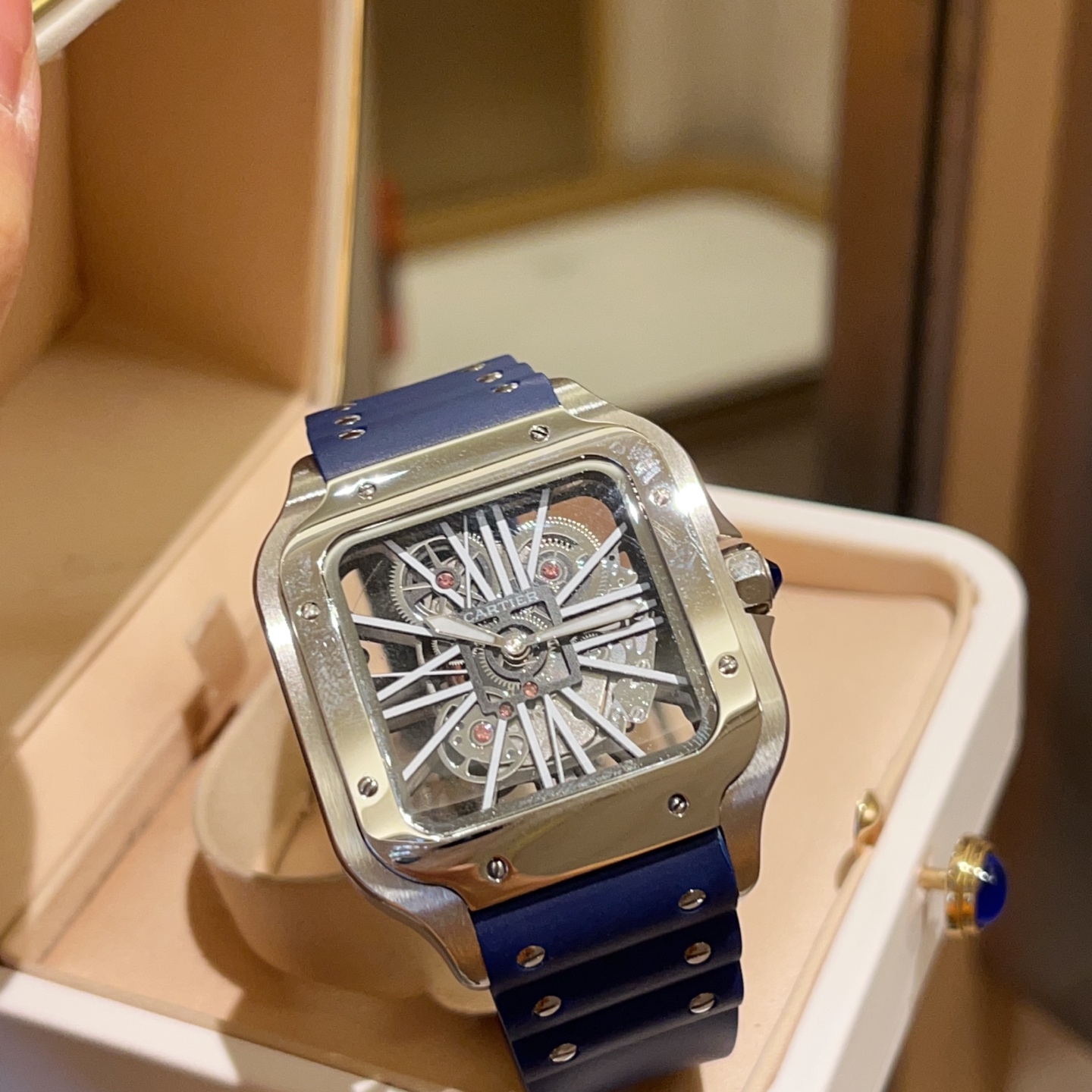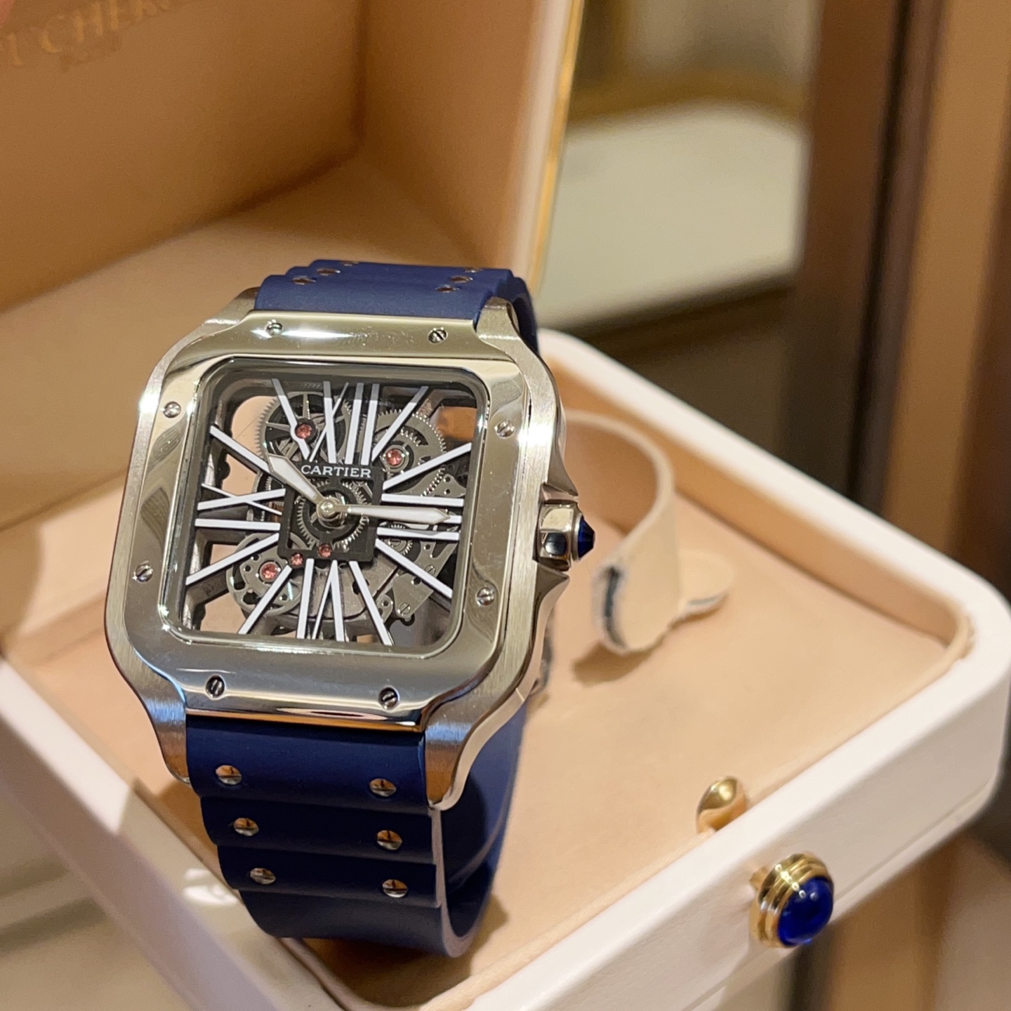 Cartier Santos Skeleton. 39.8mm case, Japanese quartz. Skeleton dial, square shape. Black/blue strap. Folding clasp. Sapphire crystal.
