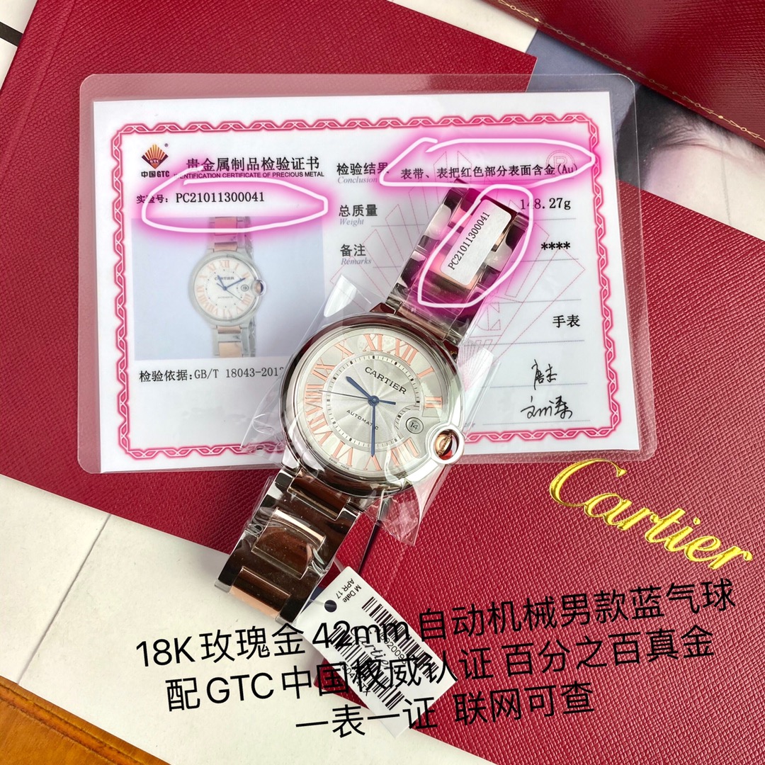 New 18K rose gold Cartier Ballon Bleu 42mm men's mechanical watch with Swiss ETA-2892 movement, waterproof, high-quality packaging.