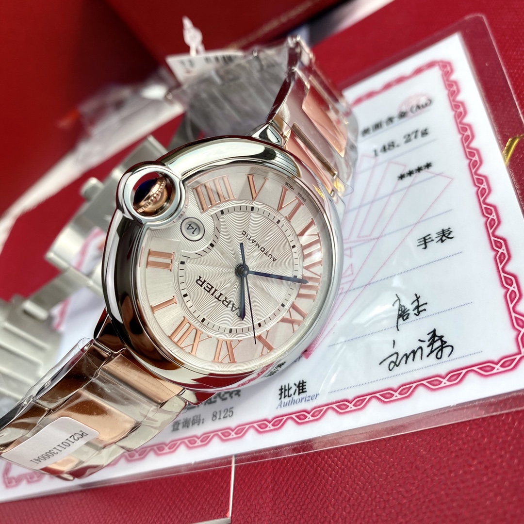 New 18K rose gold Cartier Ballon Bleu 42mm men's mechanical watch with Swiss ETA-2892 movement. High-quality replica, waterproof, with premium packaging.