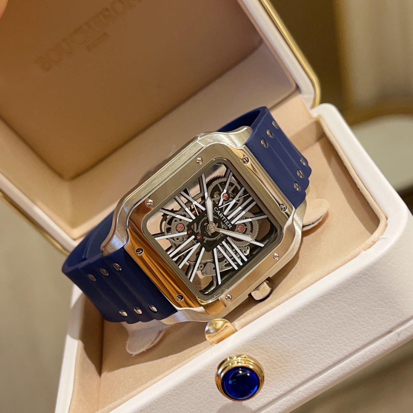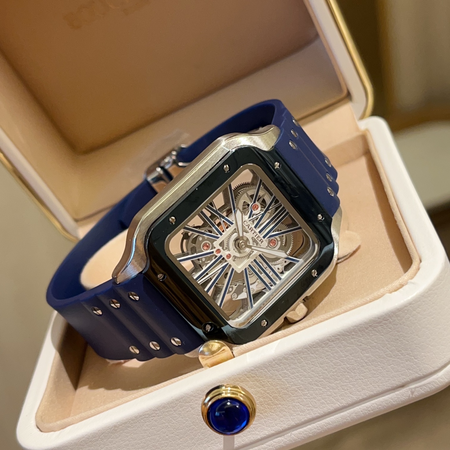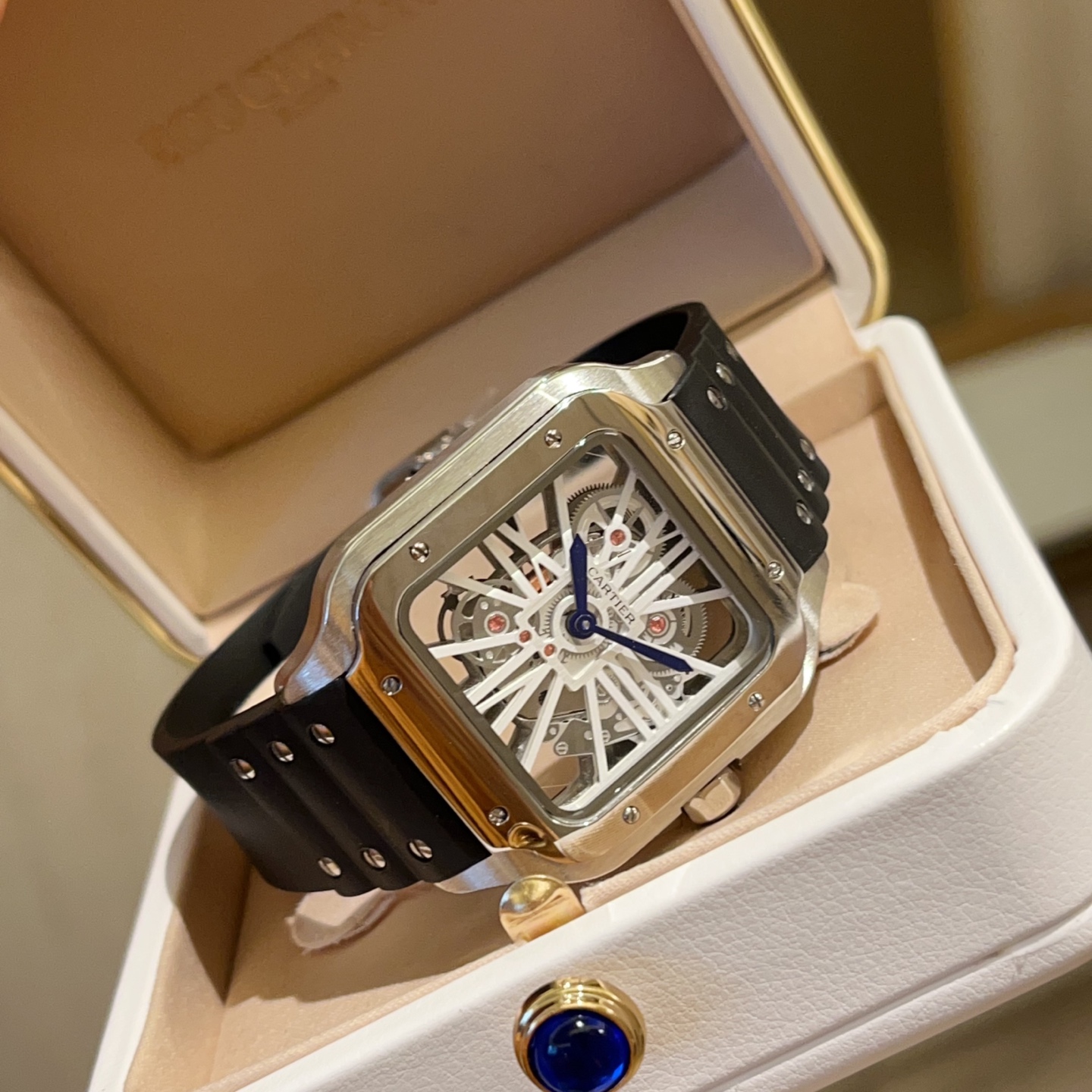 Cartier Santos Skeleton. 39.8mm case, Japanese quartz. Skeleton square dial. Black/blue strap. Double folding clasp.