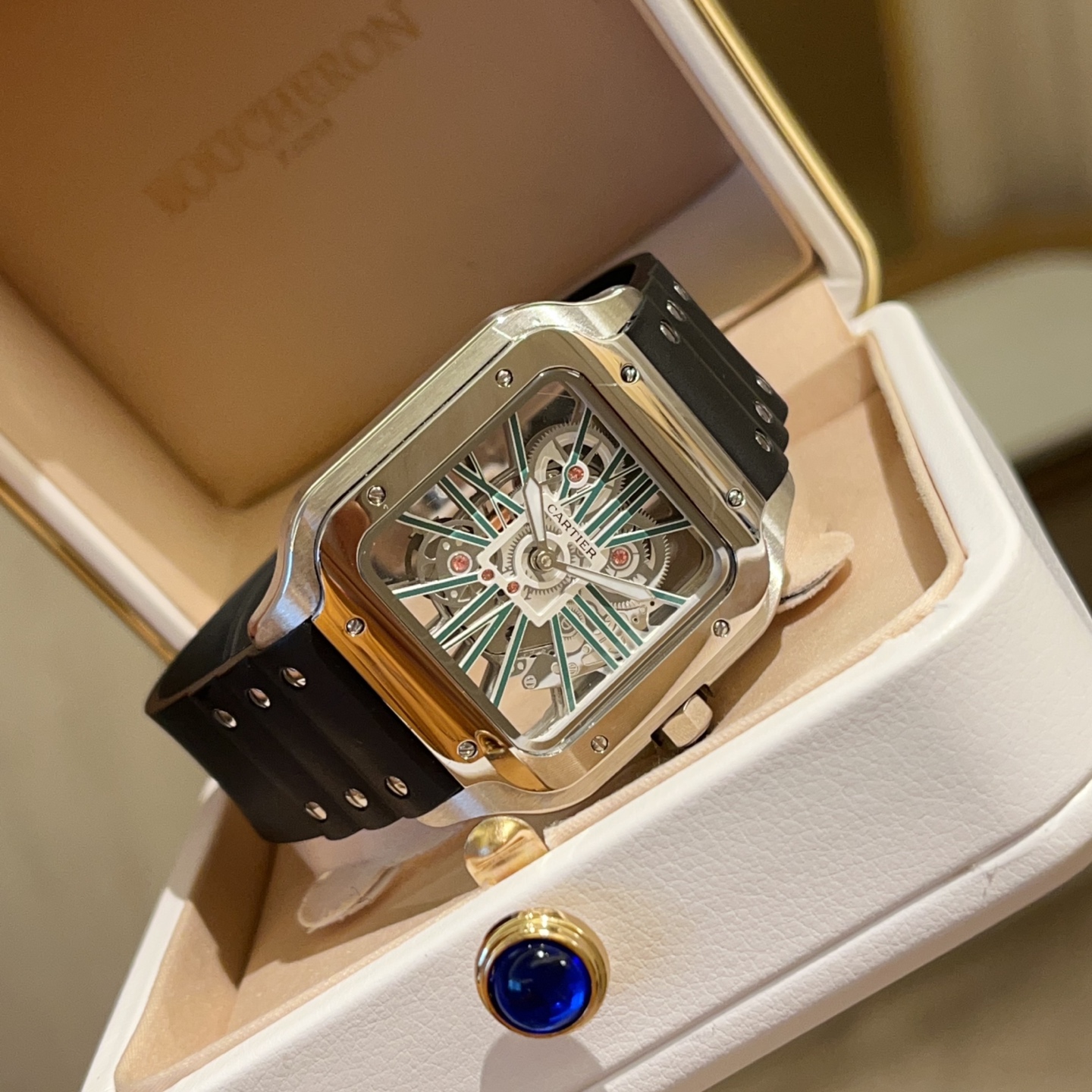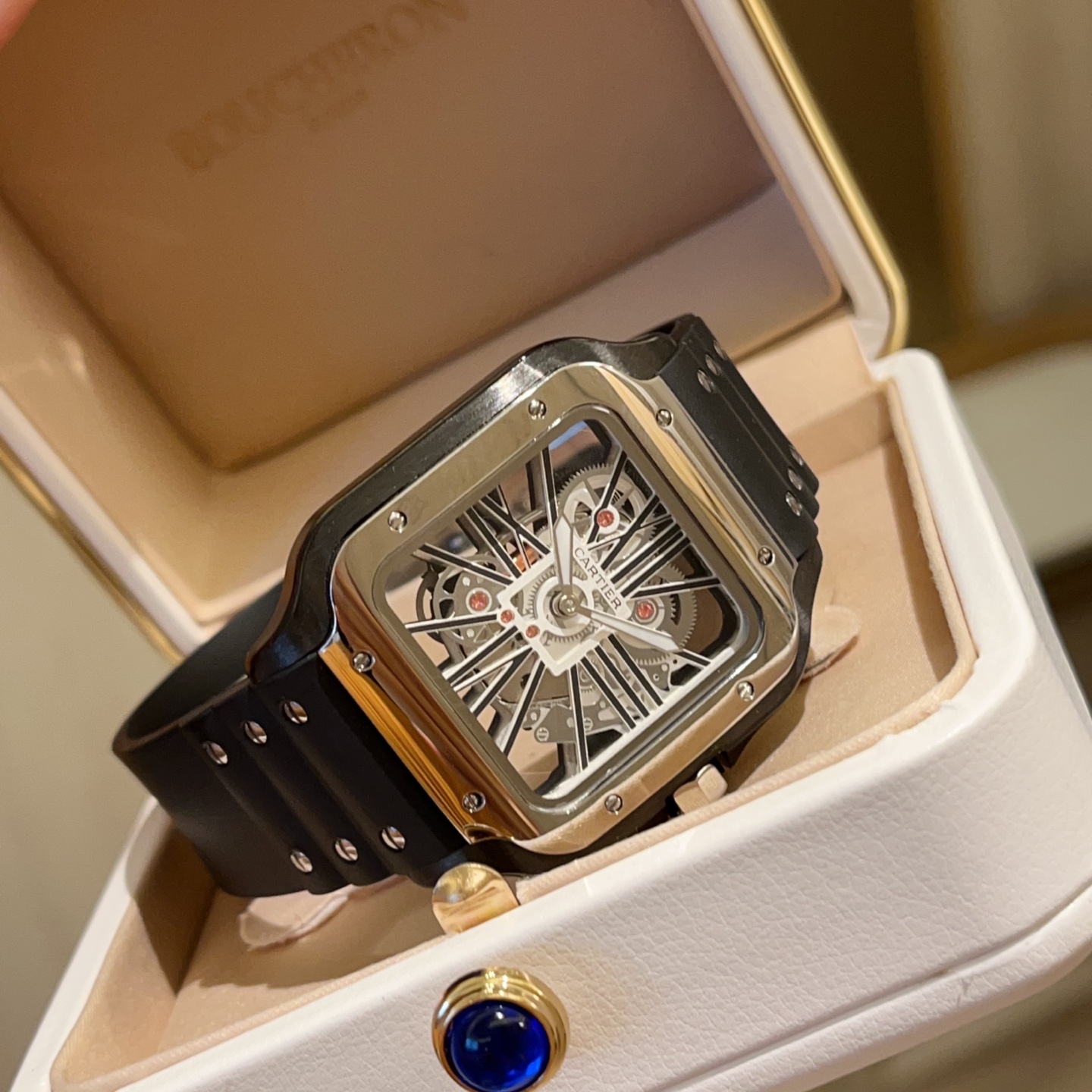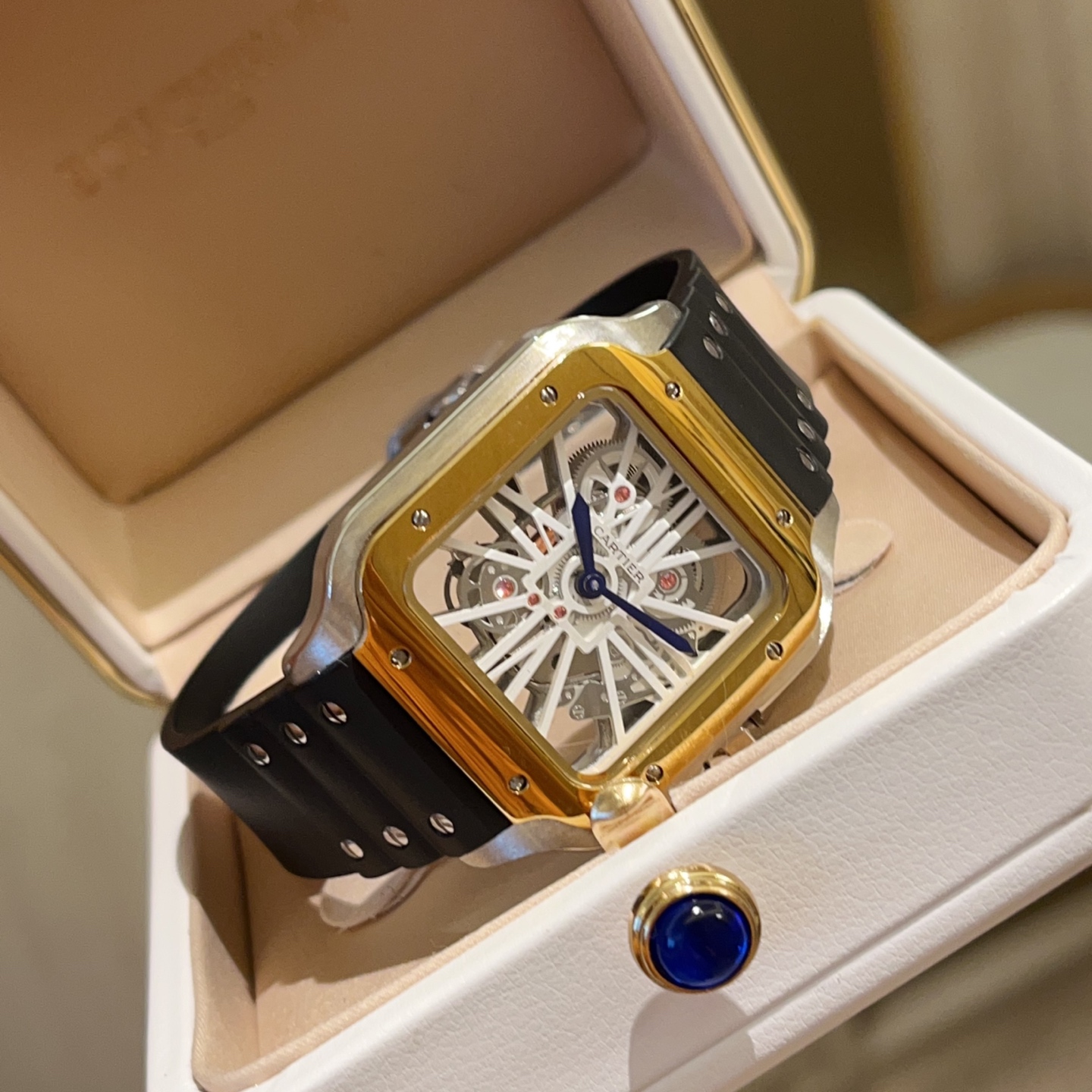 Cartier Santos Skeleton. 39.8mm case, Japanese quartz. Skeleton square dial. Black/blue strap. Double folding clasp.