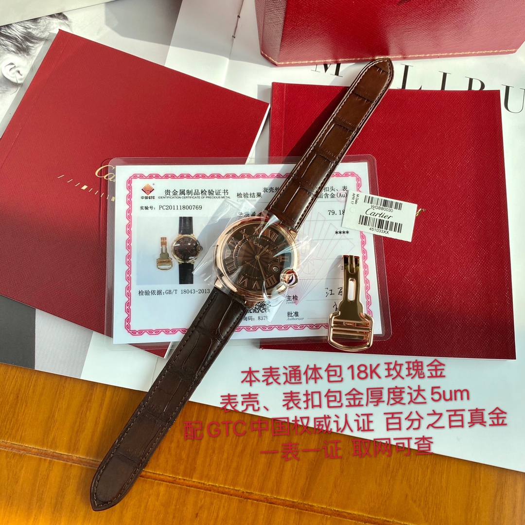 New 18K rose gold Cartier Ballon Bleu 42mm men's mechanical watch with Swiss ETA-2892 movement. High-quality replica, waterproof, automatic winding. Comes with premium packaging.