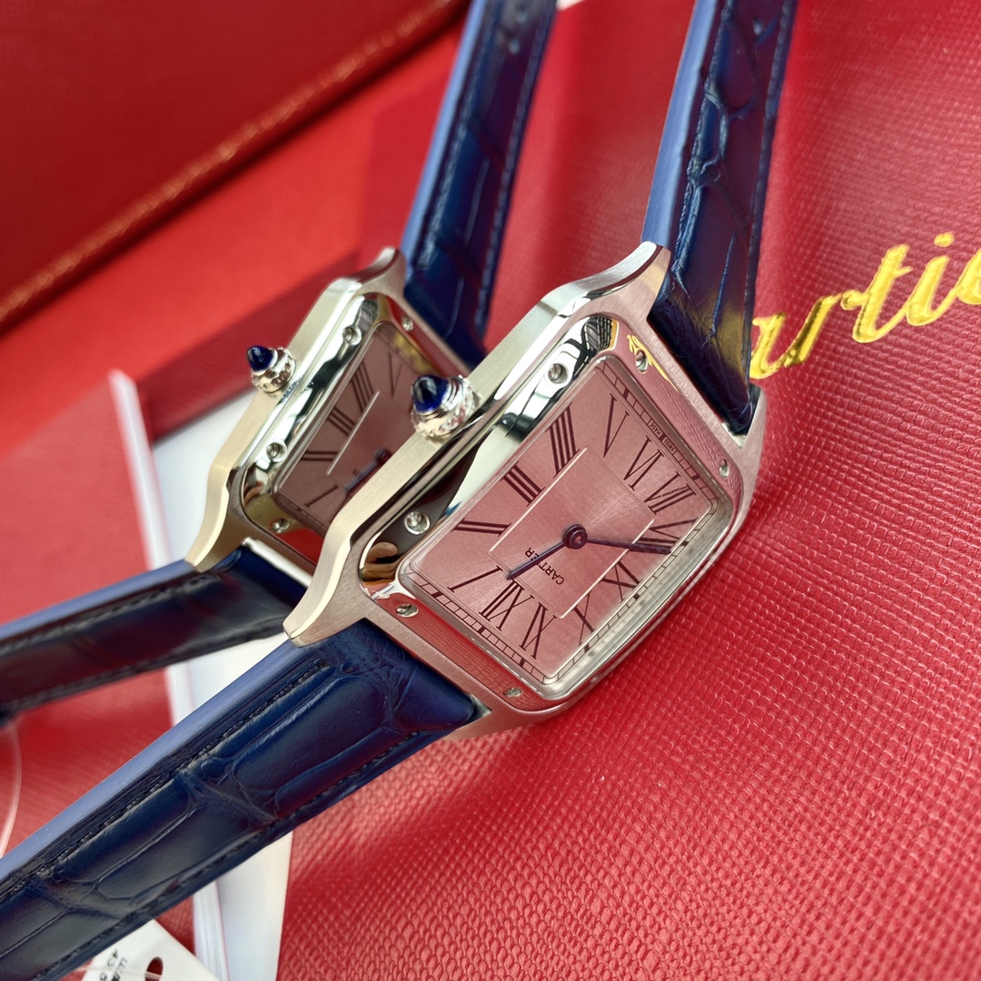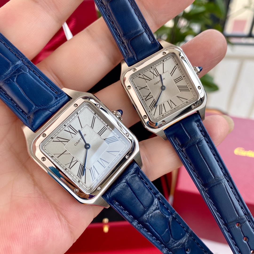 Cartier Santos: iconic square watch, first modern wristwatch. Steel case, Roman numerals, alligator strap. Swiss quartz. Sizes: 43.5x31.4mm & 38x27.5mm. Full set.