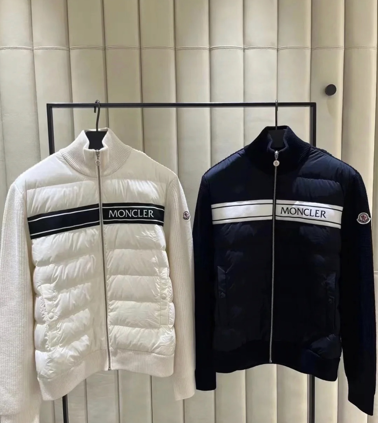 Original title: Moncler cardigan tricot quilted down stand-up collar jacket with knit panels