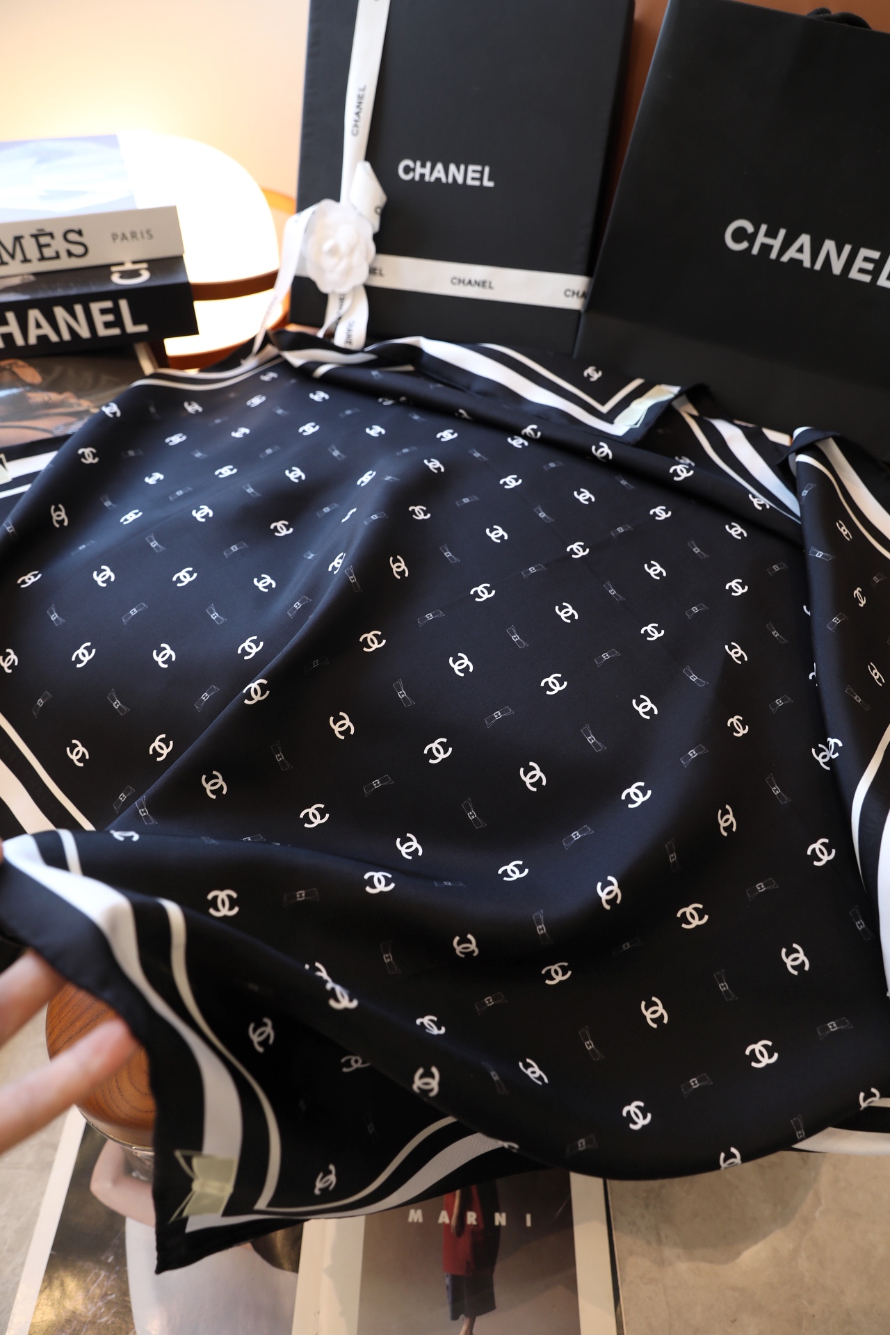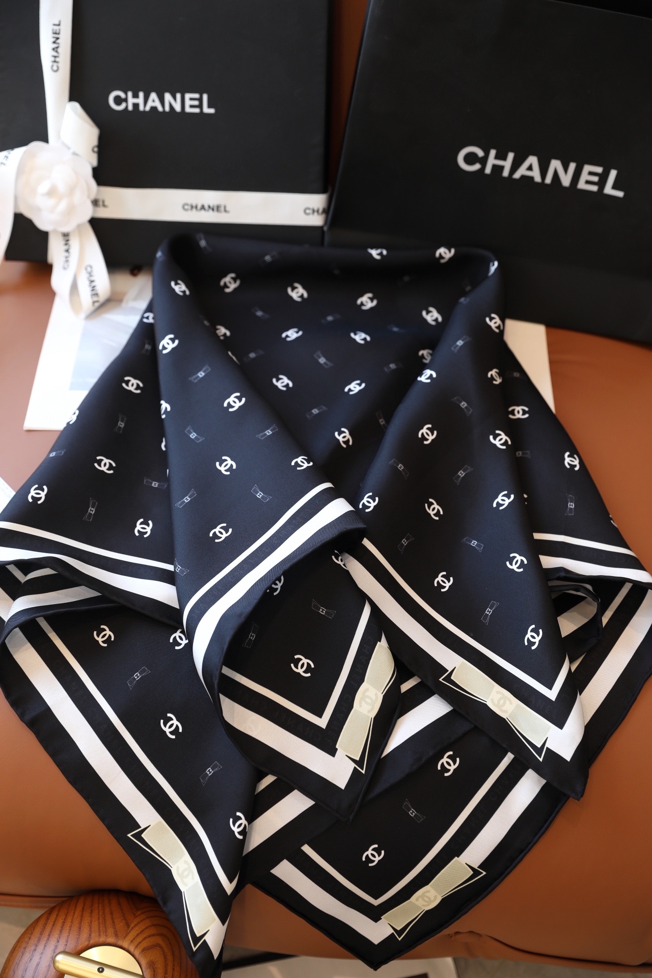 𝐂𝐡𝐚𝐧𝐞𝐥 • 25𝑷 "Bow Scarf" Black Pink 𝐆𝐃 Same Style