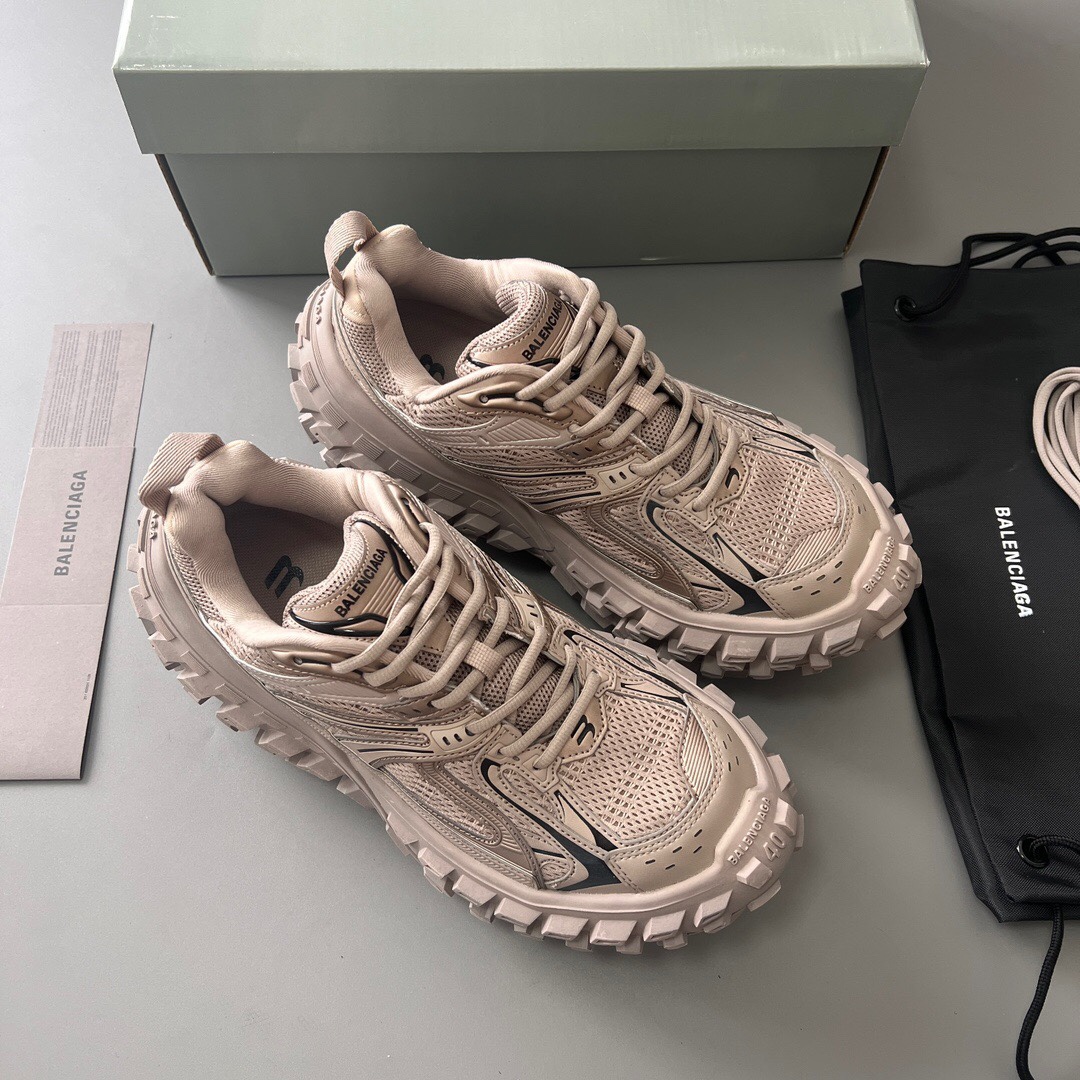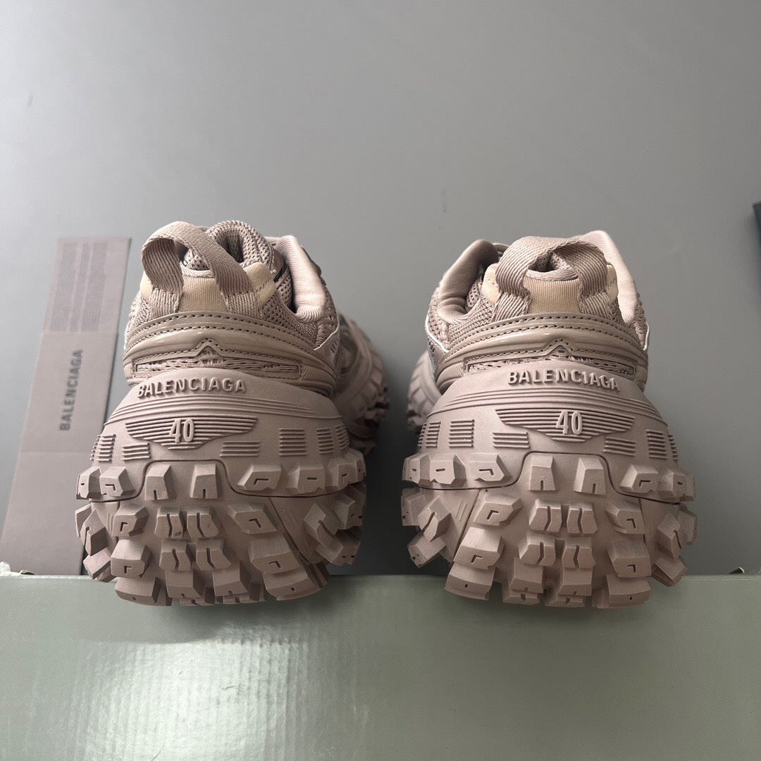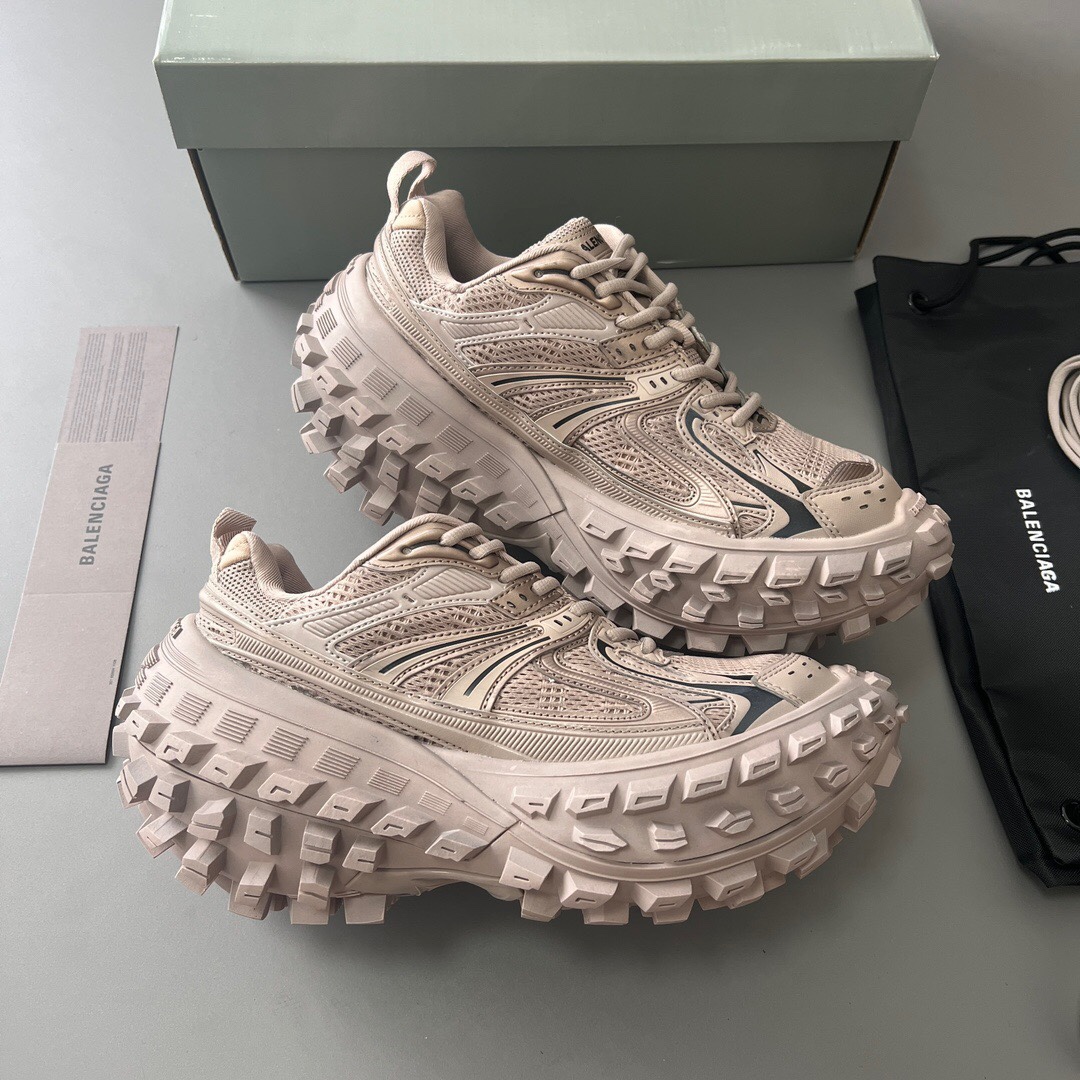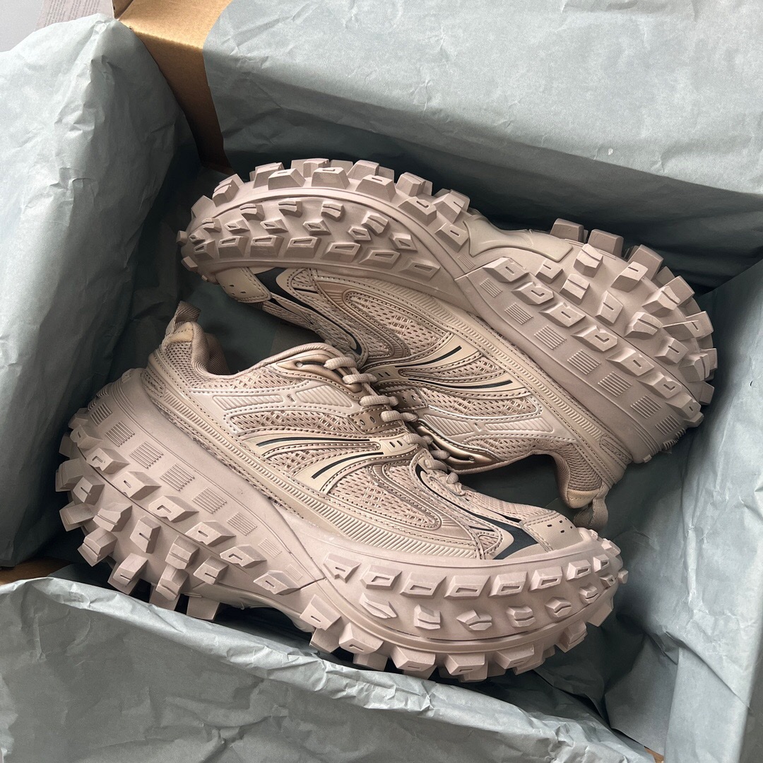 Pure original Balenciaga Defender "Parisian family tire shoes" in "light brown". Developed from original factory archives, with original box and labels. The original factory lasts create an authentic shape, using original factory materials, excluding leather, nylon, and mesh fabric. Features a worn effect, exaggerated tire tread sole, 5 mm arch, Balenciaga brand logo debossed on the tongue, Balenciaga logo and size debossed on the toe edge and heel counter, and a pull tab on the heel counter. Official accessories are synchronized, all details and craftsmanship are fully compared to the original shoes, ensuring 100% authenticity when worn.
