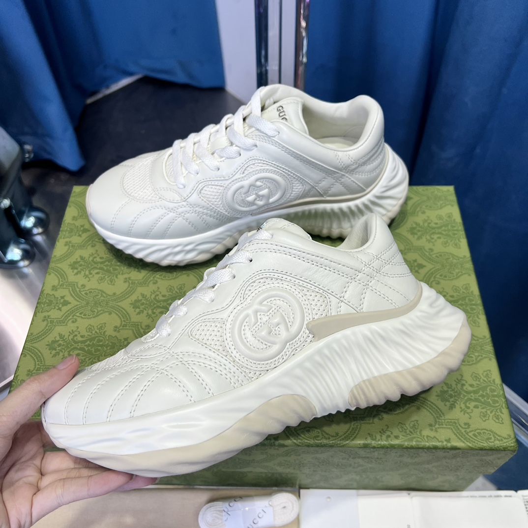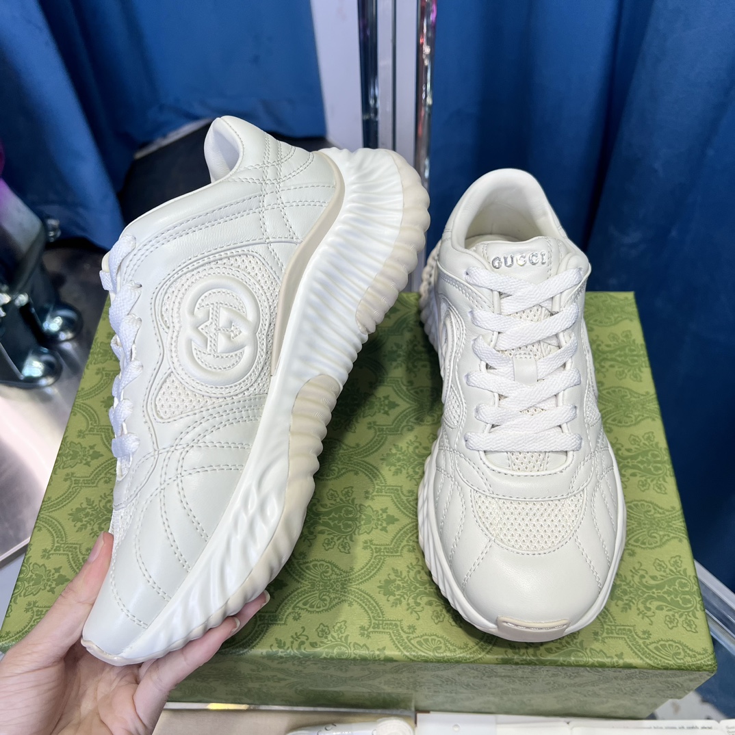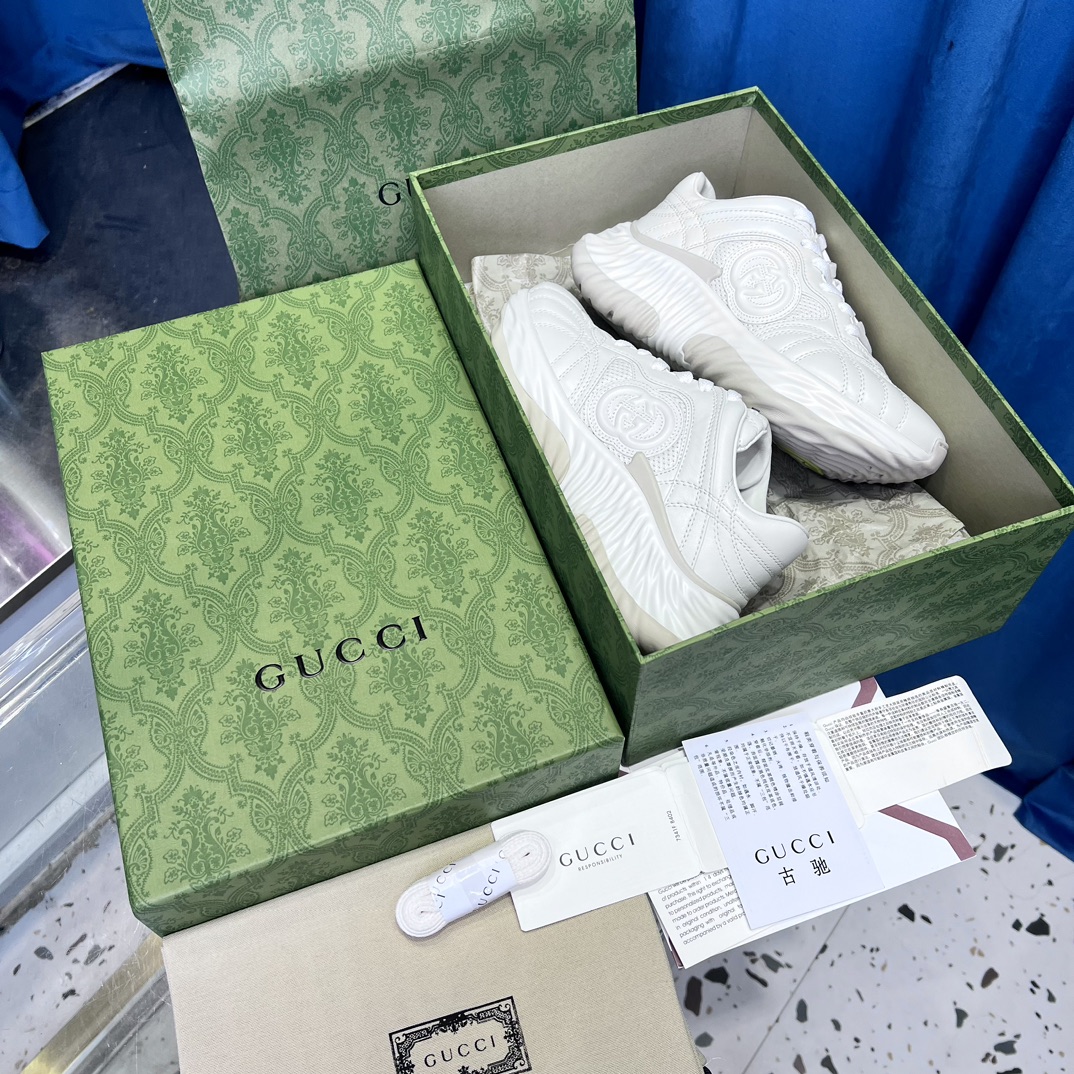 Original version purchased for development and production. Gucci Ripple series sneakers use innovative stitching techniques to create a fluid, water-like texture. The leather design is paired with three-dimensional interlocking double G leather appliqués and Gucci letter metal accessories, achieving a free-flowing texture with 3D effects for the entire shoe.