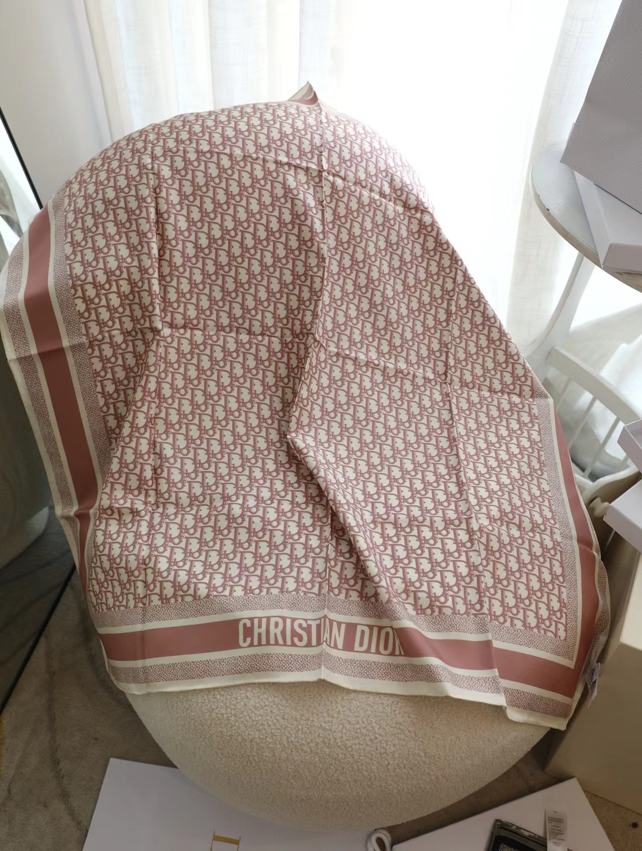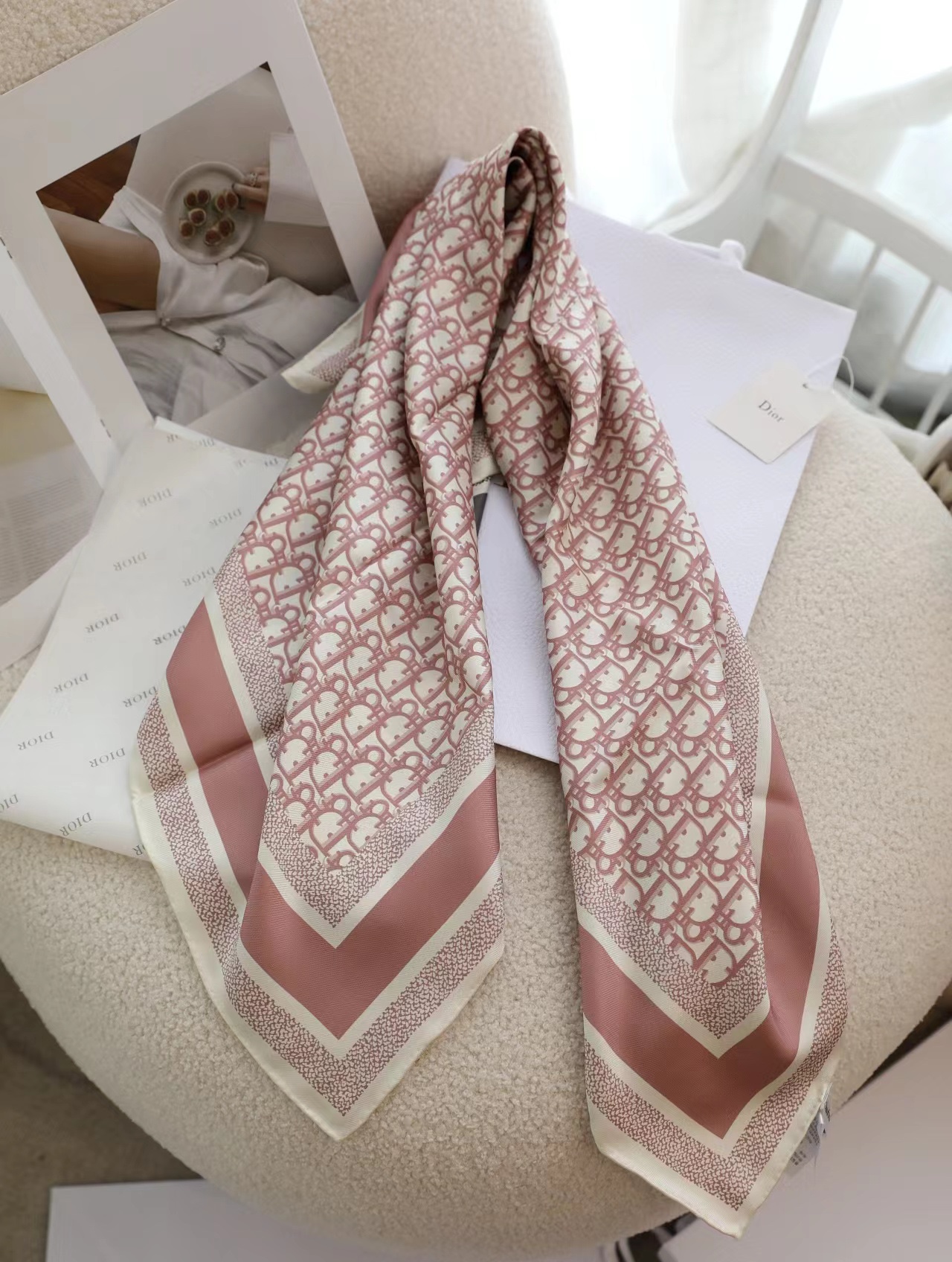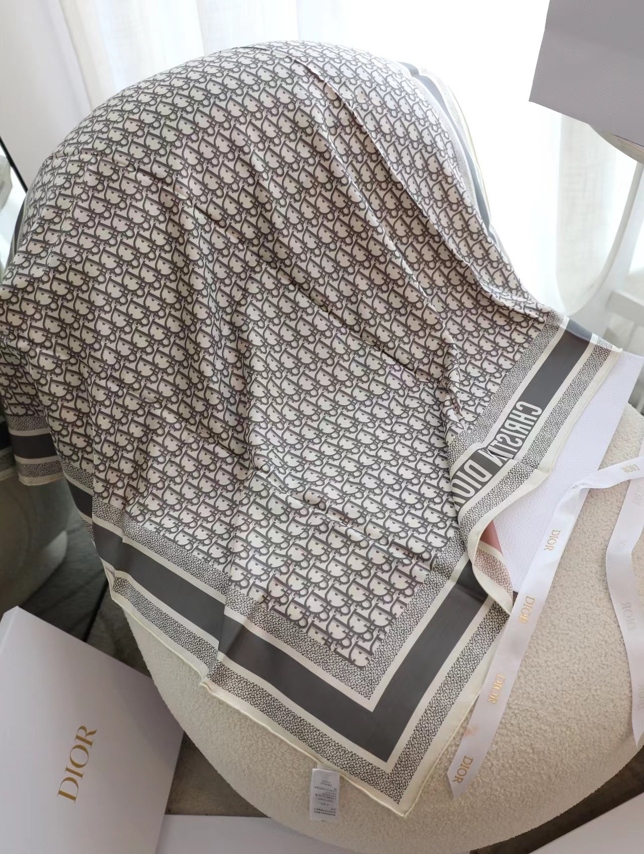 .18-momme D boutique classic main style [D vintage double-sided 90] silk scarf. This D**rtwin scarf features a two-color double-sided design, paying tribute to the iconic Obique print. It is meticulously crafted from mulberry silk twill fabric and adorned with hand-stitched edge trim, all embellished with jacquard striped patterns in different tones of the "Christian D**r" logo.