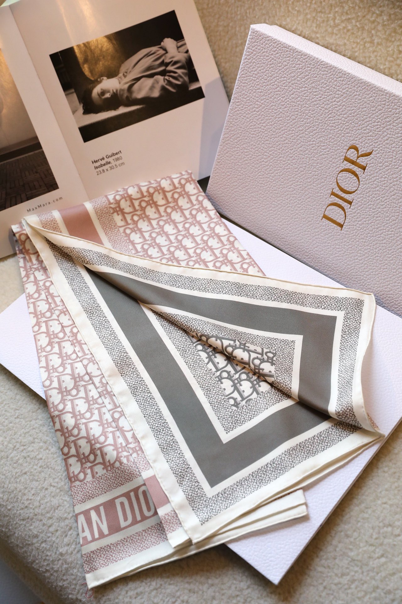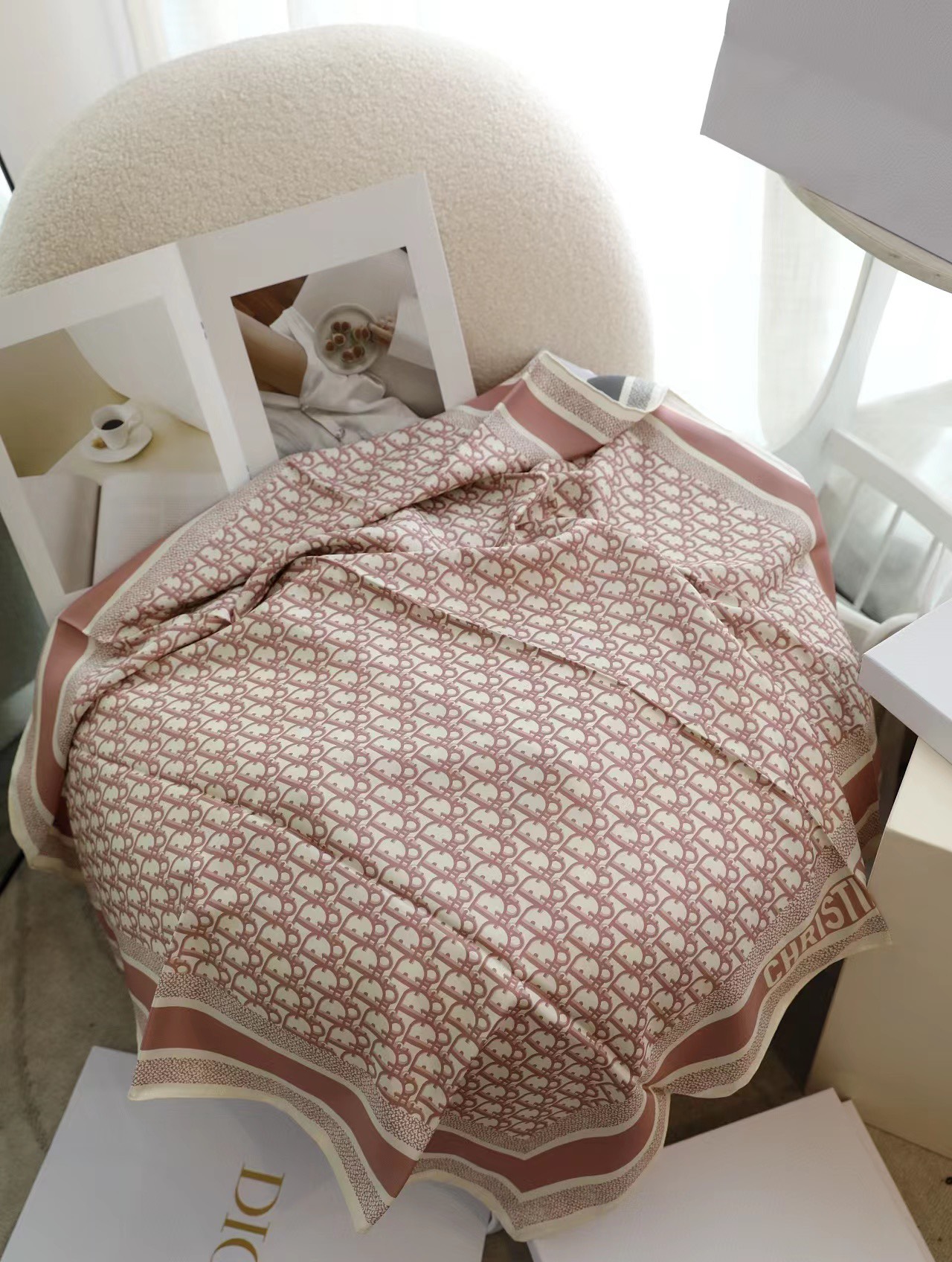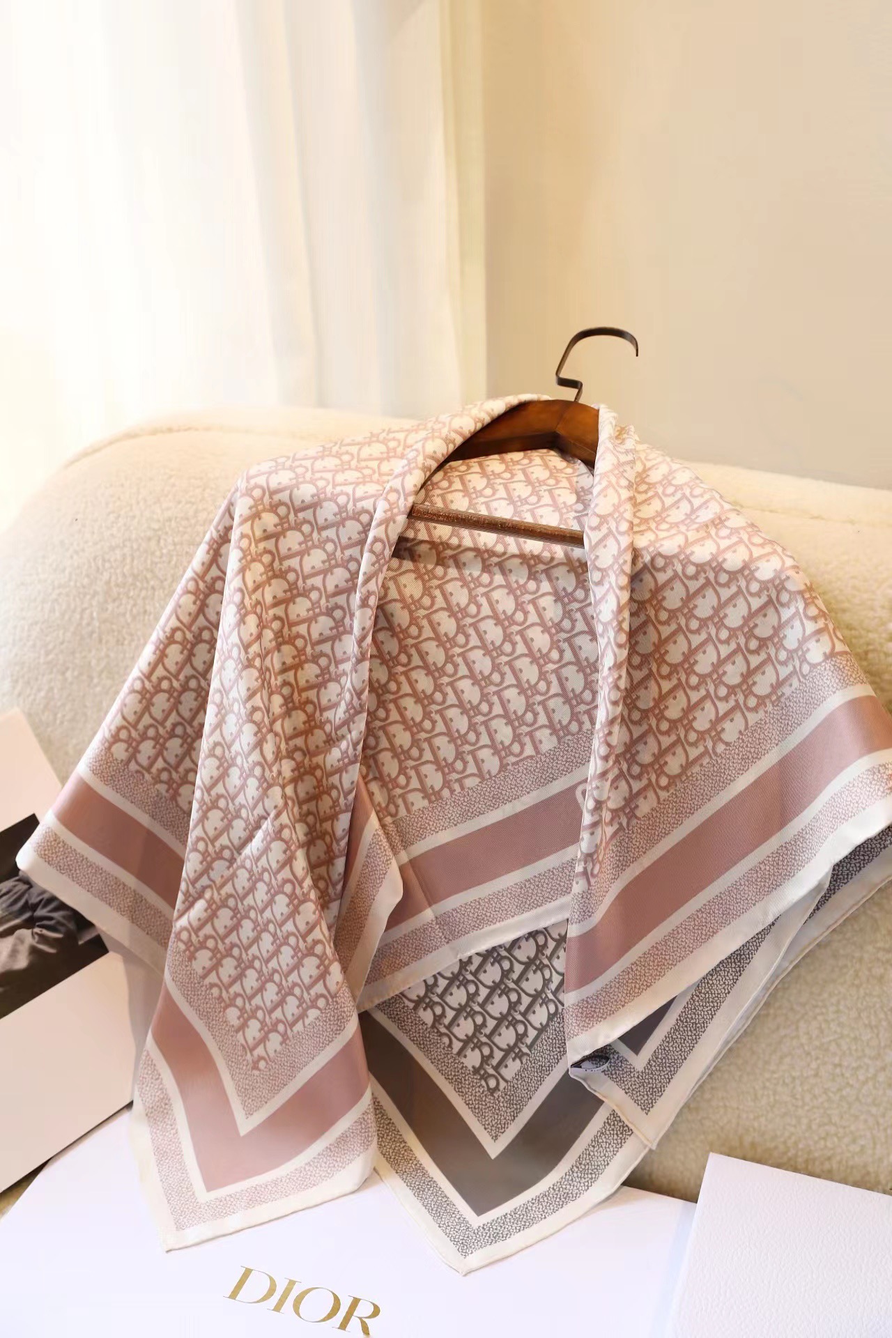 .18-momme D boutique classic main style [D vintage double-sided 90] silk scarf. This D**rtwin scarf features a two-color double-sided design, paying tribute to the iconic Obique print. It is meticulously crafted from mulberry silk twill fabric and adorned with hand-stitched edge trim, all embellished with jacquard striped patterns in different tones of the "Christian D**r" logo.