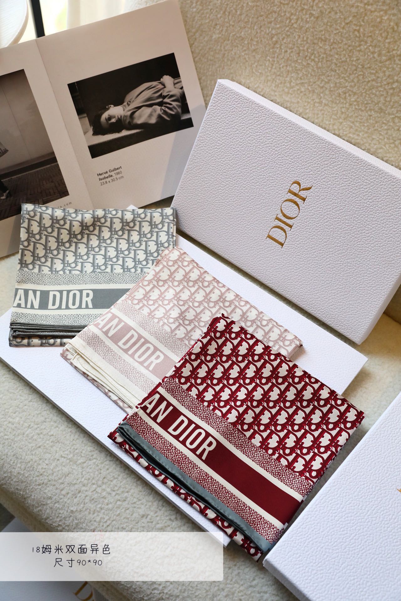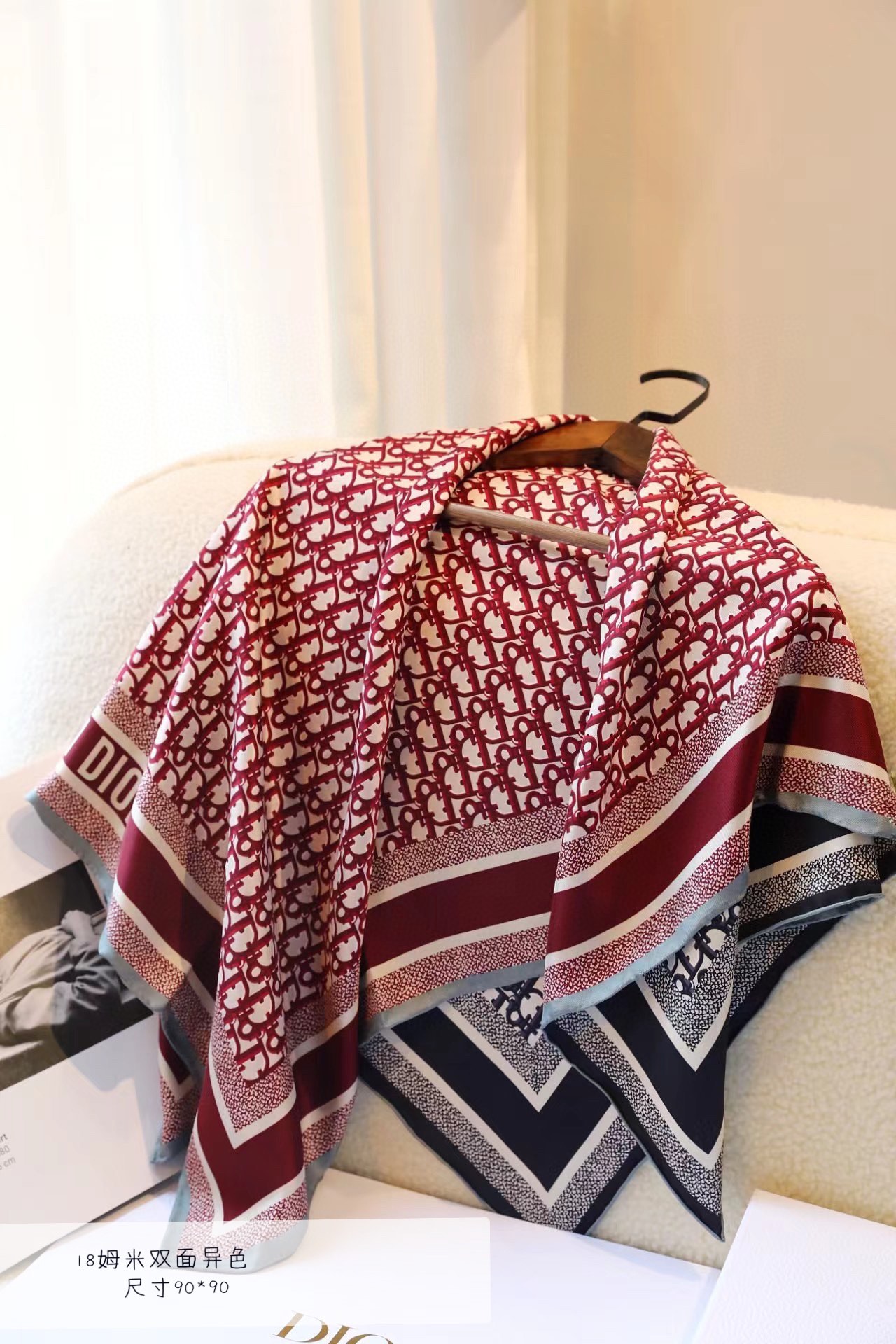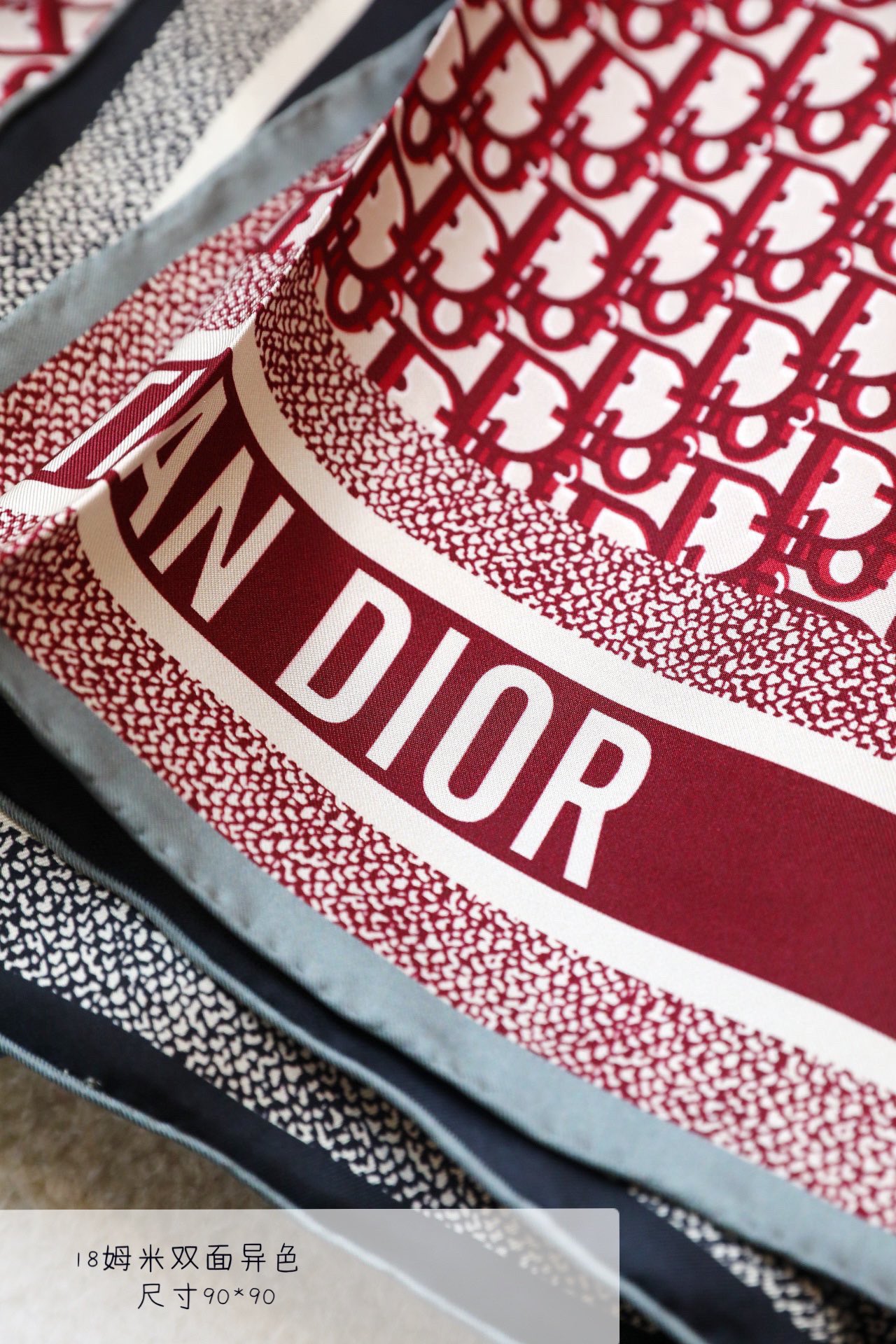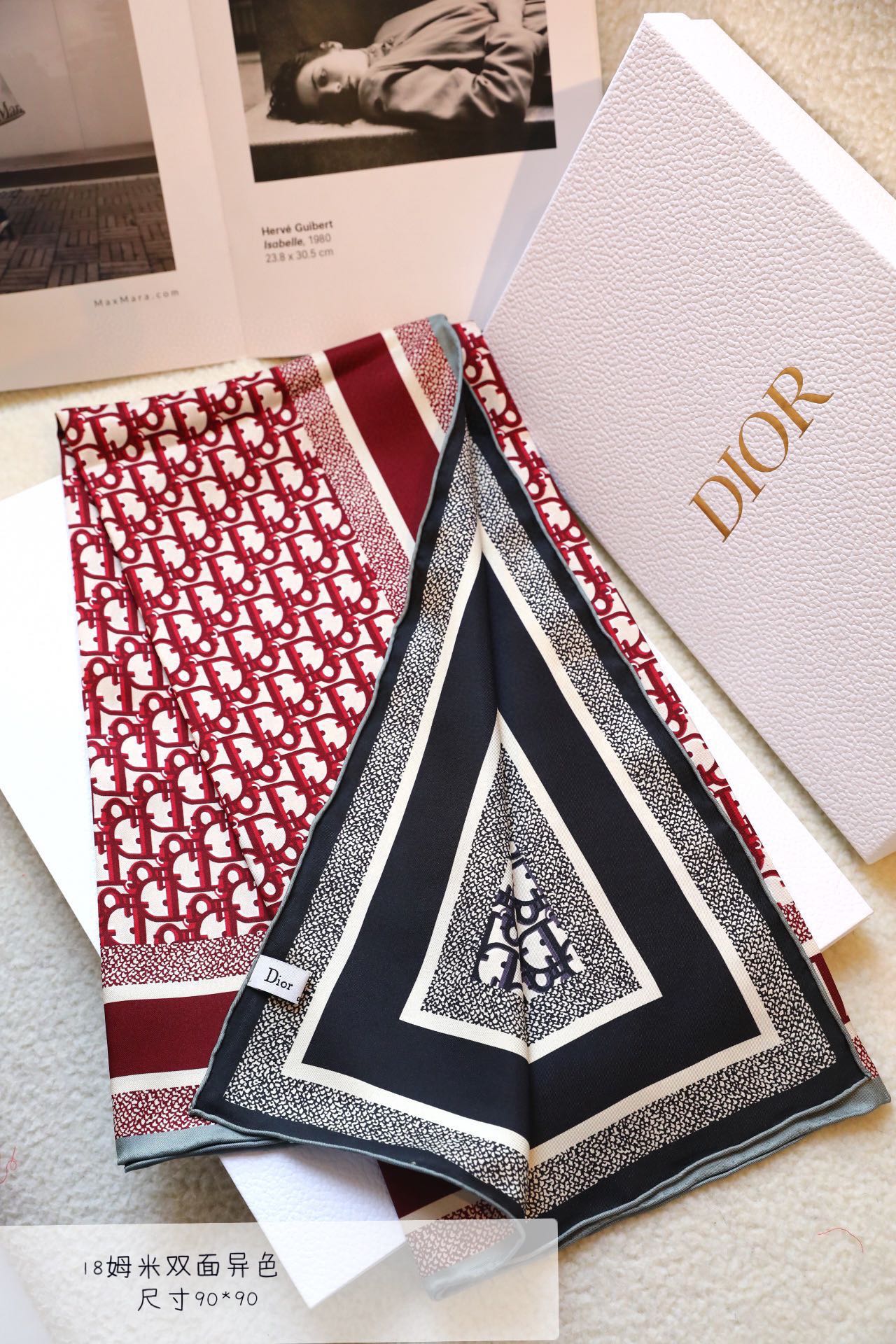 New This 18-momme D**rtwin square scarf features a two-tone double-sided design, highlighting the iconic O**ique print. Meticulously crafted from silk twill fabric with hand-rolled hem trim, one side is burgundy and the other navy blue, both adorned with a tonal "CHRISTI** DIOR" logo jacquard stripe pattern. Can be tied around the neck or worn as a headscarf to create a Dior-inspired look.