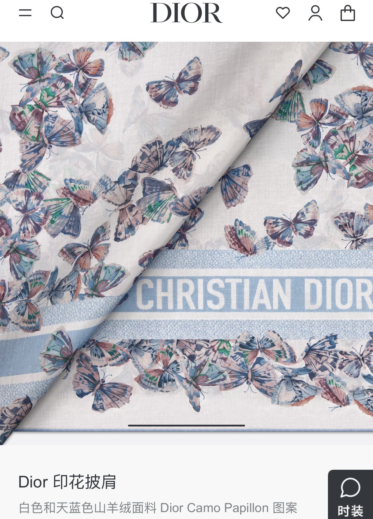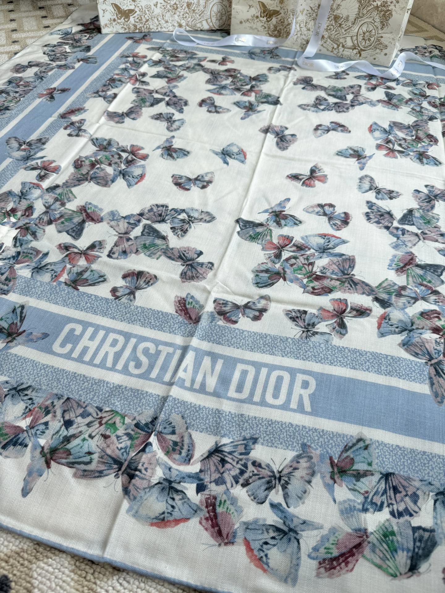 This shawl features the Camo Papillon pattern, offering a fresh and elegant reinterpretation of the butterfly theme with a poetic design. Meticulously crafted from white and sky blue cashmere fabric, it showcases hand-rolled edges and contrasting sky blue printed stripes adorned with butterflies and the Christian D logo. Stylish and sophisticated, it can be tied around the neck or draped over the shoulders.