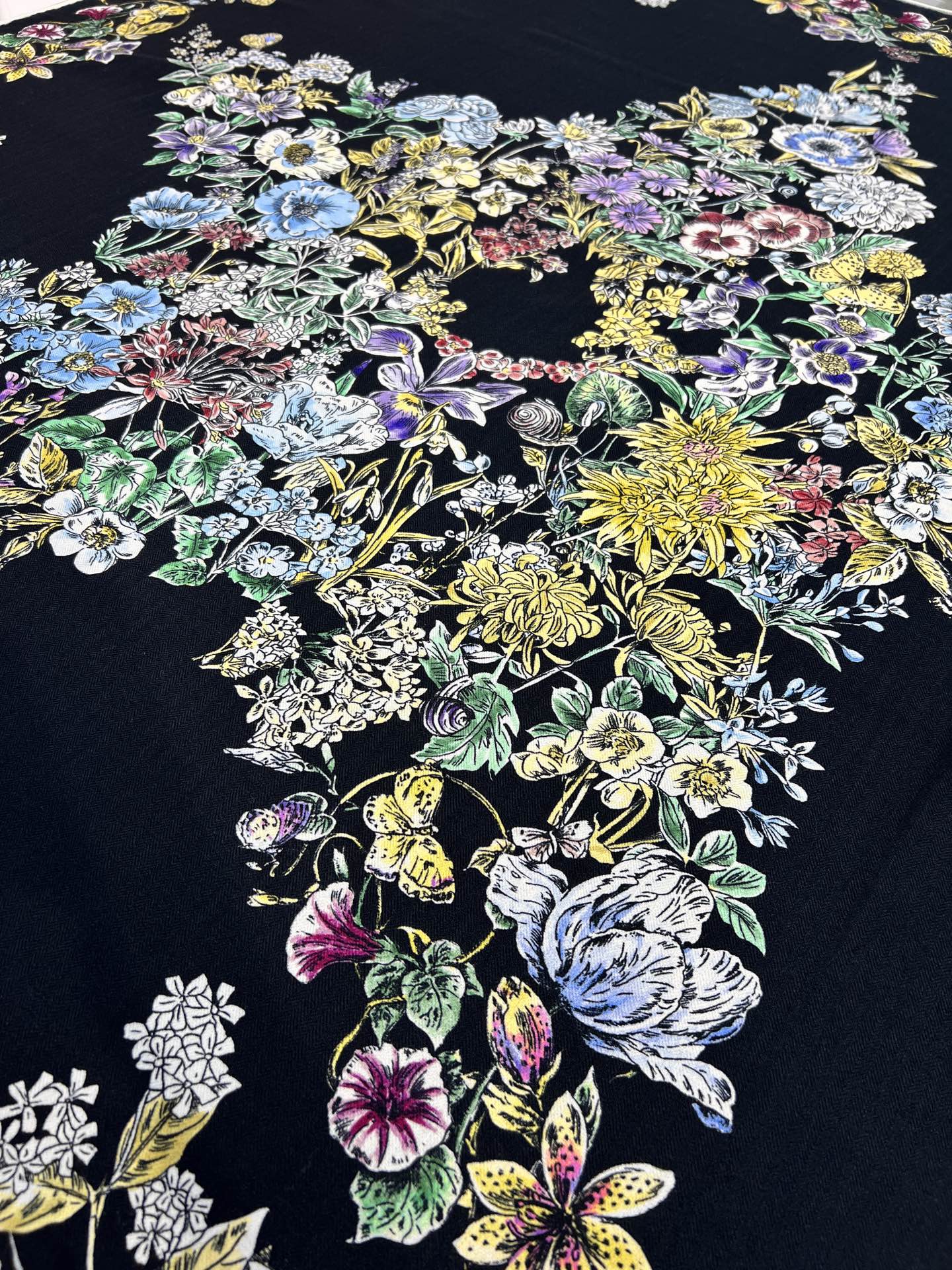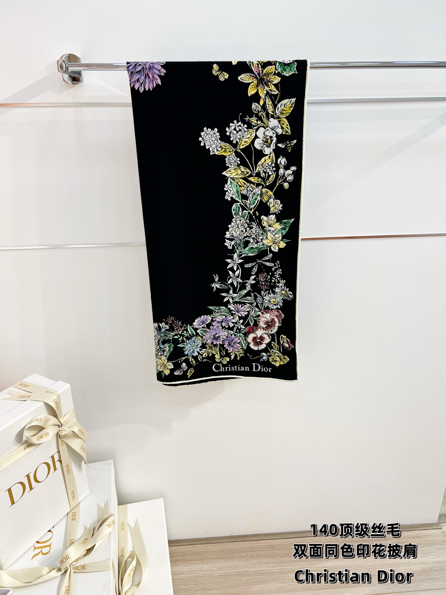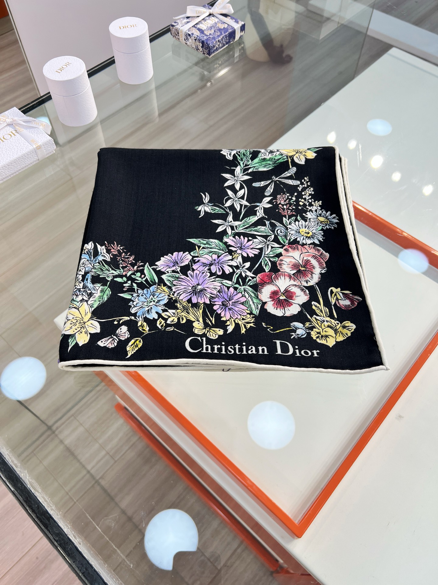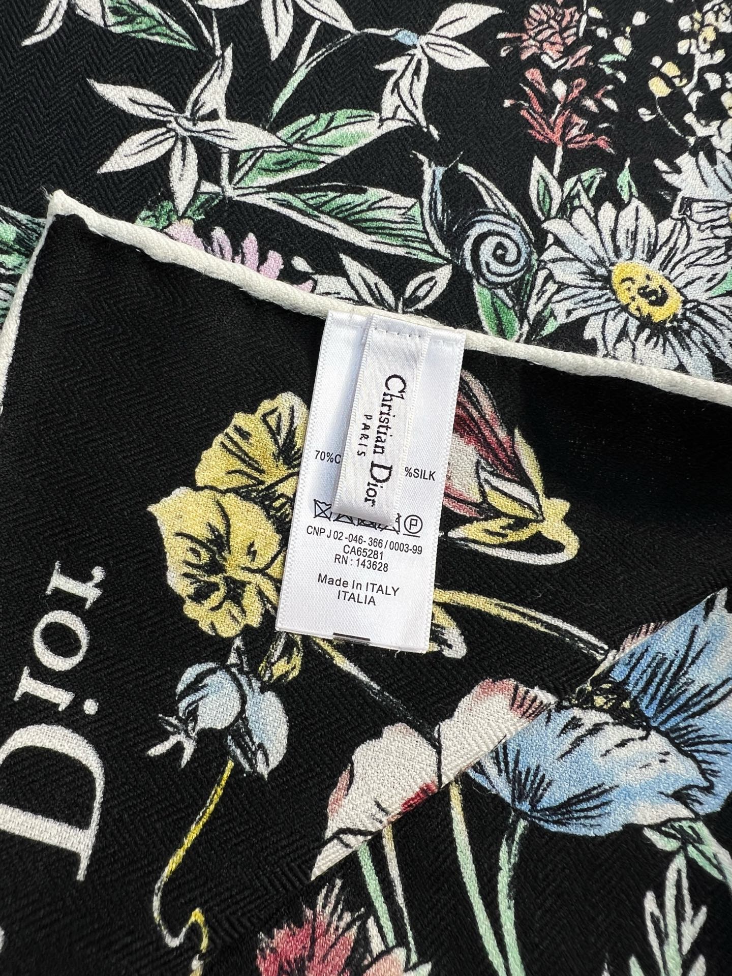 This scarf features the Dior Star pattern, presenting Dior's lucky star, and reinterprets Monsieur Dior's talisman through the exquisite floral theme of this collection. Meticulously crafted from silk-wool fabric, it boasts a double-sided design adorned with contrasting hand-rolled edges, each enhanced with the Christian Dior logo for elevated style. It can be tied around the neck or worn as a headscarf to create a modern look.