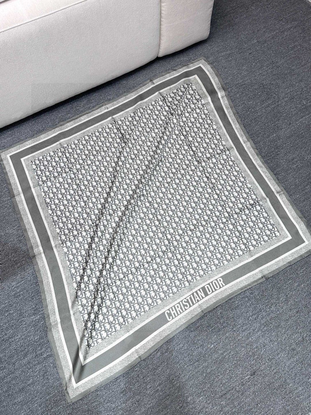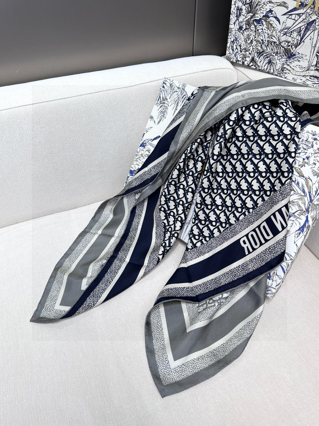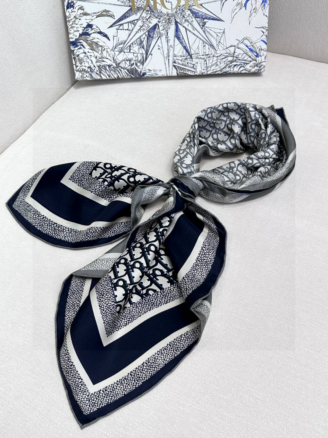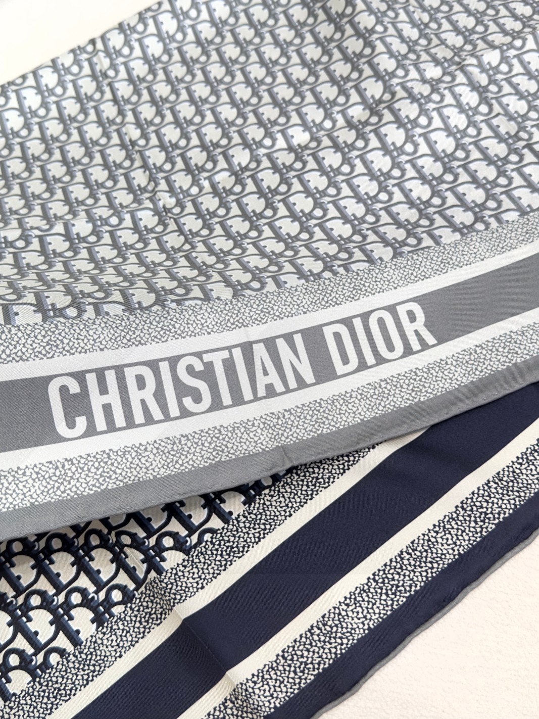 This Dior twin scarf features a two-color double-sided design, paying tribute to the iconic Oblique print. It is meticulously crafted from mulberry silk twill fabric and adorned with hand-stitched edging. One side is gray, and the other is navy blue, both embellished with a tonal "Christian Dior" logo jacquard stripe pattern. It can be tied around the neck or head to create a dazzling runway-style look, perfect for vacations and daily wear.