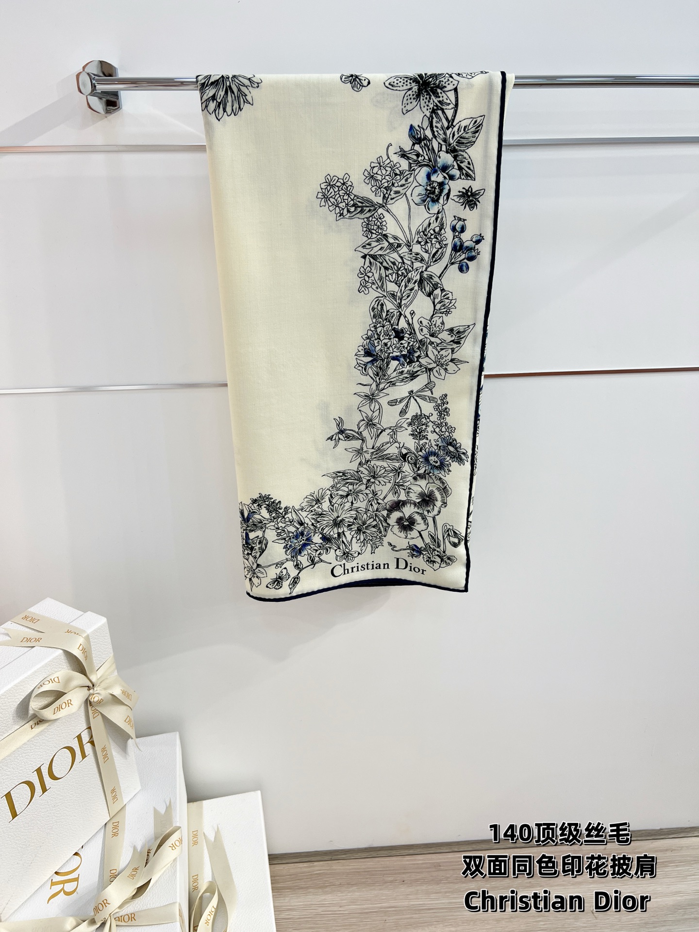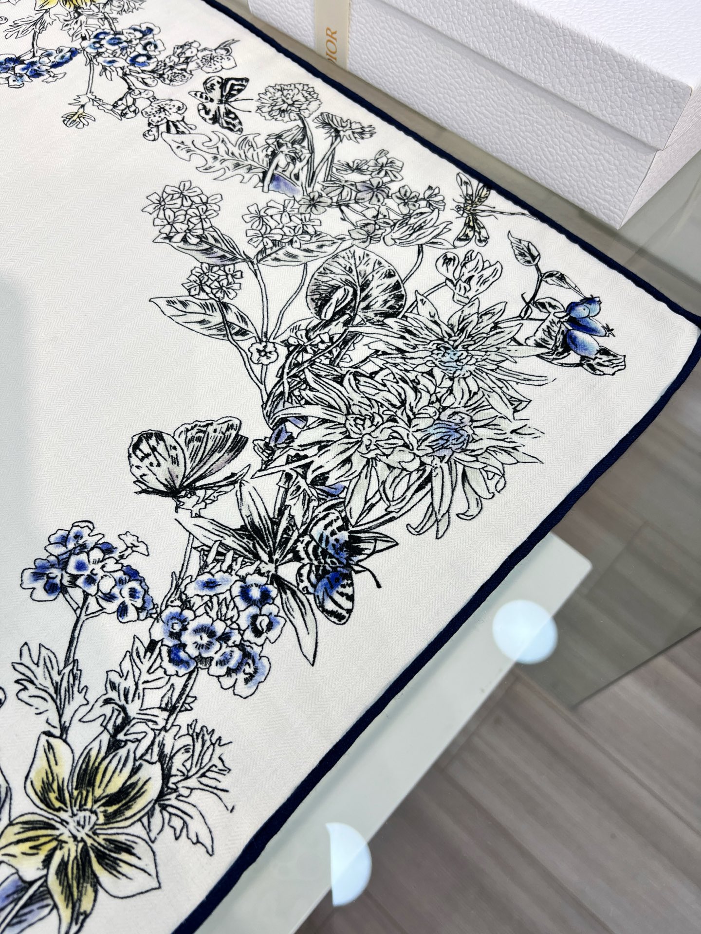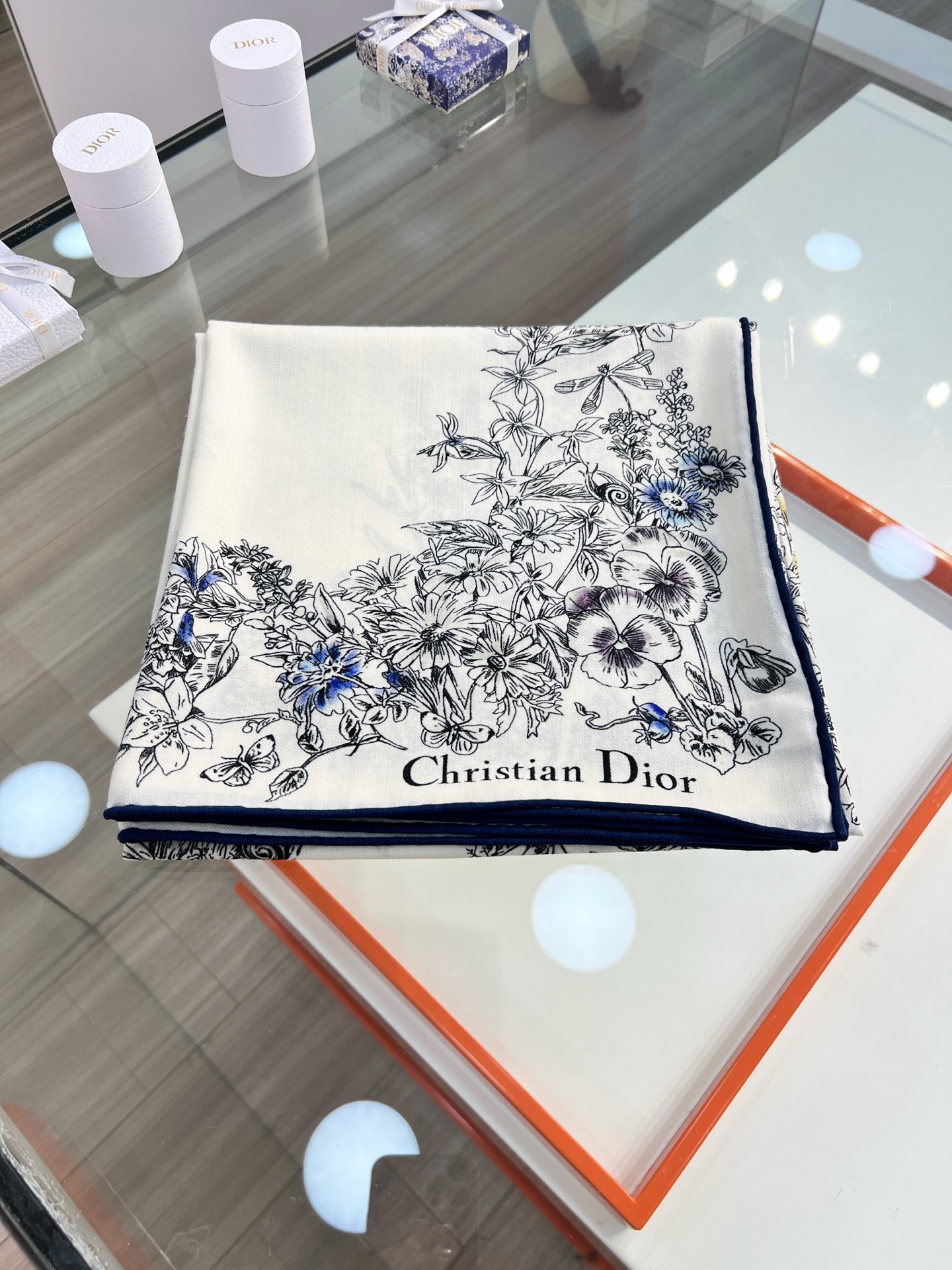 This scarf features the Dior Star pattern, presenting Dior's lucky star, and reinterprets Monsieur Dior's talisman through the exquisite floral theme of this collection. Meticulously crafted from silk-wool fabric, it boasts a double-sided design adorned with contrasting hand-rolled edges, all elevated with the Christian Dior logo. It can be tied around the neck or worn as a headscarf to create a modern look.