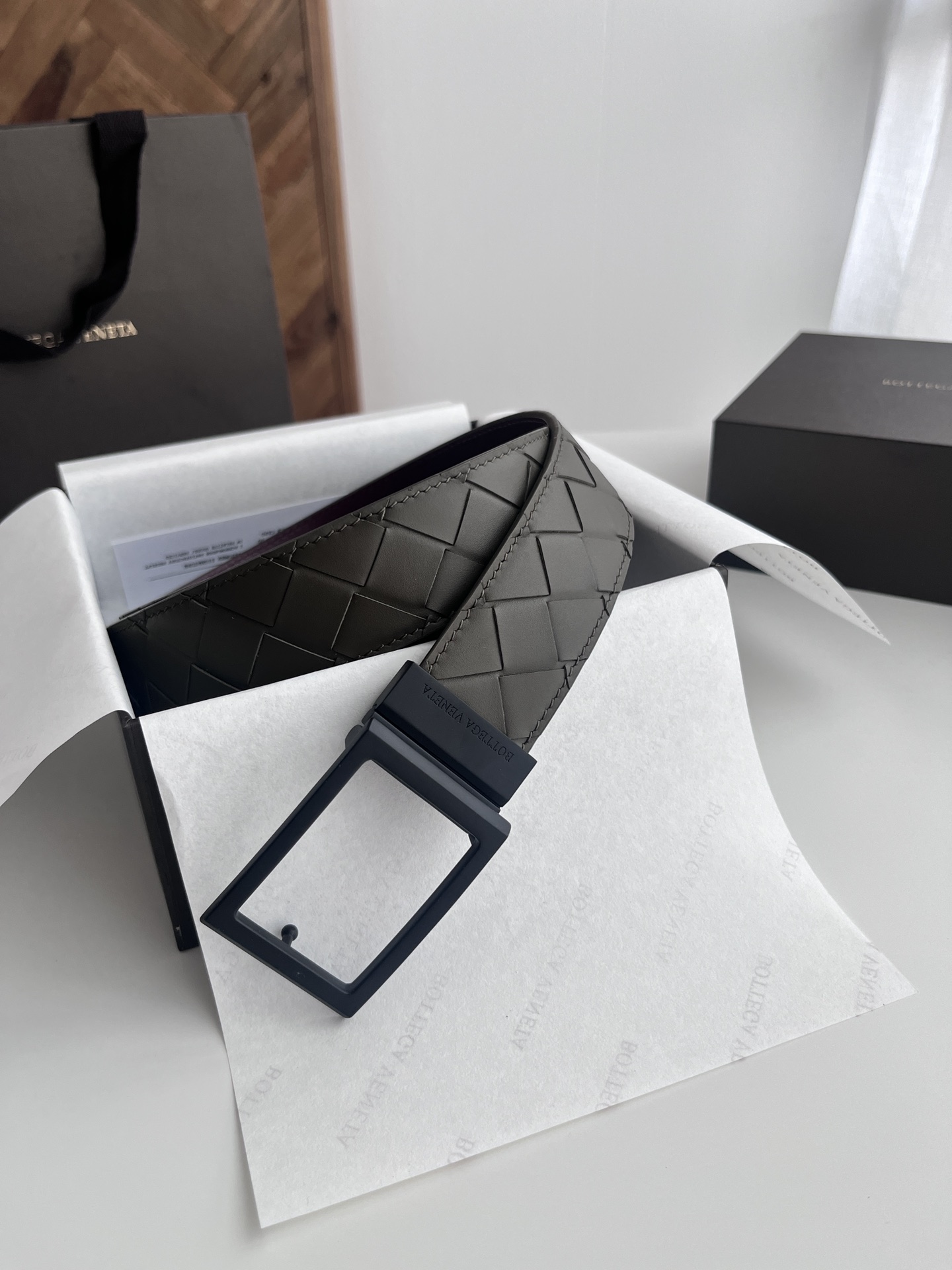 Bv latest men's woven belt, double-sided, pure hand intreccio large grid weaving, double-sided Italian calfskin with vacuum gun color rotatable buckle, front with logo, width 35MM, color: military green + Barolo wine red