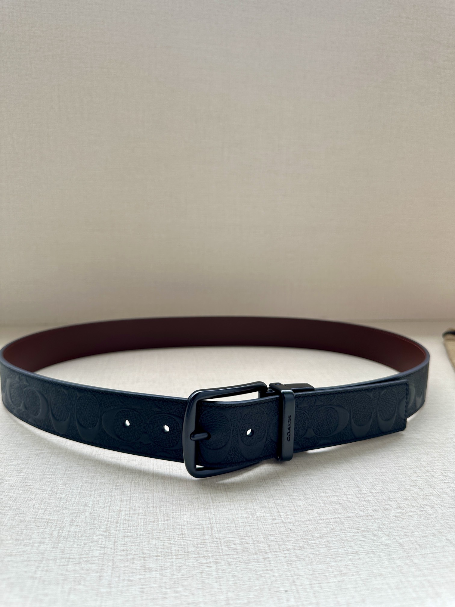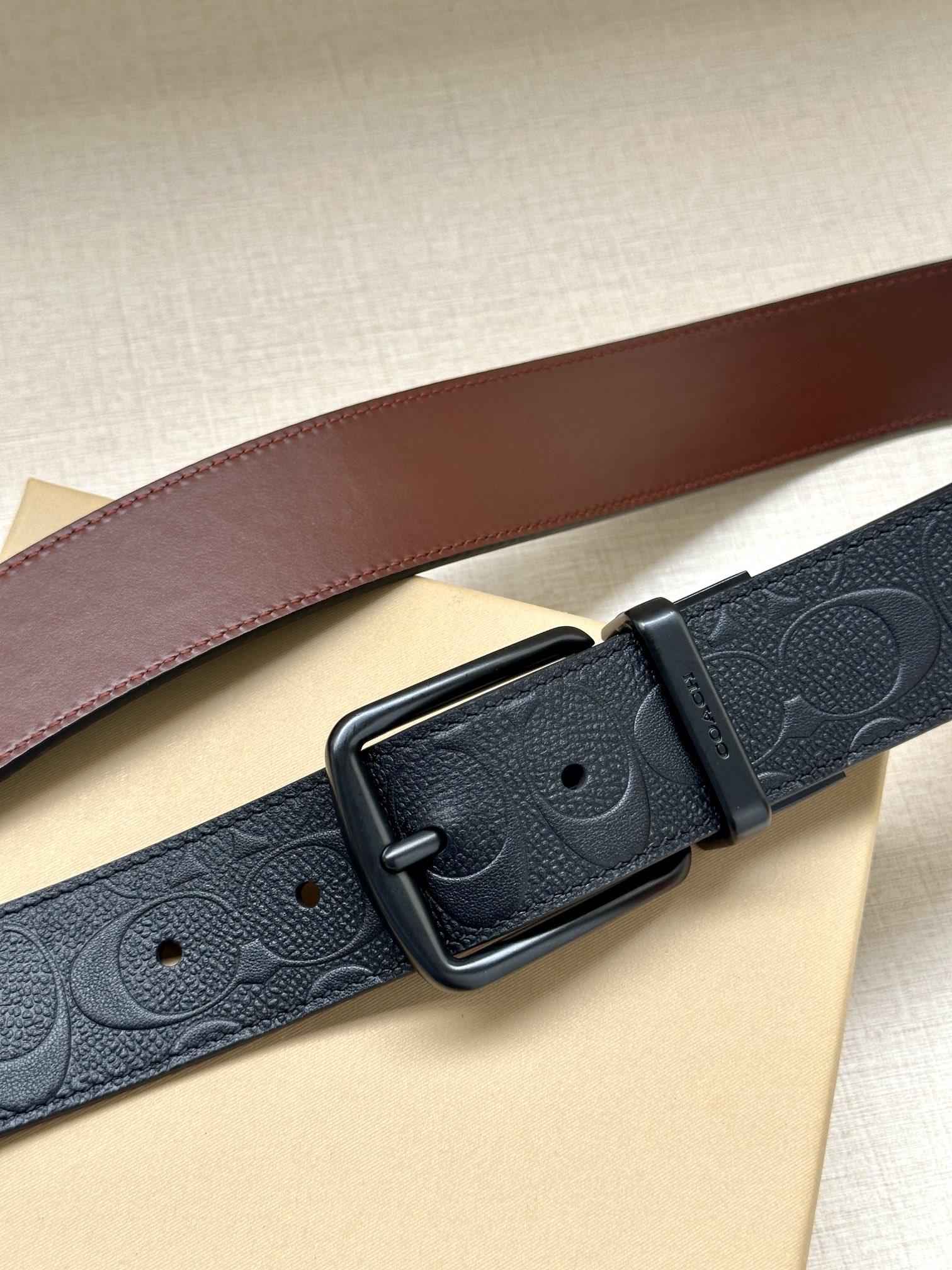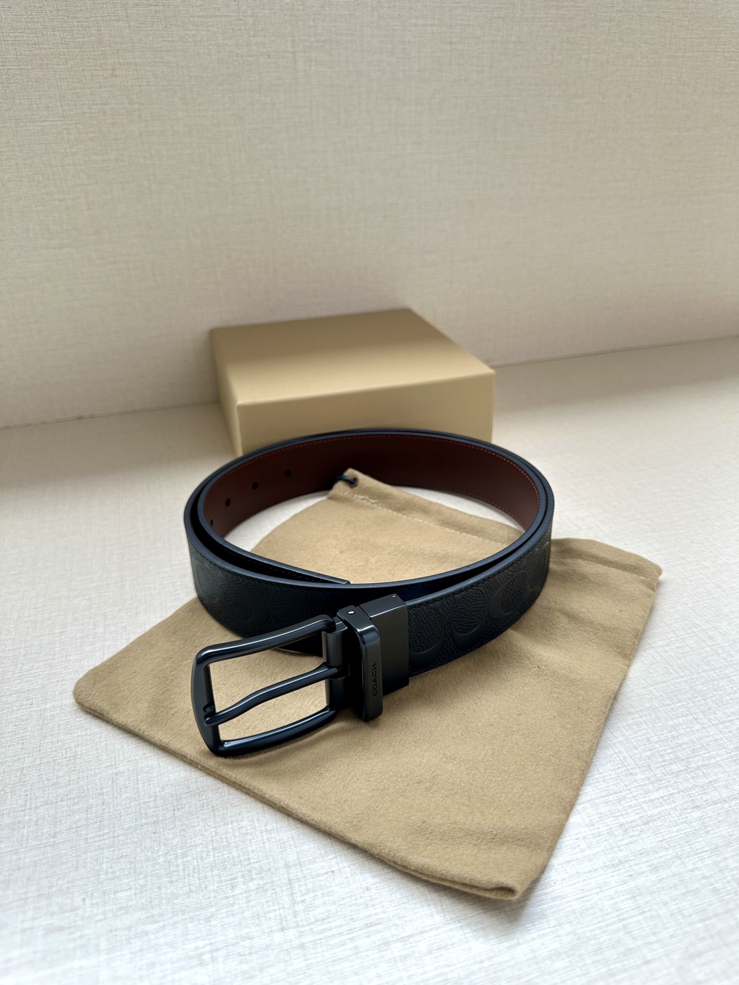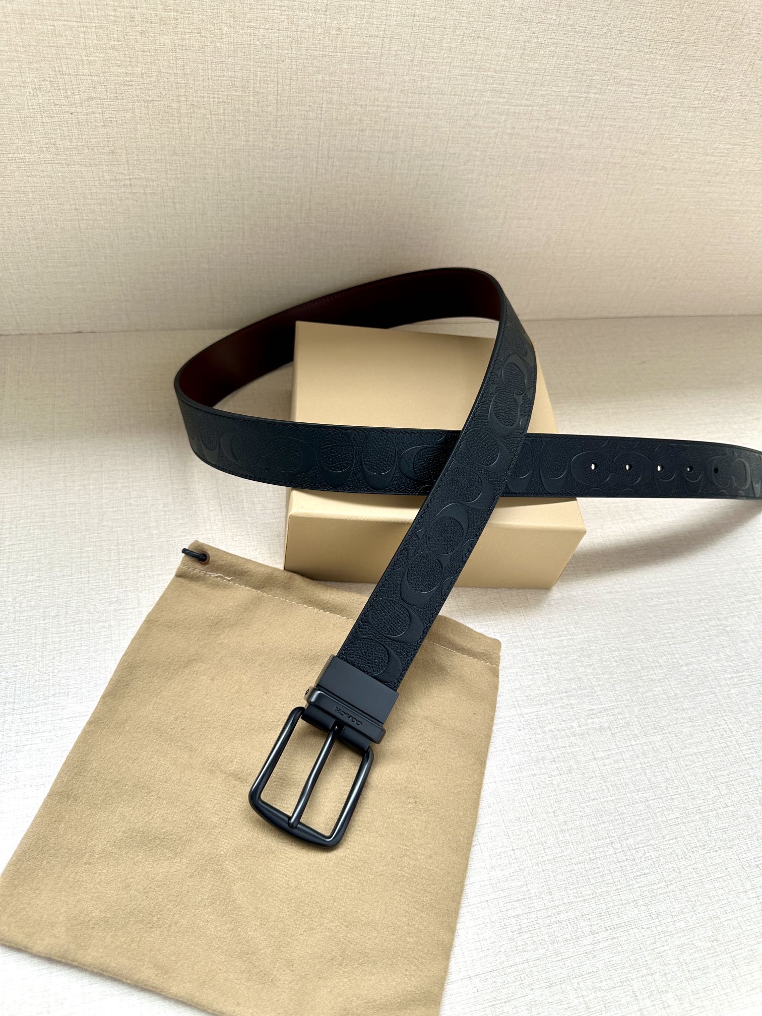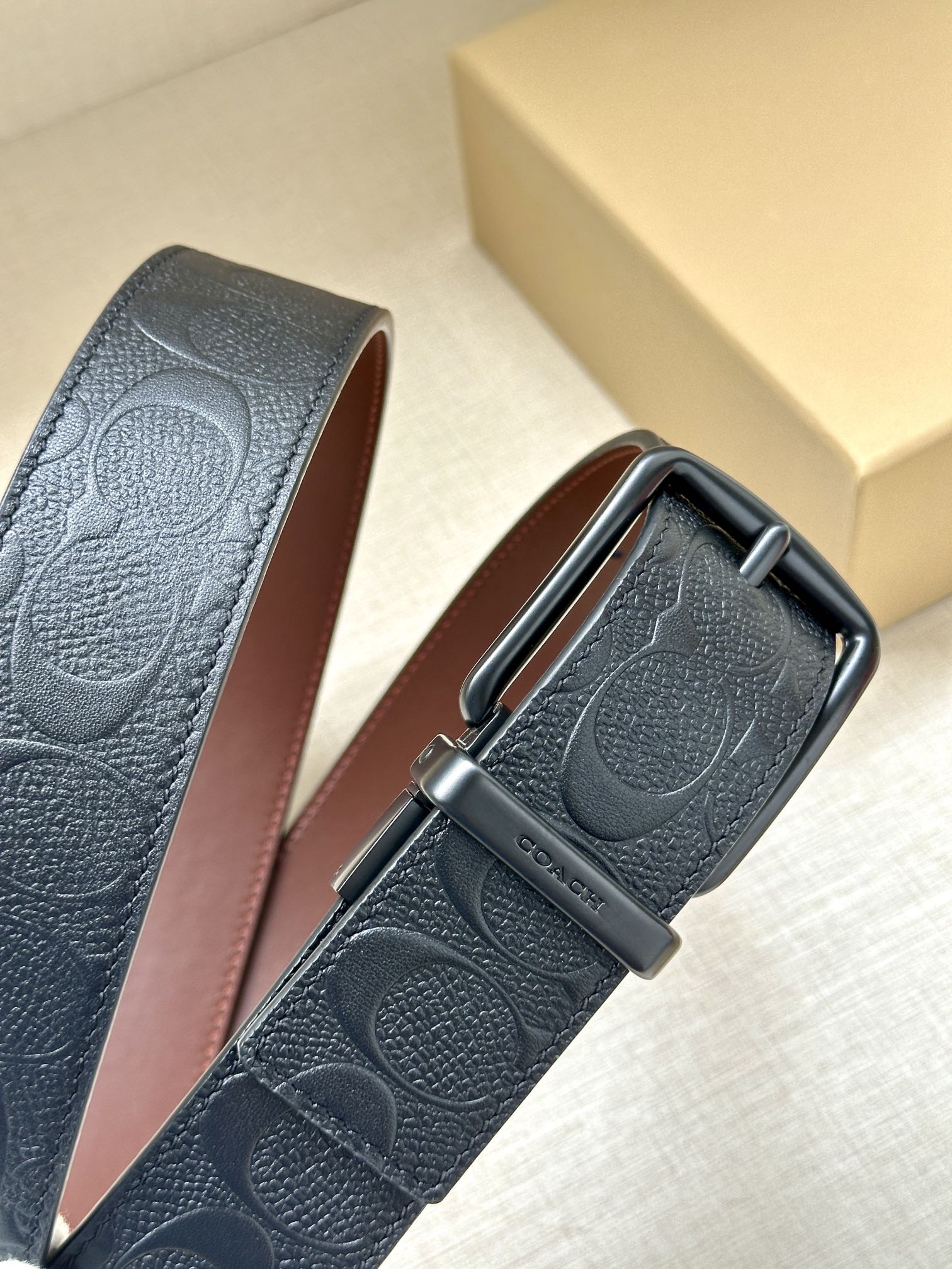Width 3.8cm COACH This two-sided reversible belt features a classic patterned logo material on one side and refined leather material on the other, equipped with a signature buckle that combines two styles into one. With simple instructions, it can be cut with scissors for a perfect fit.