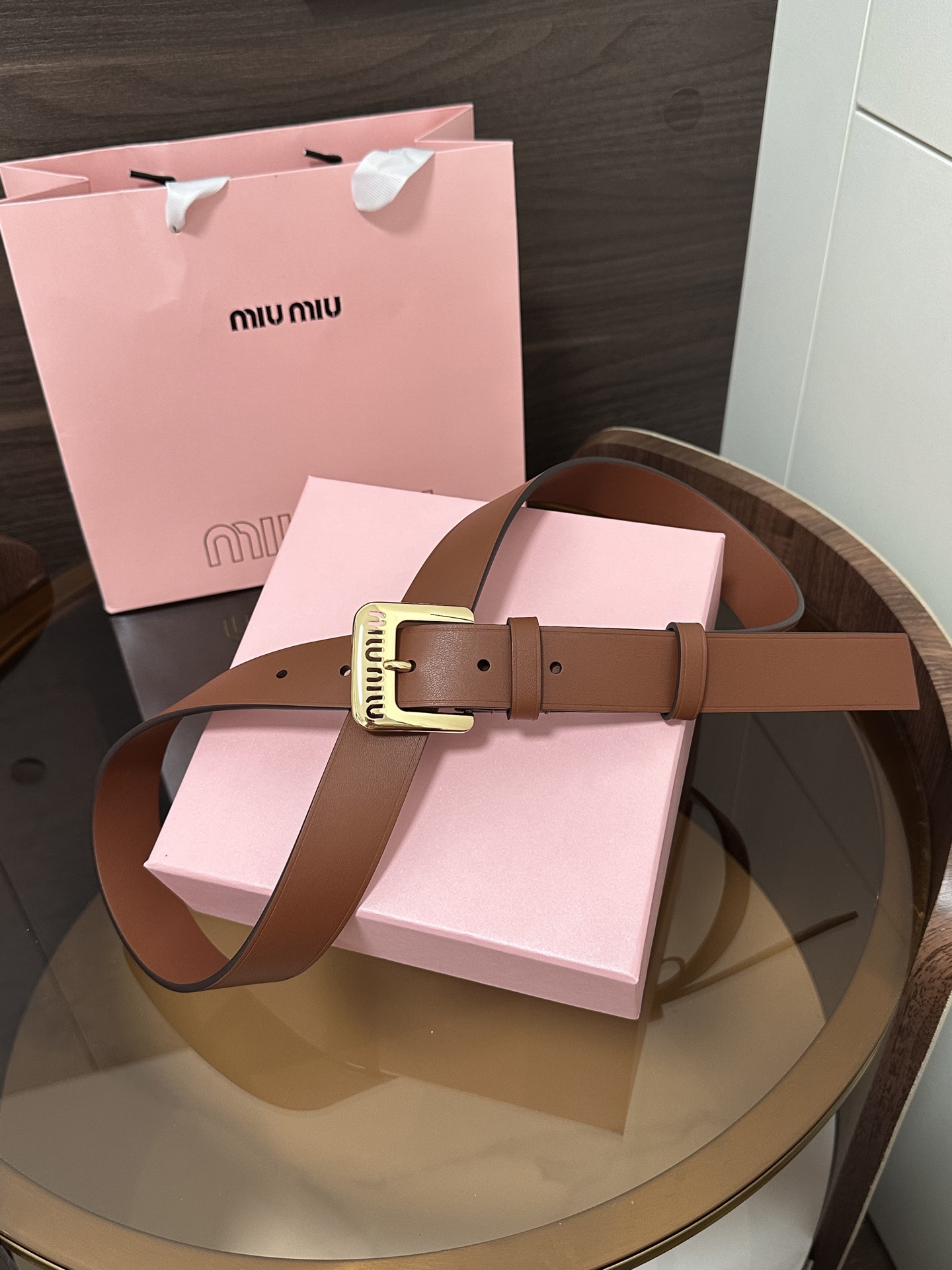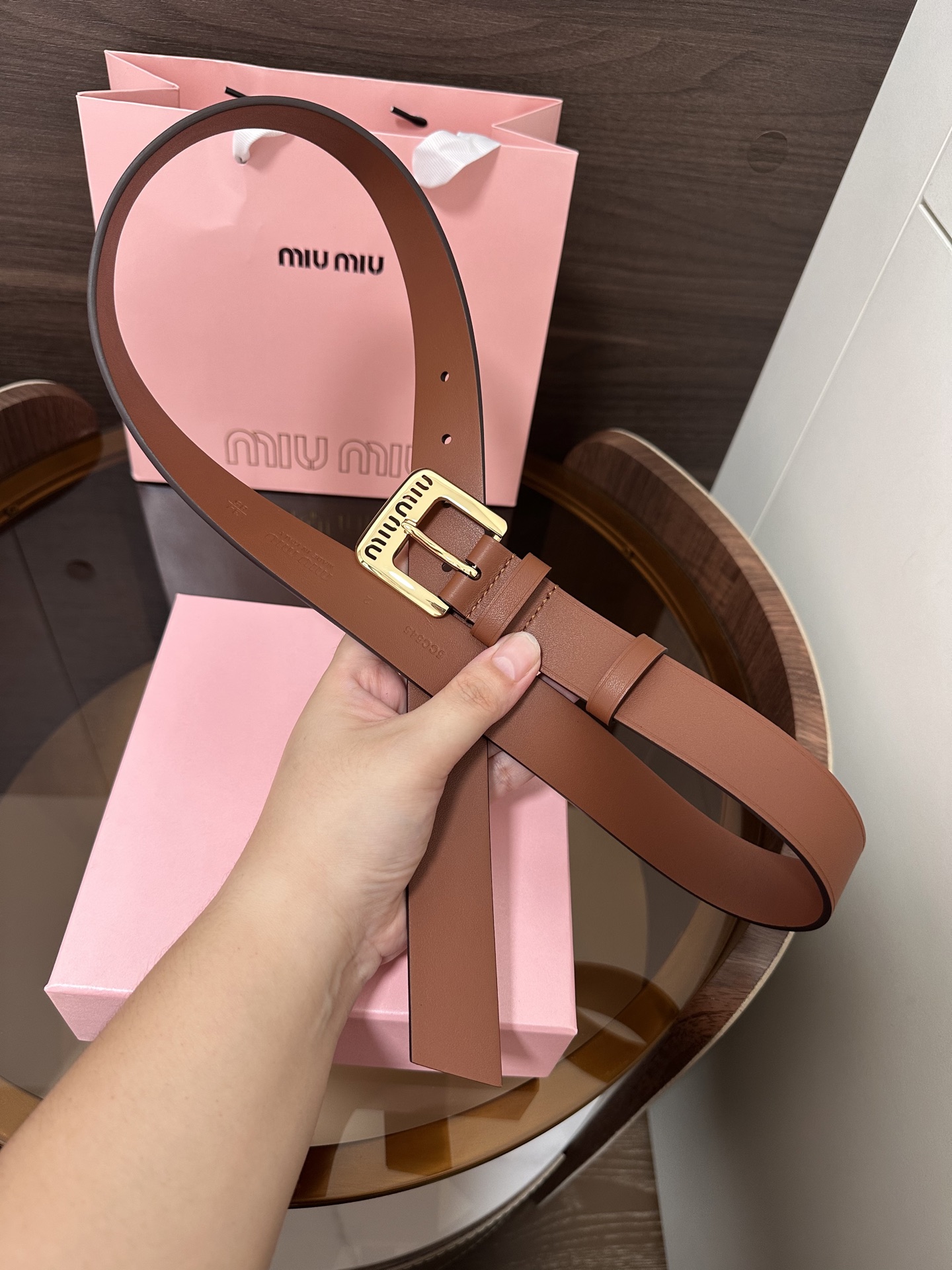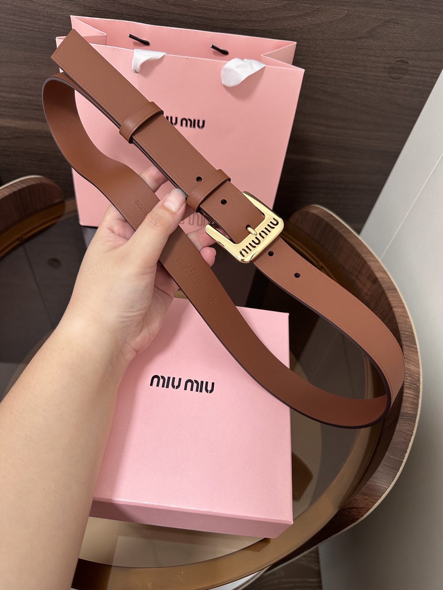M1UMIU This leather belt is the ideal choice to enhance your chic style taste. The striking engraved metal logo paired with a square pin buckle feels soft and delicate to the touch, very fashionable and versatile. Width 3.0cm
