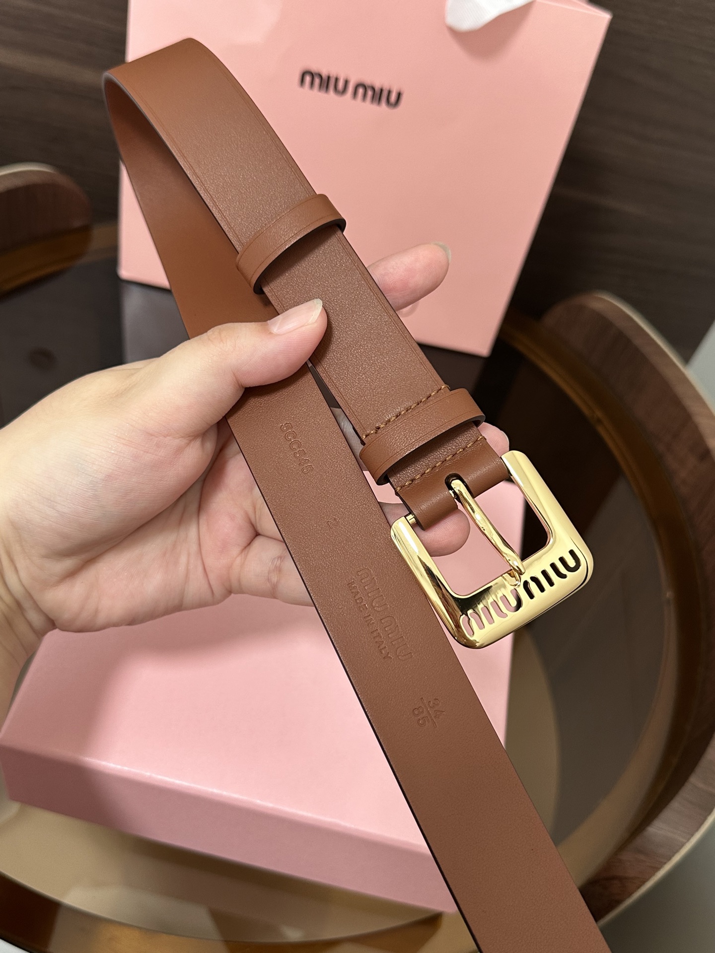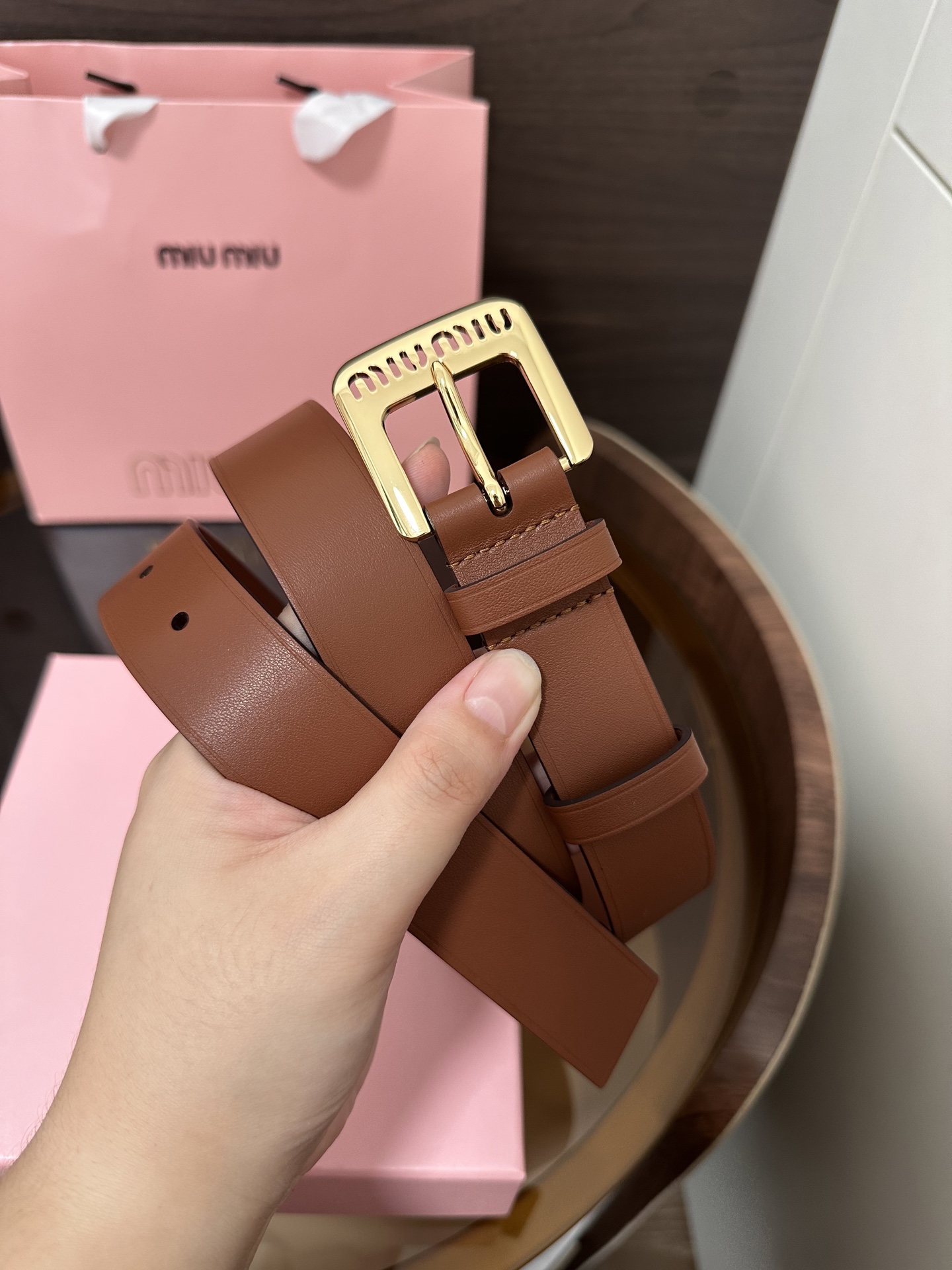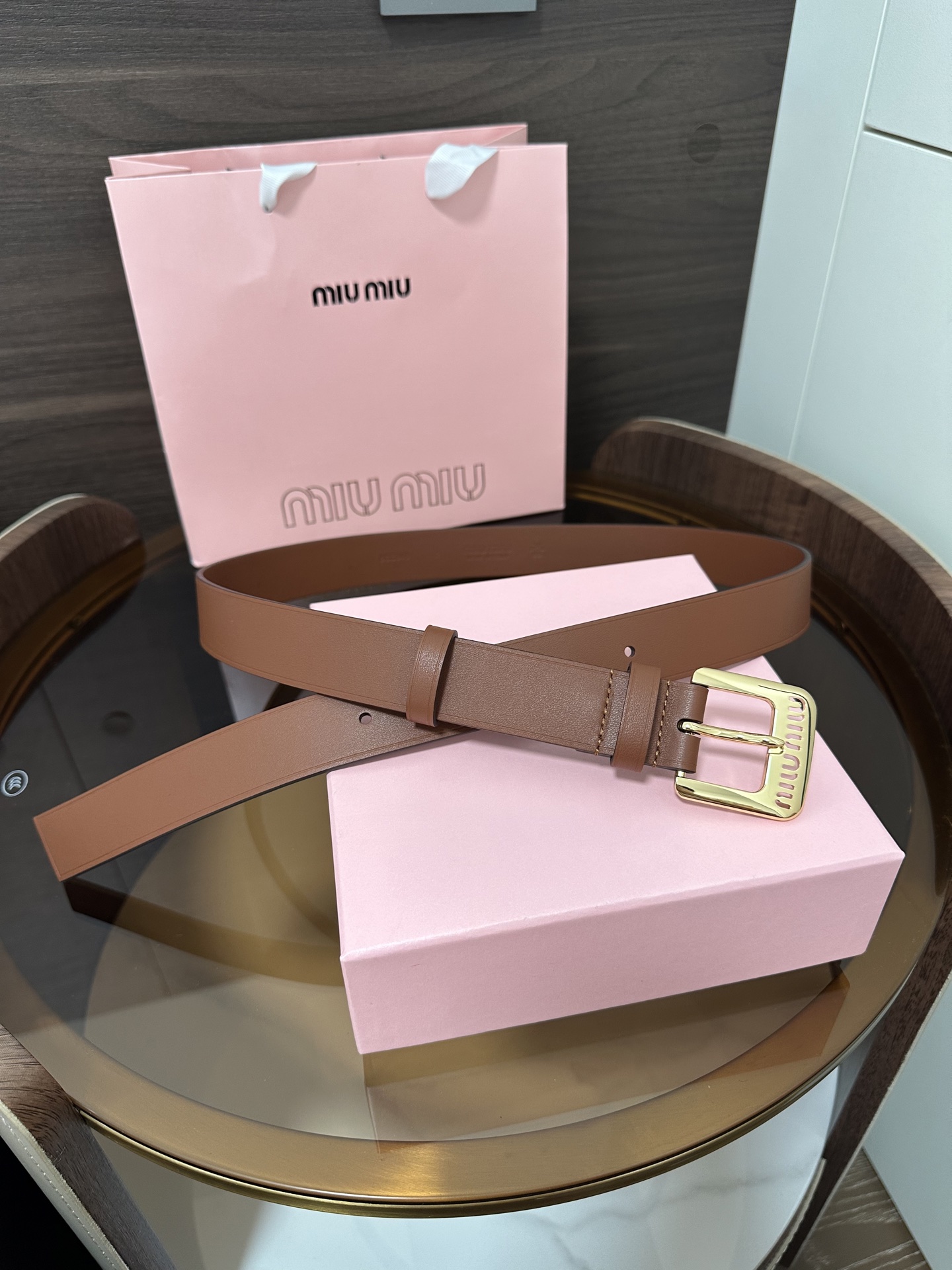 M1UMIU This leather belt is the ideal choice to enhance your chic style taste. The striking engraved metal logo paired with a square pin buckle feels soft and delicate to the touch, very fashionable and versatile. Width 3.0cm