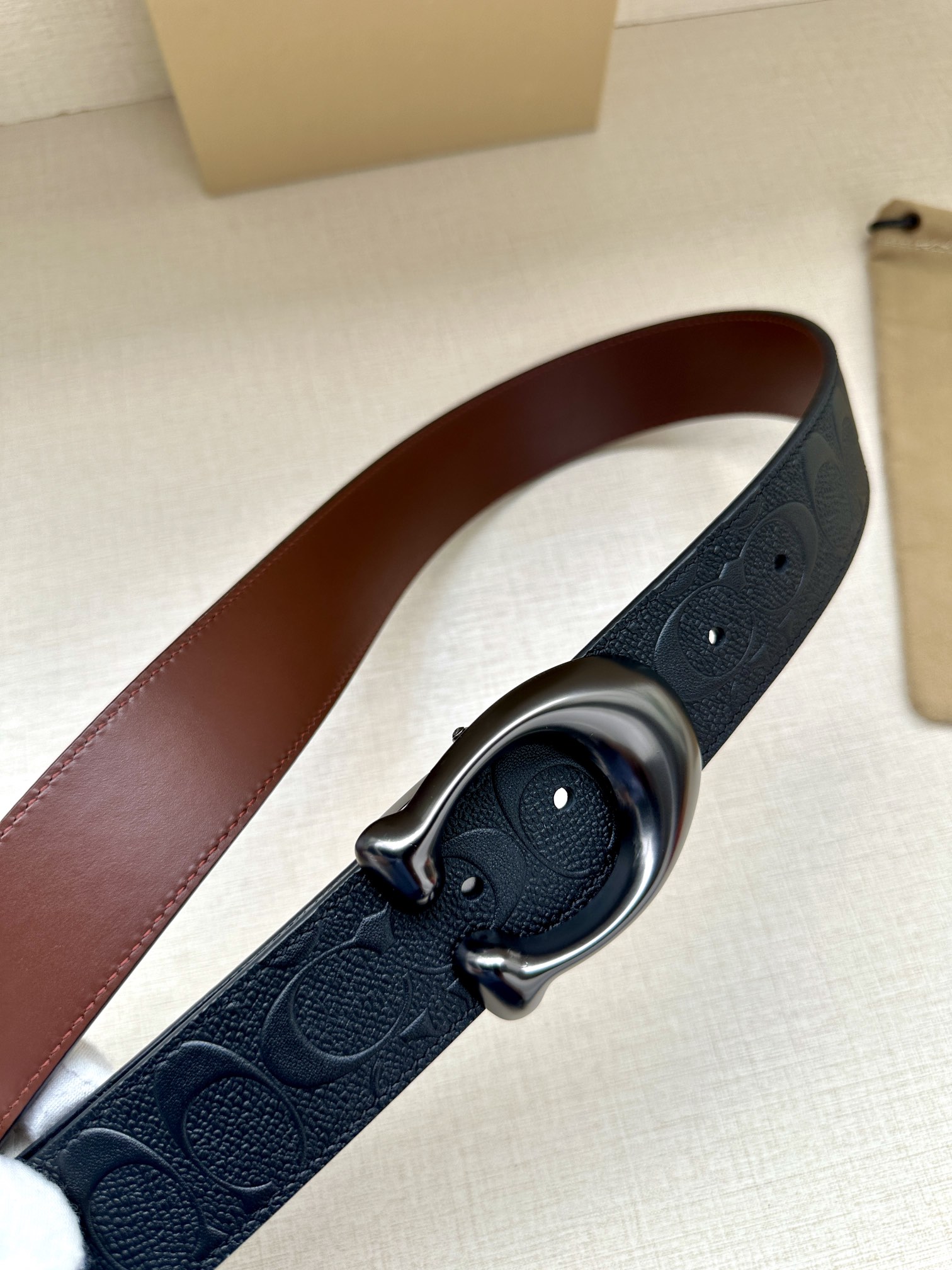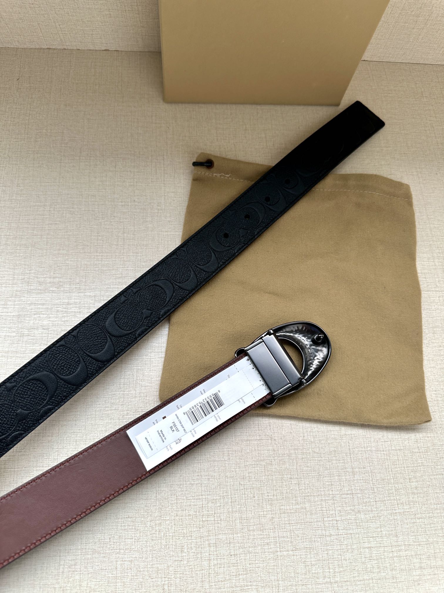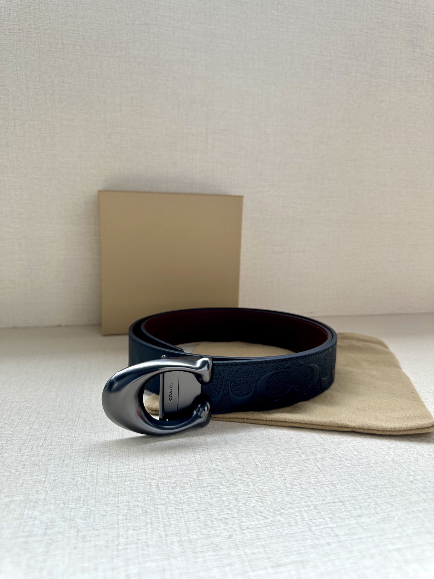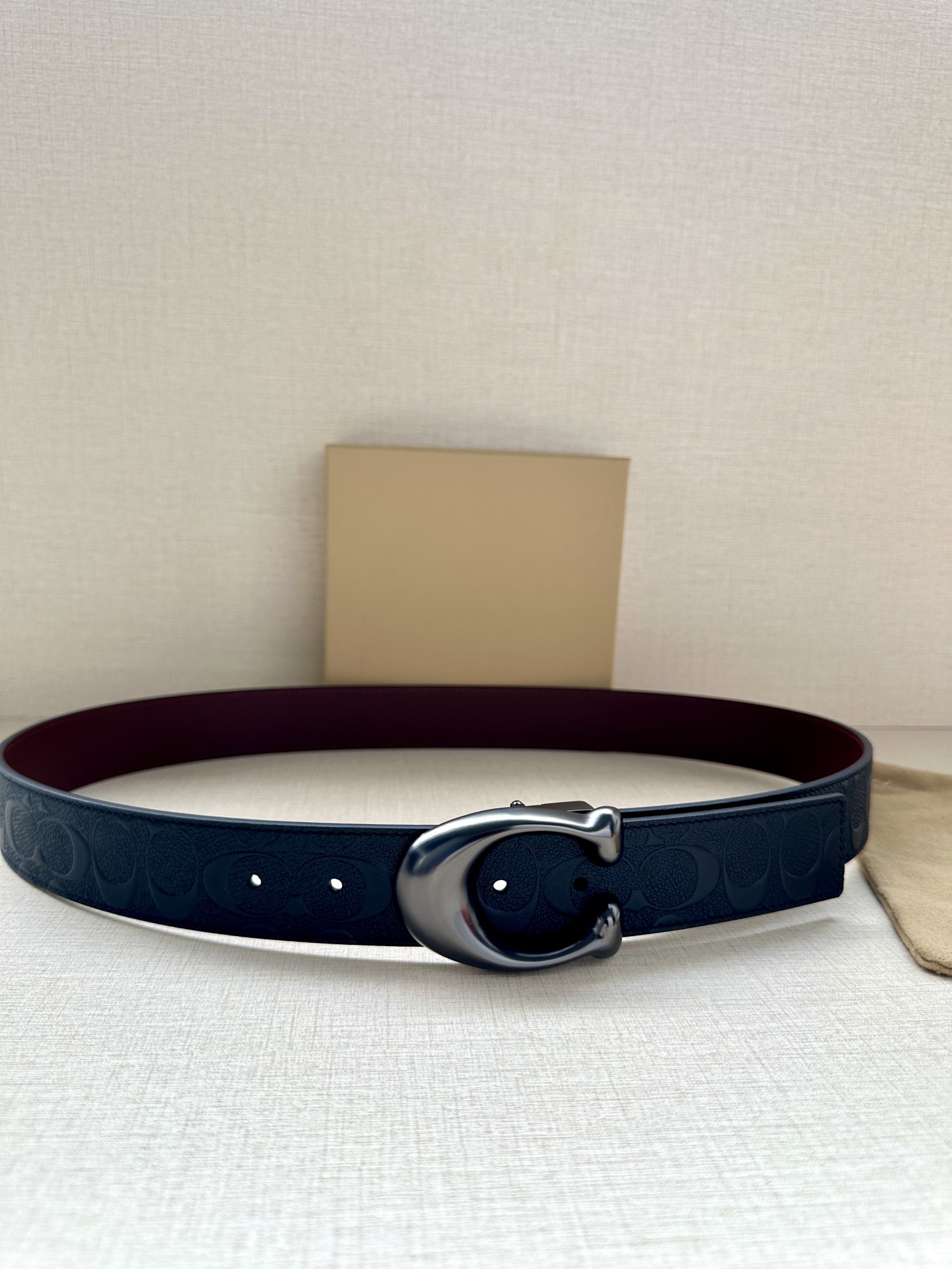 Width 3.8cm COACH This reversible double-sided belt features a classic patterned logo material on one side and refined leather material on the other, equipped with a signature buckle that combines two styles into one. With simple instructions, it can be cut with scissors for a perfect fit.