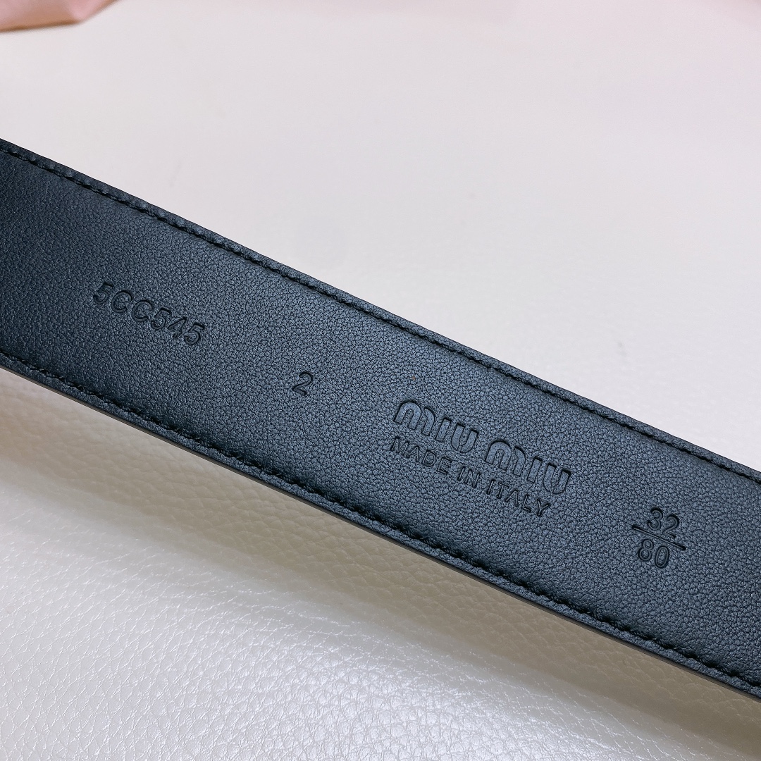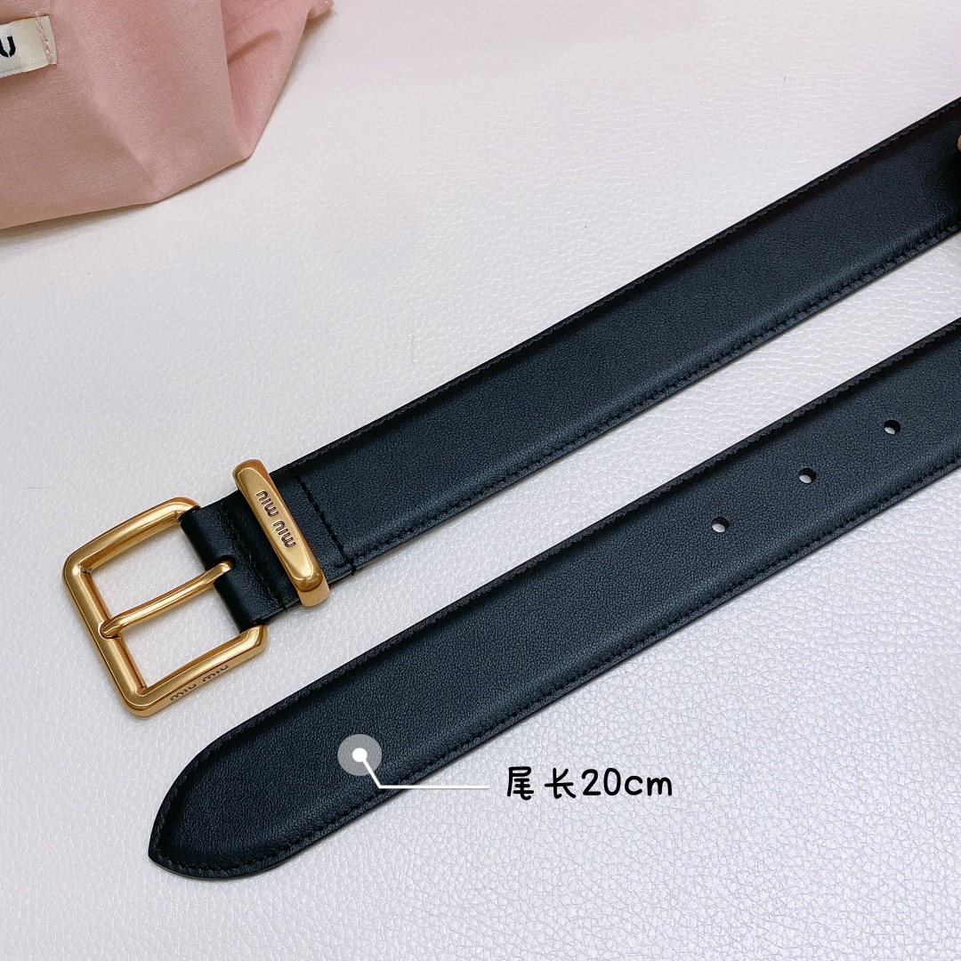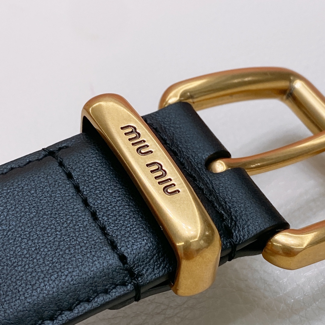 miumiu 23 metal buckle. The belt loop is adorned with a laser-engraved logo. This leather belt features a simple and elegant design, with the belt loop bearing the Miu Miu logo. Imported cowhide belt 3.5cm