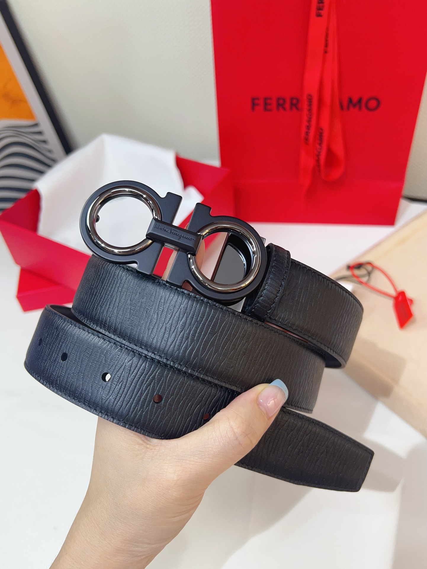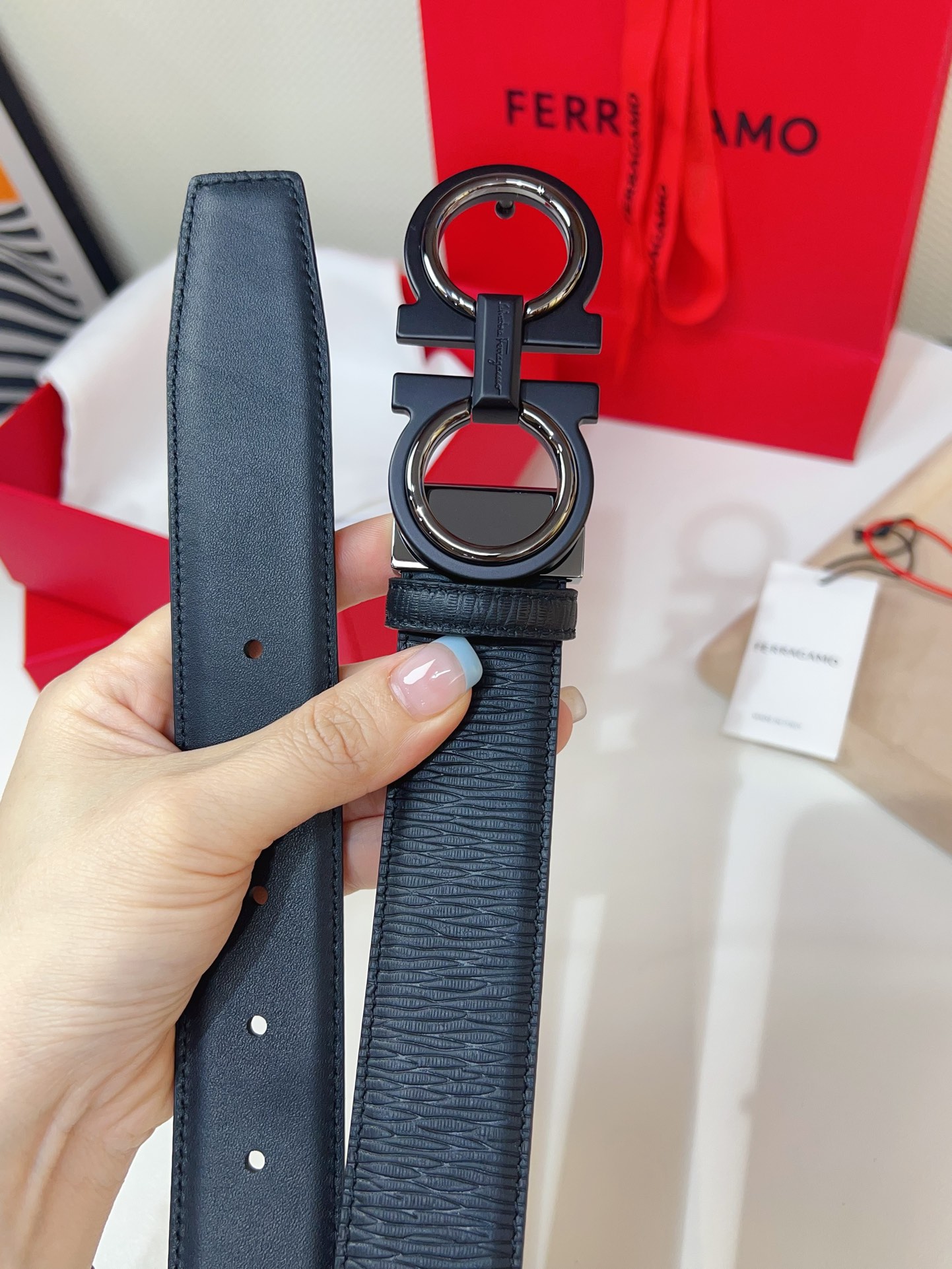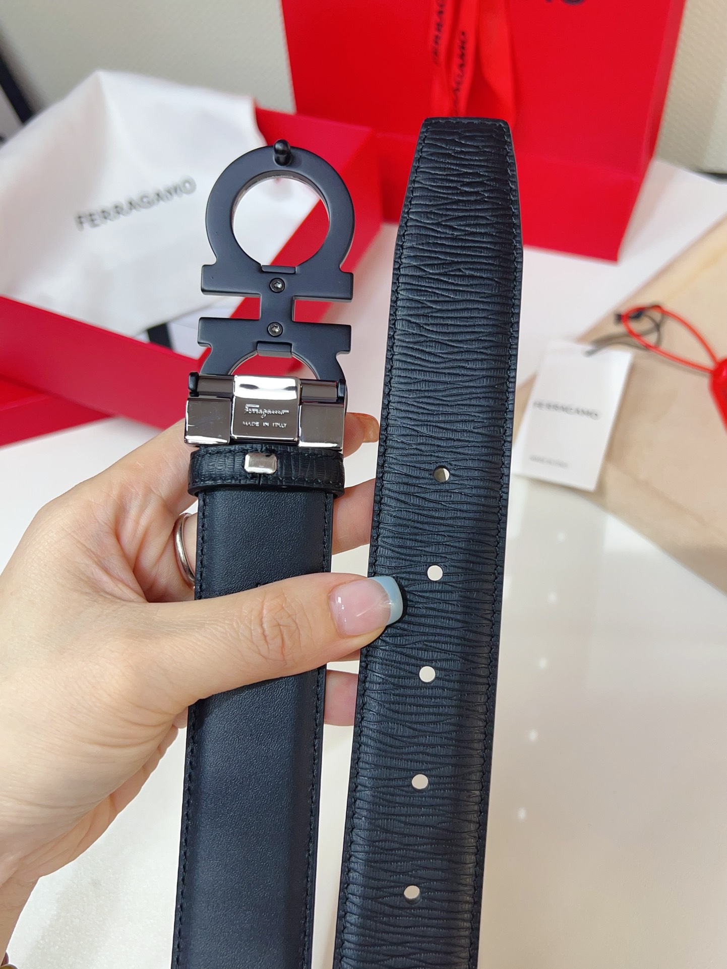 This double-sided belt is stylish and versatile, an indispensable men's accessory item. One side is made of hammered cowhide, while the other side is made of selected natural grained cowhide, adorned with a gold-finished Gancini buckle for an eye-catching touch. The interior features exquisite satin decorative details. The length is adjustable. The belt can be trimmed or additional eyelets can be added to create a tight or loose fit. 3.5 wide