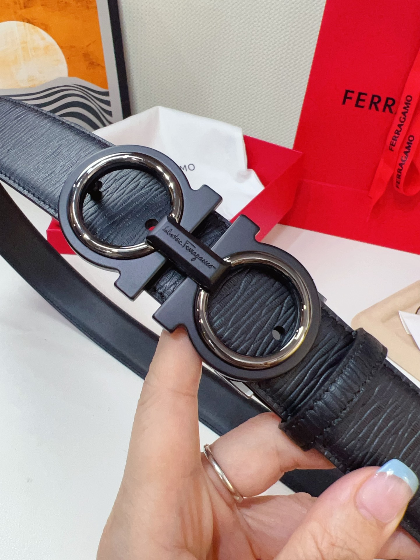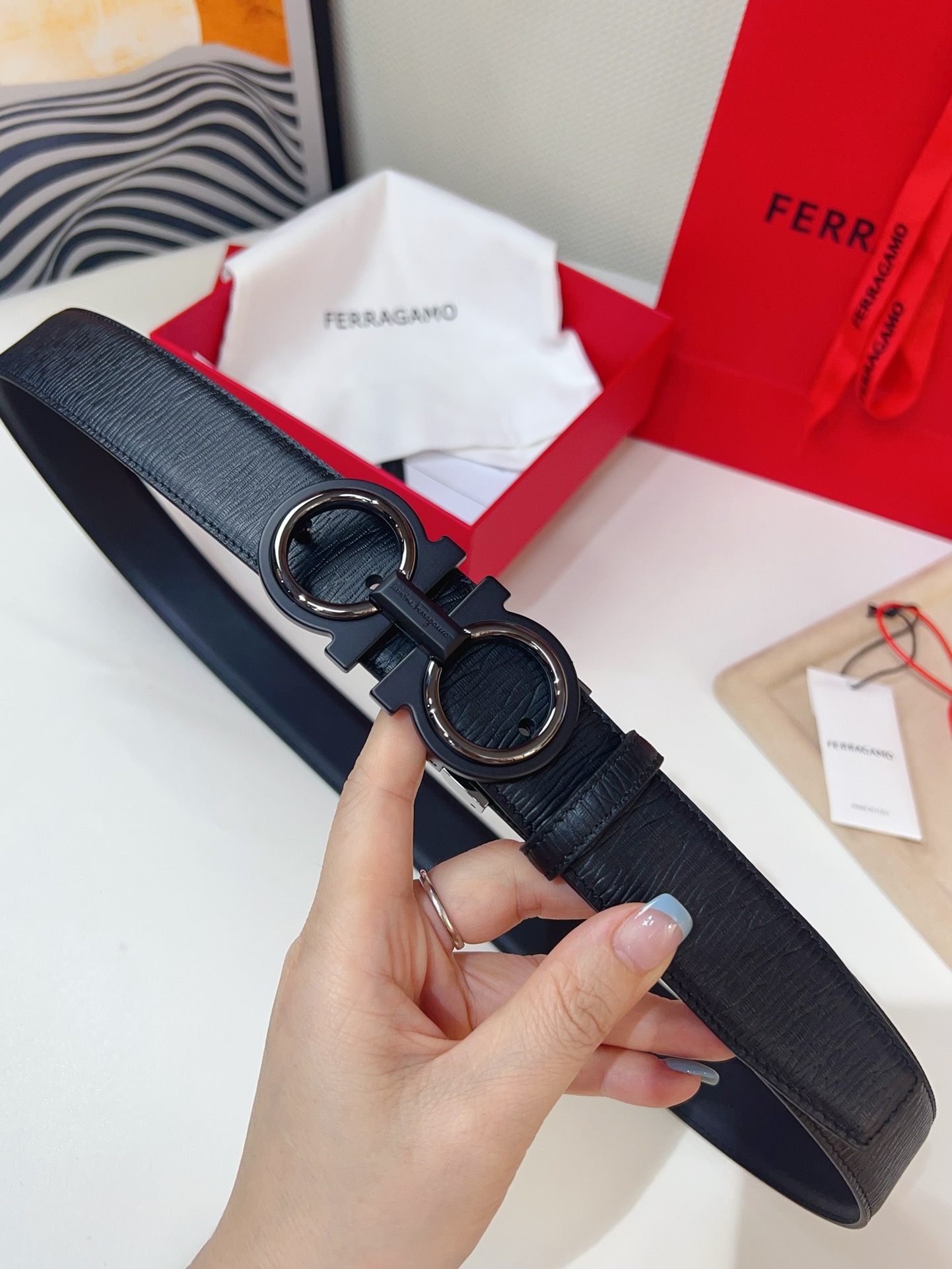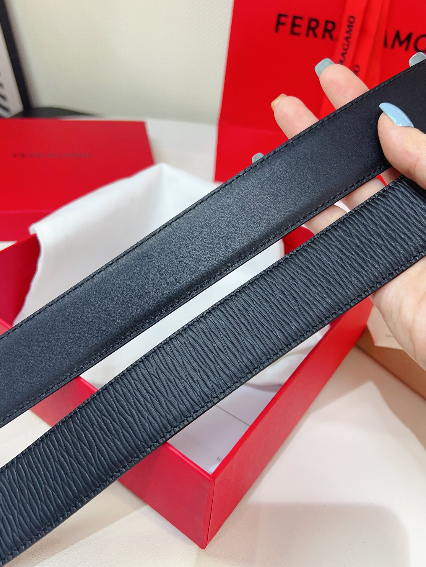 This double-sided belt is stylish and versatile, an indispensable men's accessory item. One side is made of hammered cowhide, while the other side is made of selected natural grained cowhide, adorned with a gold-finished Gancini buckle for an eye-catching touch. The interior features exquisite satin decorative details. The length is adjustable. The belt can be trimmed or additional eyelets can be added to create a tight or loose fit. 3.5 wide